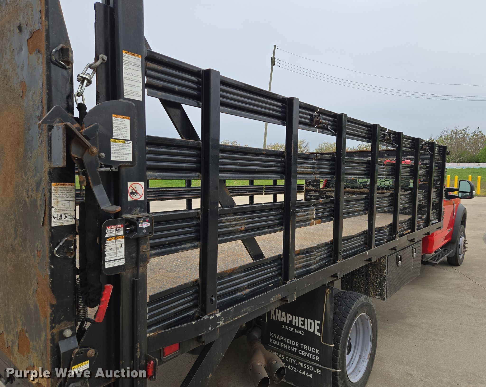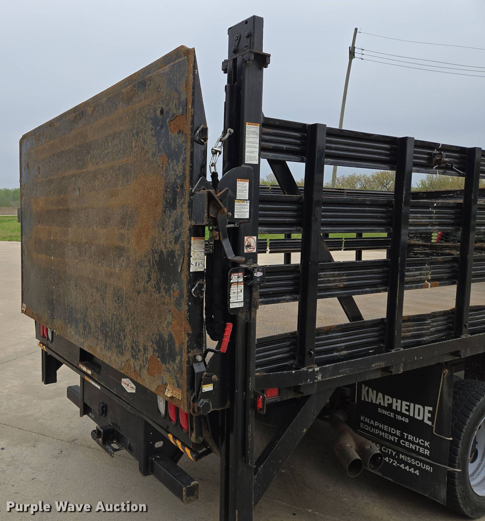 2019 Ford F550 Super Duty XL flatbed truck. Miles: 242,302 on odometer, VIN: 1FDUF5GT2KED96074. Engine Displacement: 6.7L, Cylinders: 8, Fuel type: Diesel. Transmission Automatic. Chassis Axles: Single, Suspension: Spring, Brakes: Hydraulic, GVWR: 19,500 lbs. Interior AC, Heat, Heated mirrors, Power windows, Power locks, Cruise control, Auxiliary controls. Features Knapheide flatbed Model: PHHJT-163B, 16' 7" L x 86" W x 40" H, End gate lift, Tommy Gate Co., Serial: 00645681, Stake sides. Tires Size: 225/70R19.5. Missouri title. Electrical Corporation Of America. Kansas City, KS 66115