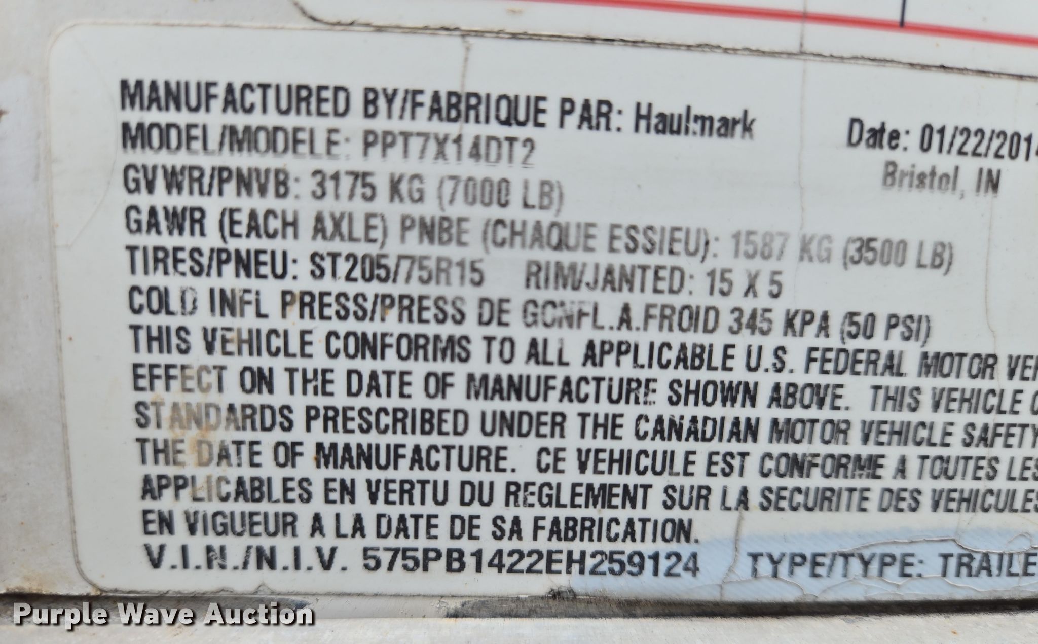 2014 Haulmark enclosed cargo trailer. VIN: 575PB1422EH259124. Dimensions Overall: 18' 5" L x 102" W, Body: 15' 8" L x 84" W. Features Deck type: Wood, E-track rail system. Chassis Ball hitch: 2 5/16", Landing gear: Single, Suspension: Spring, Brakes: Electric, Axles: Tandem, GVWR: 7,000 lbs. Tires Steel wheels, Size: 225/75R15. Notes Contents not included, Front axle damage, Tires missing. Kansas title. Title distribution may be delayed up to 14 days from verification of funds. TFM Services LLC. Wichita, KS 67203