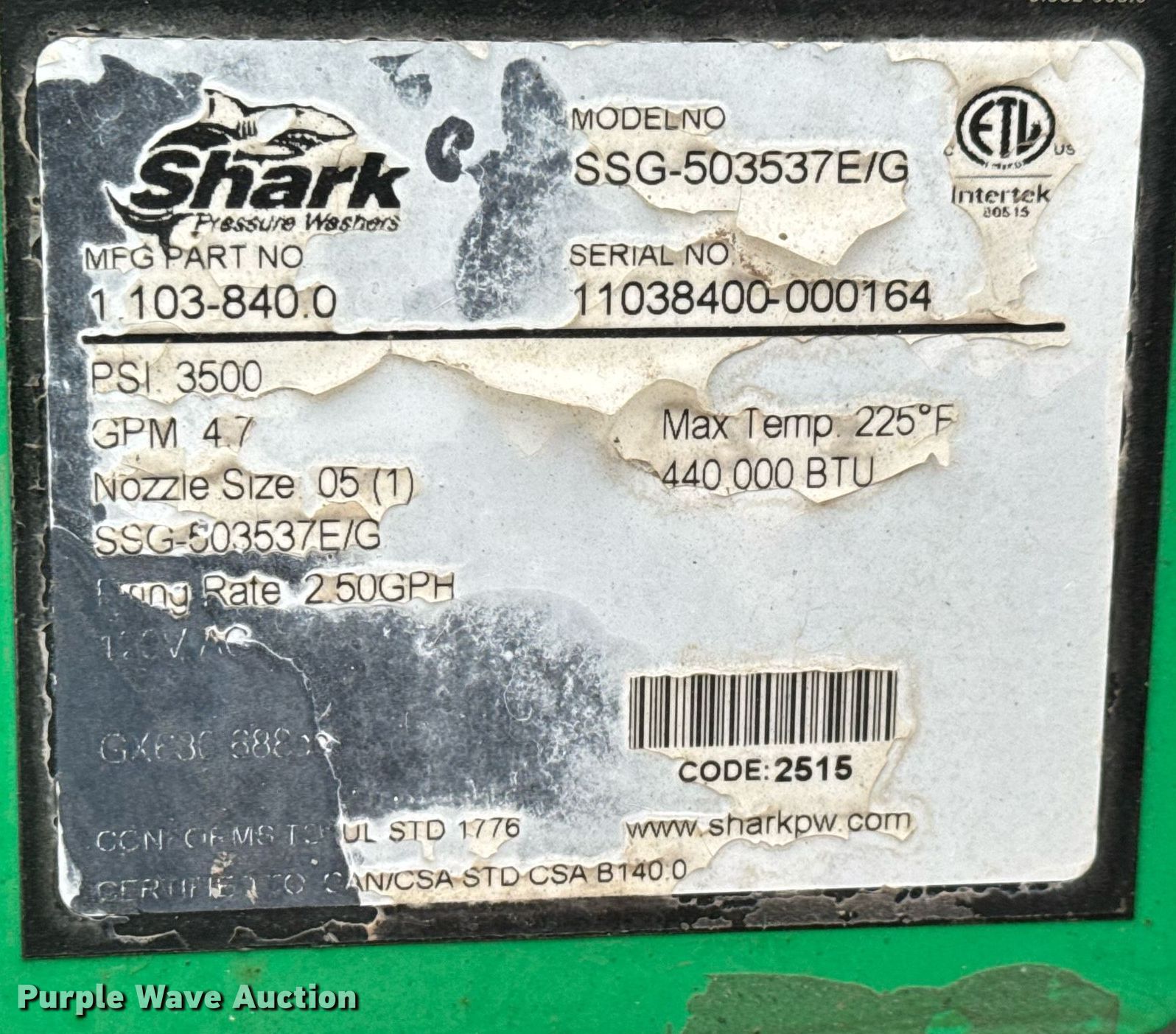 Shark SSG-503537E/G hot pressure washer trailer has sold in Mulvane, Kansas for $4400. Item EQ1351 sold on May 21st, 2025.