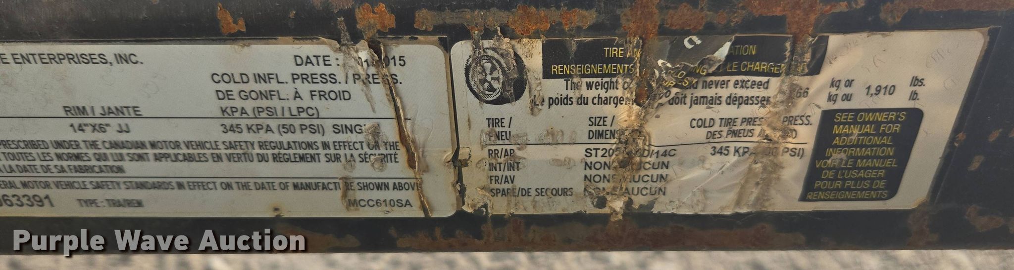 2015 Mirage Trailer enclosed cargo trailer. VIN: 5M3BE1018F1063391. Dimensions Overall: 14' L x 92" W, Body: 11' L x 72" W. Features Deck type: Wood. Chassis Ball hitch: 2", Landing gear: Single, Suspension: Spring, GVWR: 2,990 lbs. Tires Steel wheels, Size: 205/75R14. Transfer of ownership documentation will be a bill of sale. Wilbert Funeral Services. Meridian, ID 83642