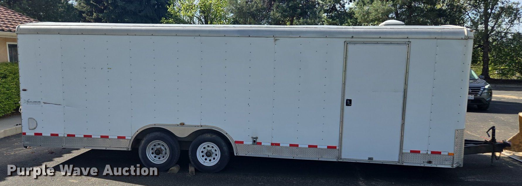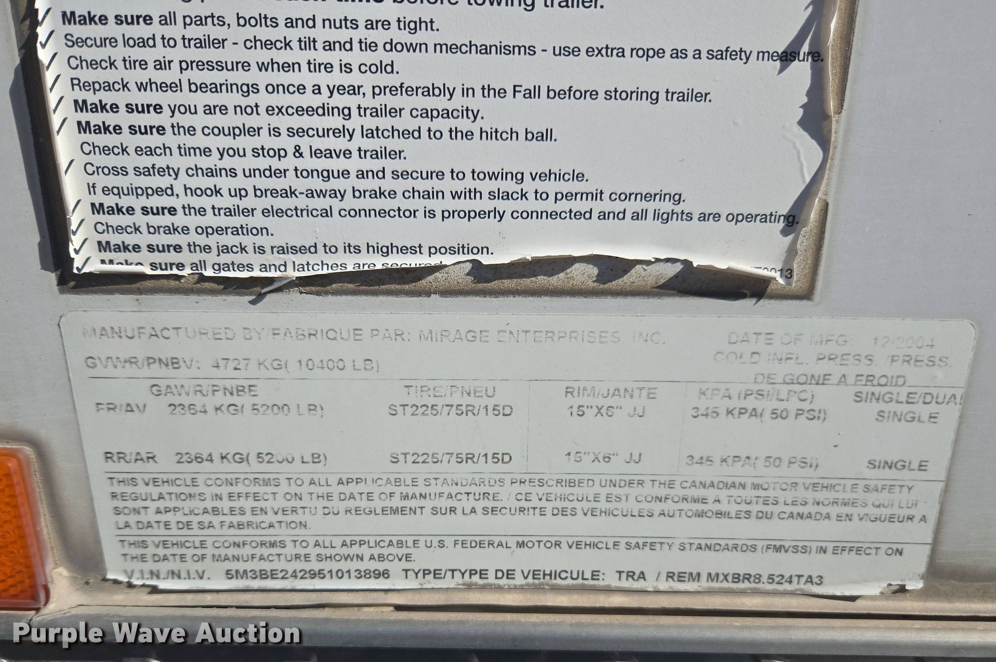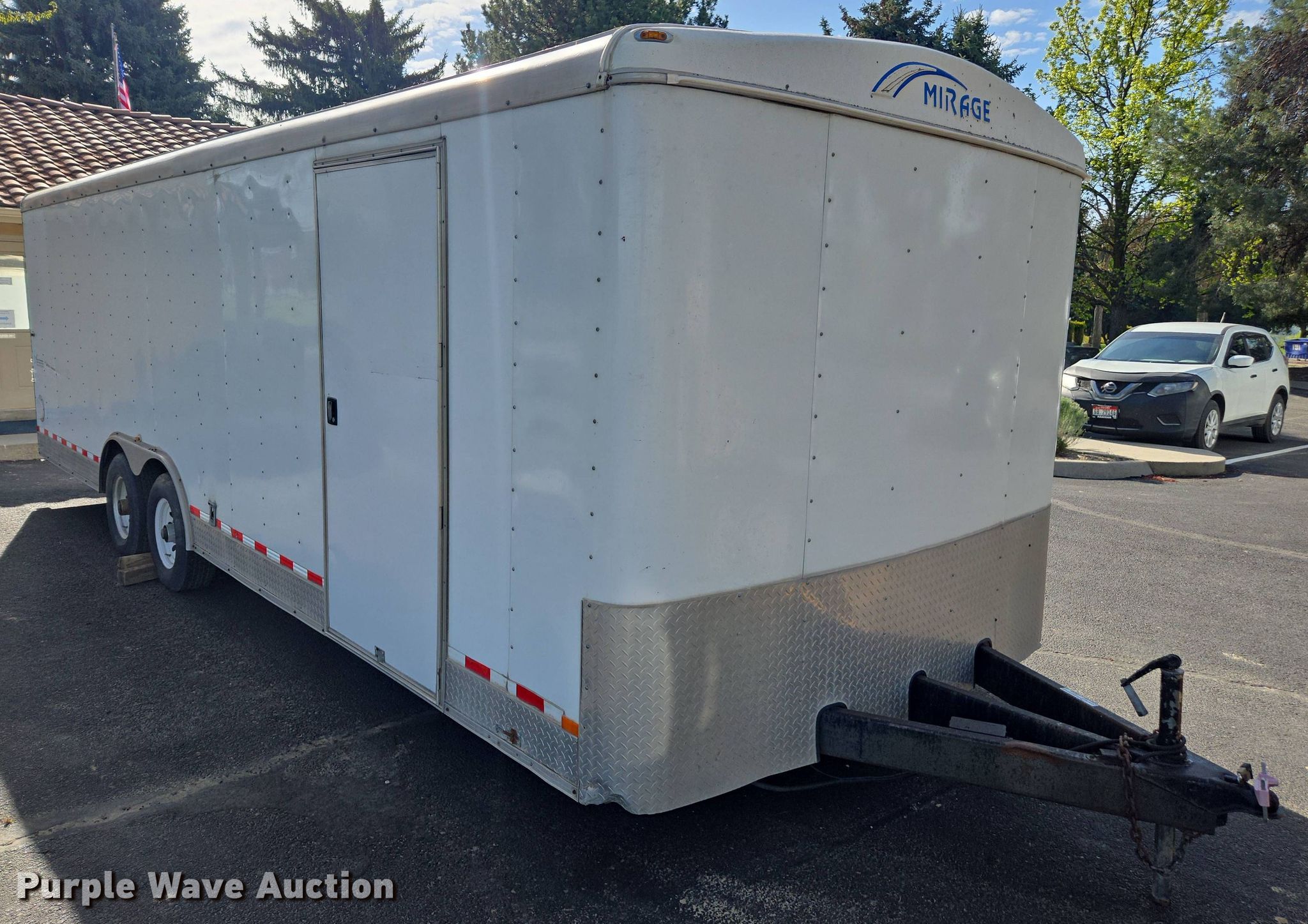 2005 Mirage Trailer enclosed cargo trailer. VIN: 5M3BE242951013896. Dimensions Overall: 27' 6" L x 102" W, Body: 24' L x 100" W, Rear door / ramp 84" L x 87" W. Features Deck type: Wood. Chassis Ball hitch: 2 5/16", Landing gear: Single, Suspension: Torsion, Brakes: Electric, Axles: Tandem, GVWR: 10,400 lbs. Tires Steel wheels, Size: 225/75R15. Notes Contents not included. Idaho title. Title distribution may be delayed up to 30 days from verification of funds. Wilbert Funeral Services. Boise, ID 83714
