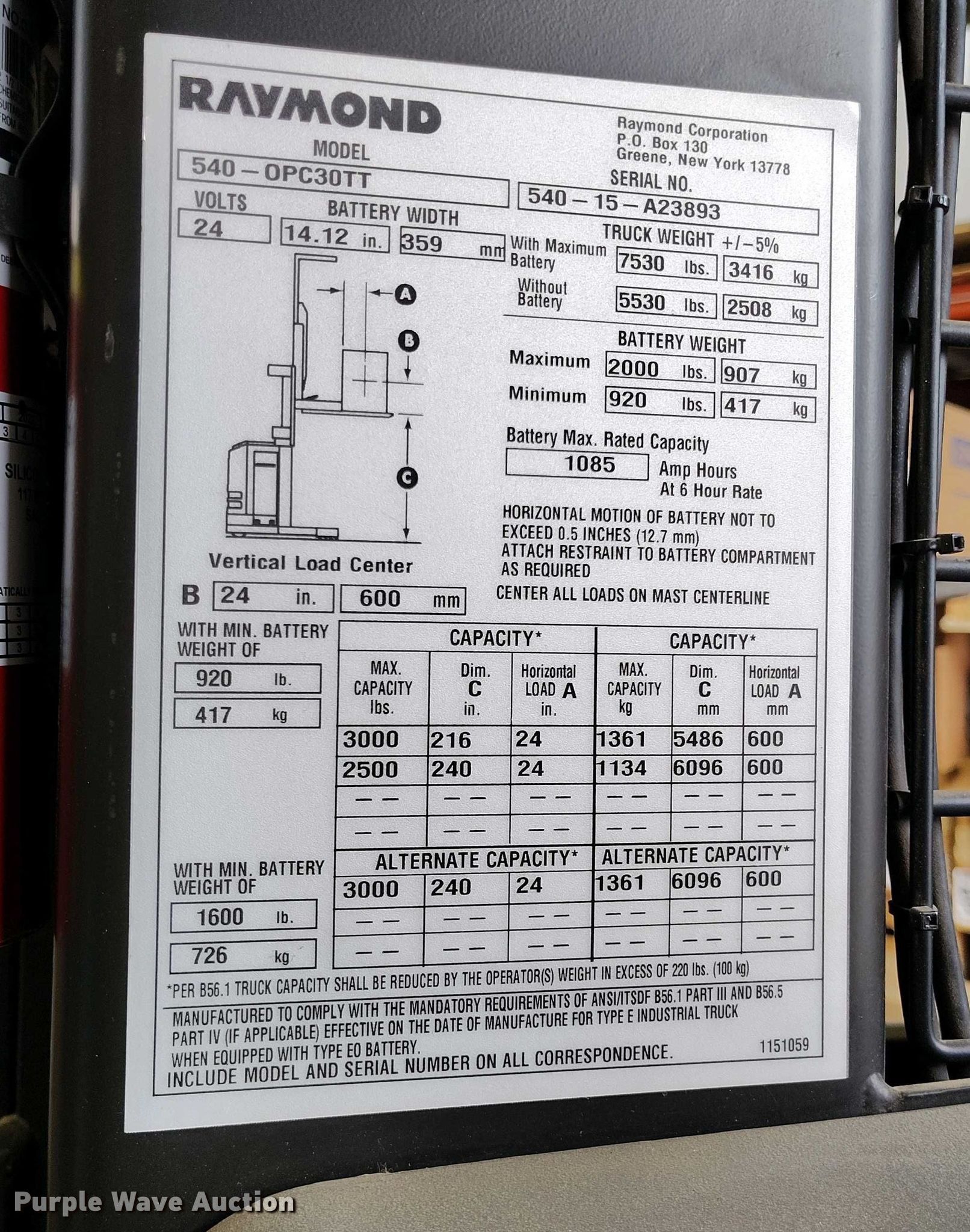 Take a look at this used Raymond 540-OPC30TT order picker being sold on May 21st, 2025 in the SOLD! May 21 Vehicles and Equipment Auction made by Raymond. Take a look at all of the item information below or take a look at similar auctions for Warehouse Forklift.