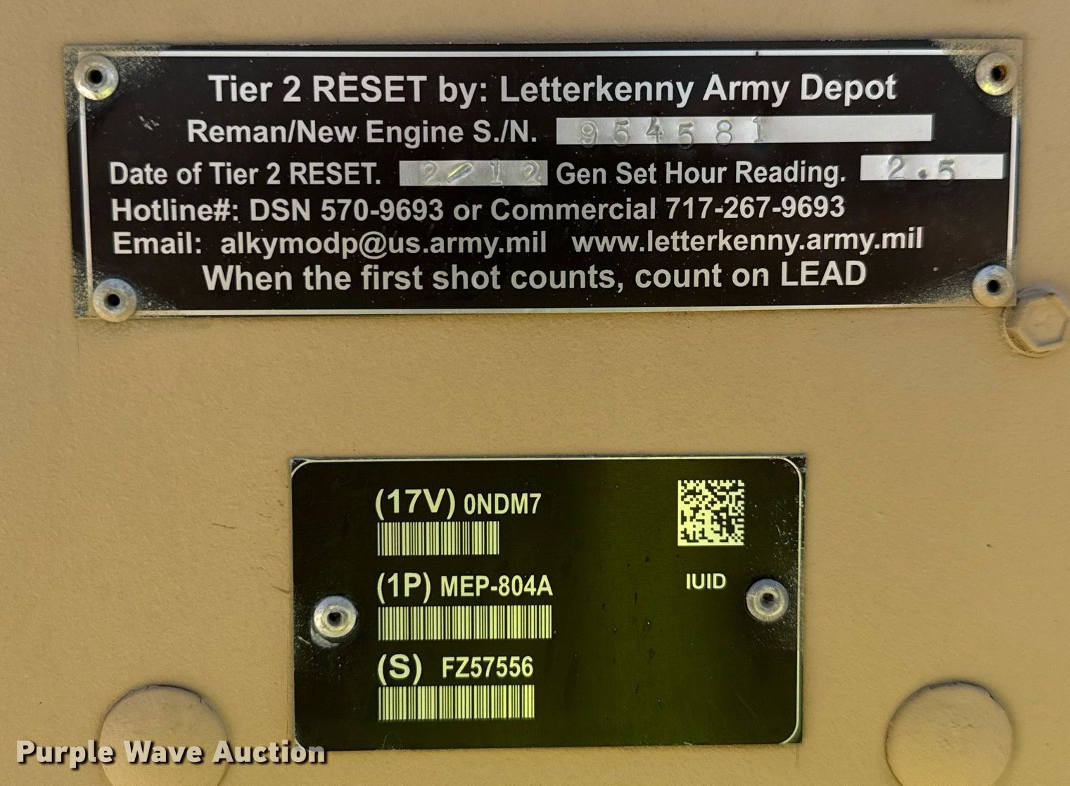 1997 Fermont DIV MEP-804A generator. Hours: 312 on meter, VIN: FZ 57556, Lot #:45867435. Engine Serial: 954581, Cylinders: 4, Fuel type: Diesel. Features Generator Military design 88-21005, kVA: 18.7, kW: 15, Phase: Three, Electric start, Fuel tank, Stabilizers. Trailer Ball hitch size: 2 5/16", Suspension: Spring, Brakes: Electric, Axles: Single, Tire size: 9.00-20. Notes Batteries missing, Unknown operating condition. Stored at a secured facility. Please review REQUIRED REMOVAL INSTRUCTIONS. This is worksite support equipment and will not come with a title. Transfer of ownership documentation will be a bill of sale. 10175 U.S. 17. Arcadia, FL 34269