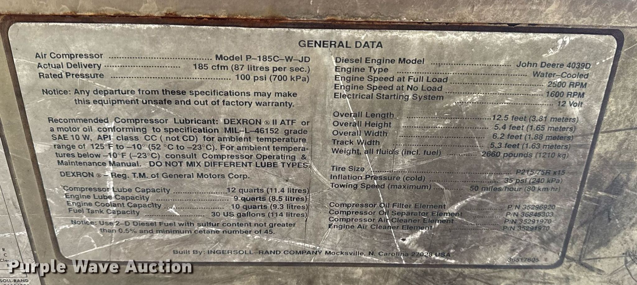Ingersoll Rand P185 air compressor. Hours: 2,206 on meter, Serial: 209836 U 329. Engine John Deere 4029DF, Serial: CD4039D107696, Cylinders: 4, Fuel type: Diesel. Features Air compressor CFM: 185, PSI: 125. Trailer 11' L x 68" W, Ball hitch size: 2", Suspension: Spring, Axles: Single, Tire size: ST205/75R15. Transfer of ownership documentation will be a bill of sale. Flint Equipment LLC. Drumright, OK 74030