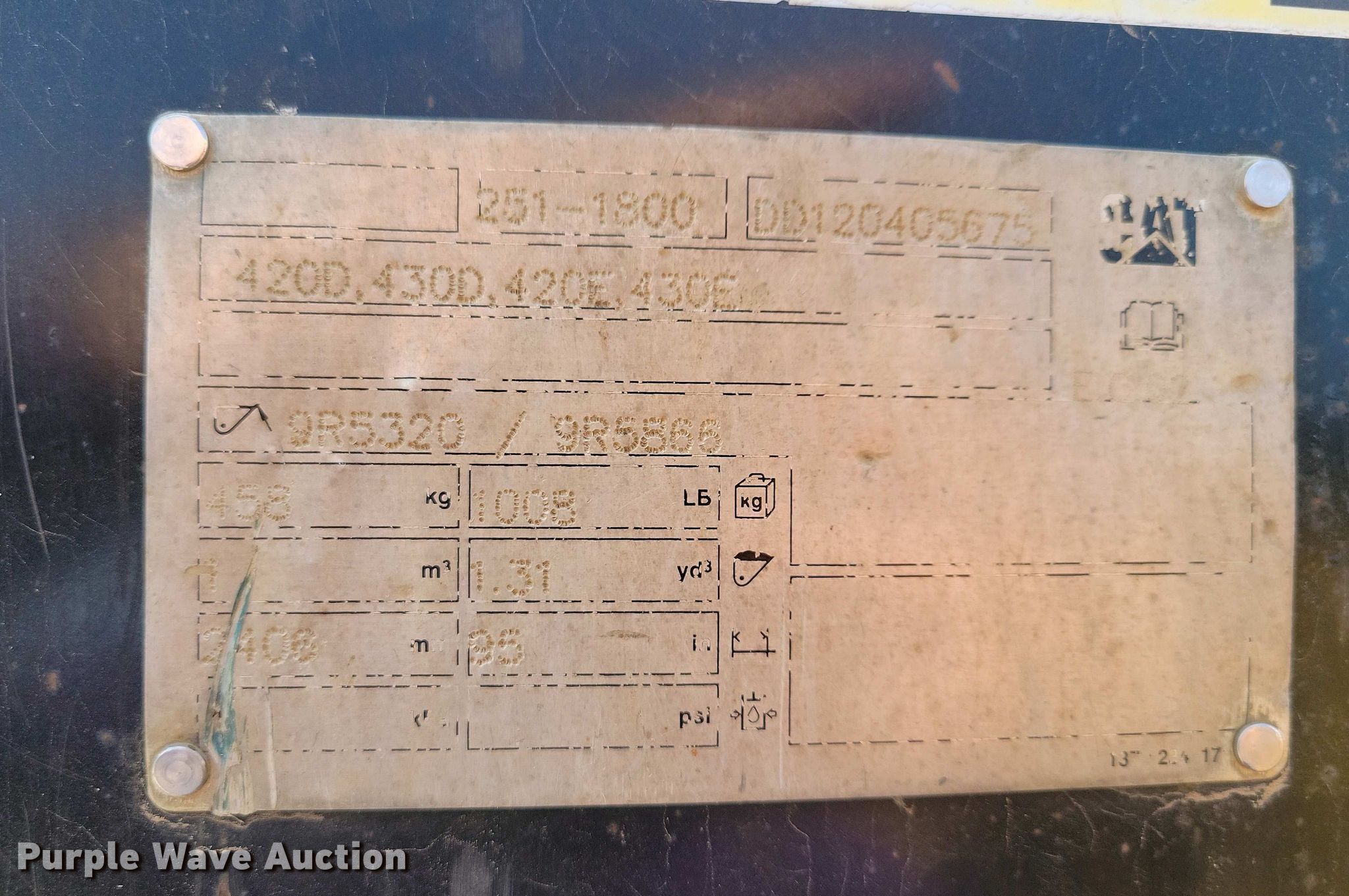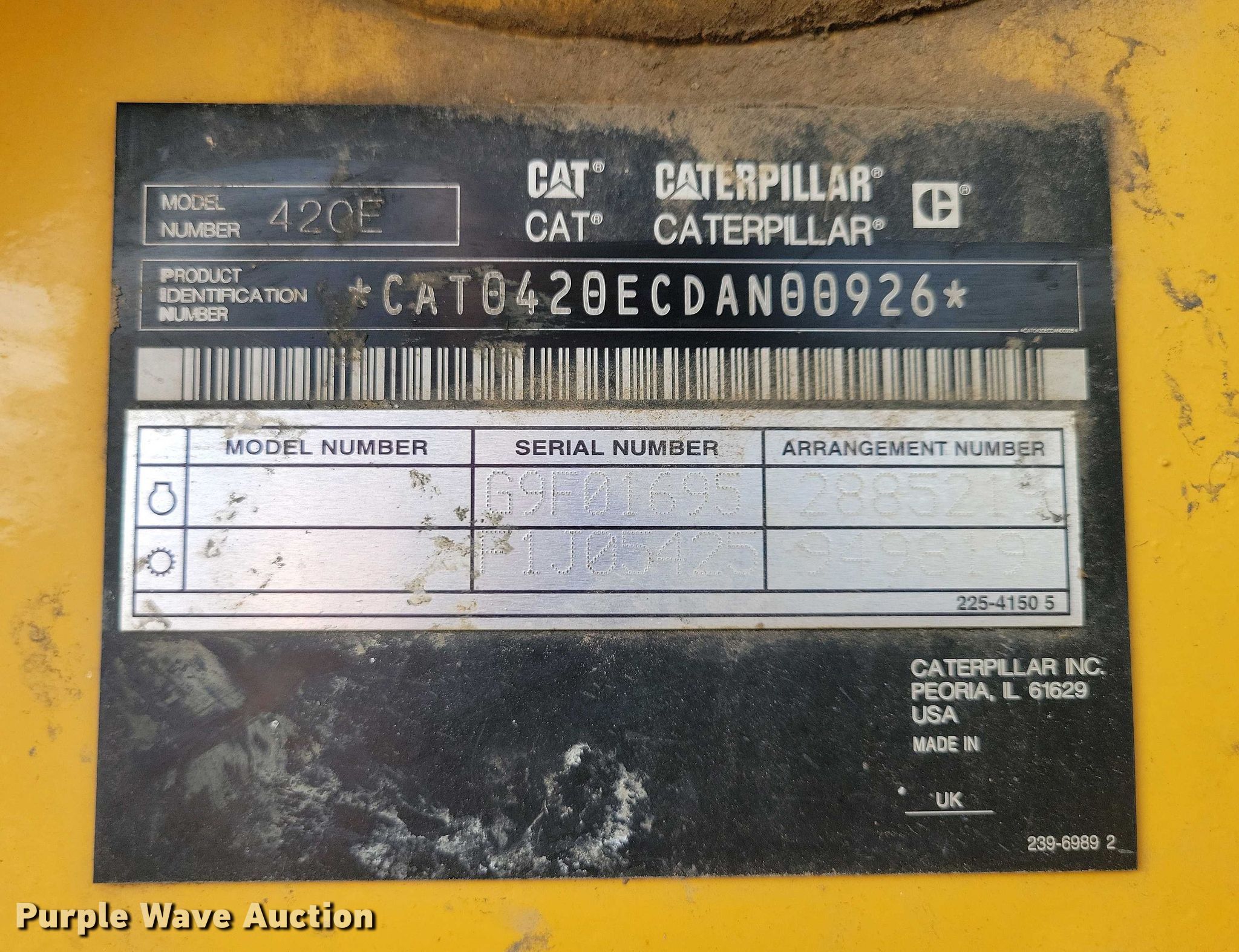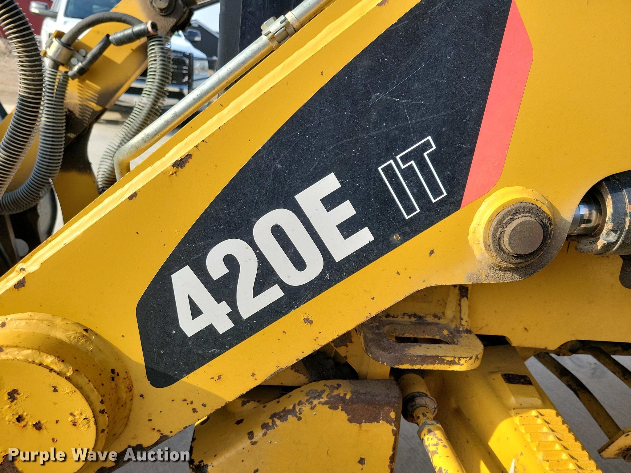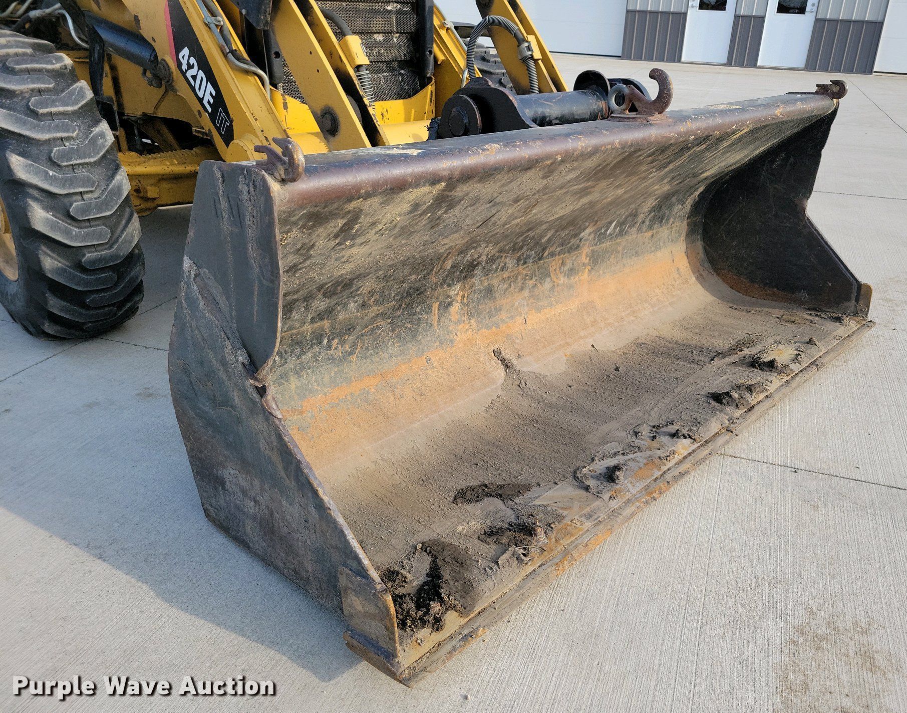 2011 Caterpillar 420E IT backhoe. Hours: 6,983 on meter, Serial: CAT0420ECDAN00926. Engine Caterpillar, Displacement: 4.4L, Cylinders: 4, Fuel type: Diesel, HP: 93. Transmission Powershift, 4F - 4R. Chassis Differential lock. Operators station Enclosed cab, AC, Heat, Backhoe controls: Pilot control, Pattern changer. Features Loader IT Carrier, Quick coupler: Hydraulic, Auxiliary hydraulics, Bucket Caterpillar, Capacity: 1.31 cu.yd., Width: 95", Cutting edge: Bolt-on, Backhoe Extendable stick, Auxiliary hydraulics, Bucket Caterpillar, Width: 24", Teeth: 4.. Tires Front: 12.5/80-18, Rear: 21L-24. Notes Glass cracked. Larson Digging. Milbank, SD 57252