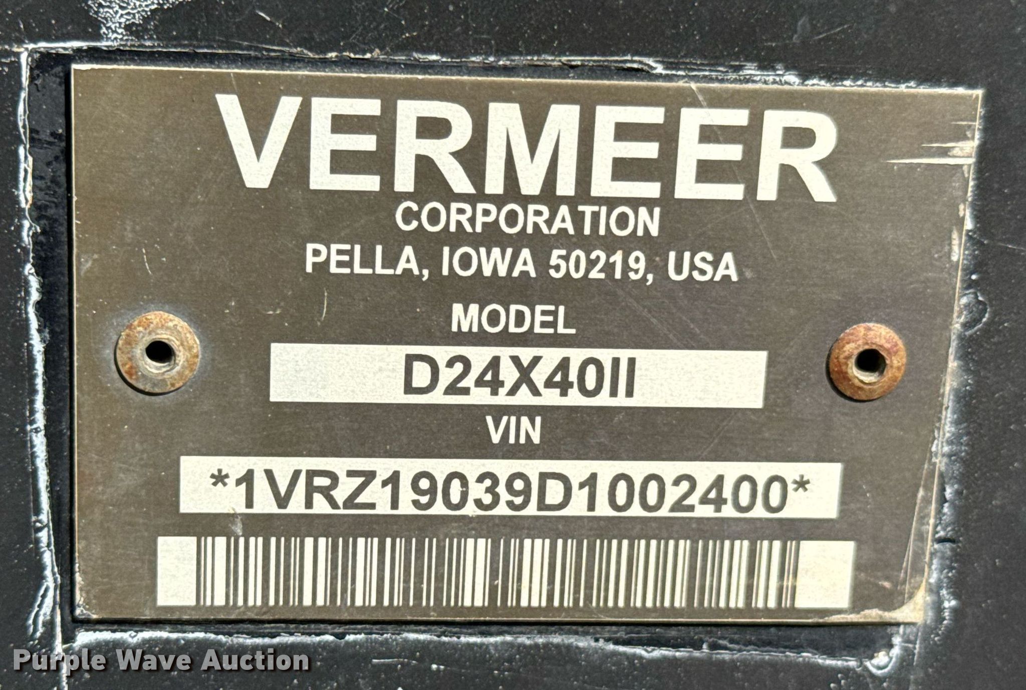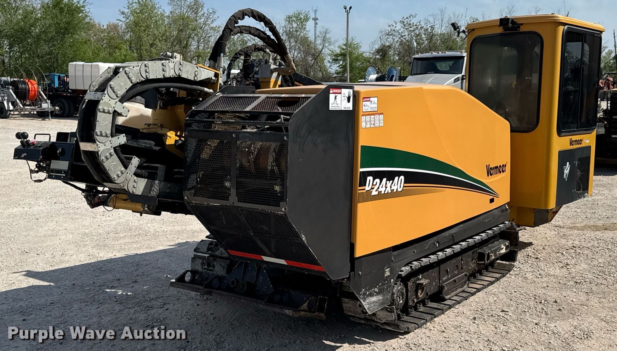 2013 Vermeer D24X40 II directional boring unit. Hours: 5,393 on meter, Serial: 1VRZ19039D1002400. Engine John Deere, Cylinders: 4, Fuel type: Diesel. Operators station Enclosed cab, AC, Heat. Features Ground drive remote: Tethered, Water pump, Drill stems On drill: 49, Drill stem length: 10' Diameter: 2.5", Auto rod loader, Rear hydraulic stabilizers, Hydraulic stake down. Tracks Width: 16", Rubber. Big M Ranch Inc. Rogers, AR 72756