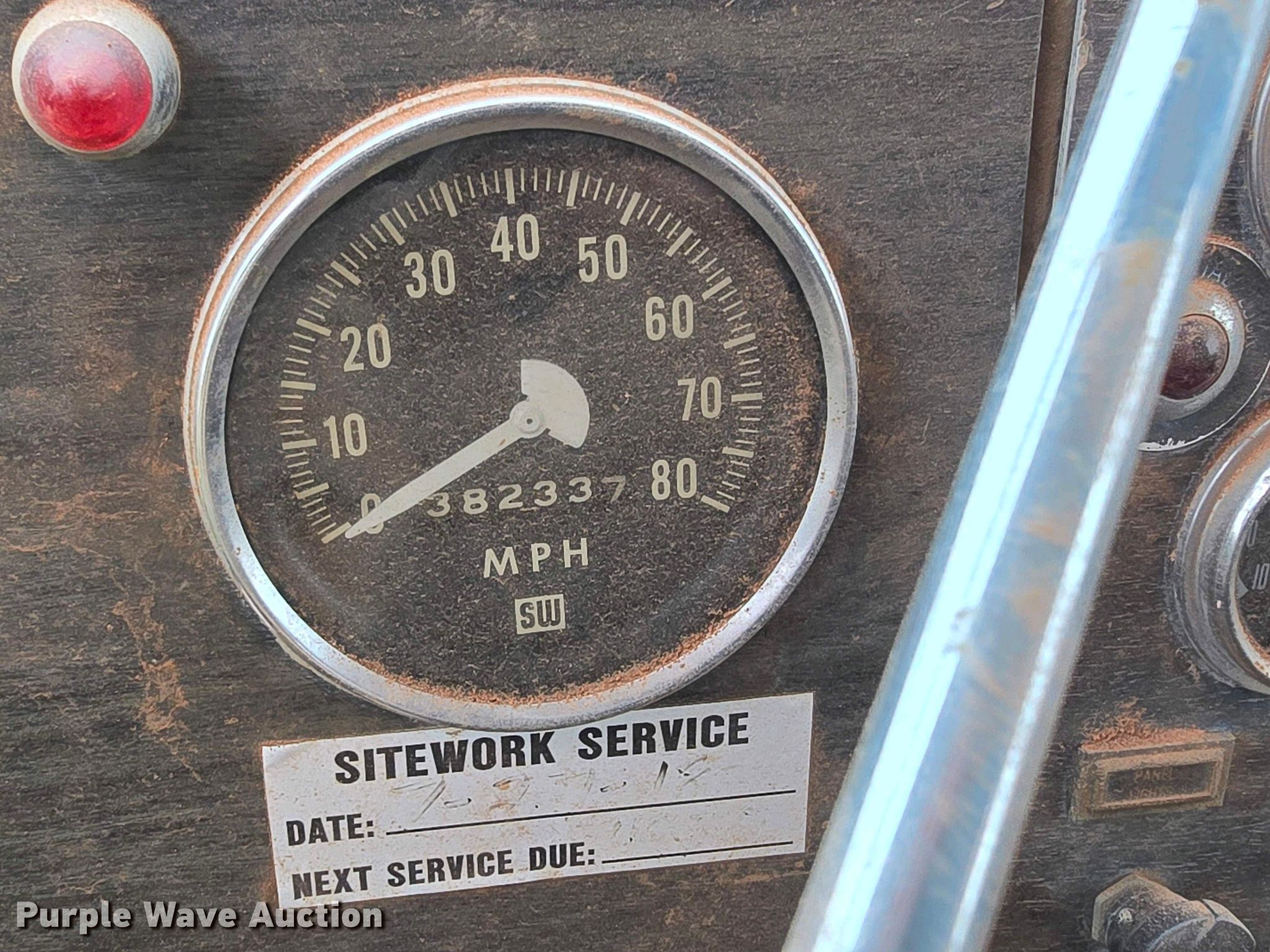 1979 Kenworth W900 water truck. Miles: 382,337 on odometer, Hours: 8,921 on meter, VIN: 174217S. Engine Cylinders: 6, Fuel type: Diesel, Engine brake. Transmission Manual, Speed: 10. Chassis Axles: Triple, Pusher axle, Suspension: Spring over walking beam, Brakes: Air, PTO, GVWR: 49,000 lbs. Interior Heat. Features Bed / tank Capacity: 4,000 gallons, 17' 5" L x 91" W, Spray bar: Rear, Rear outlet: 3". Tires Size: 11R24.5, Lift axle: 295/75R22.5. Notes Driver side fender damaged. South Dakota title. Site Work Specialists. Rapid City, SD 57702