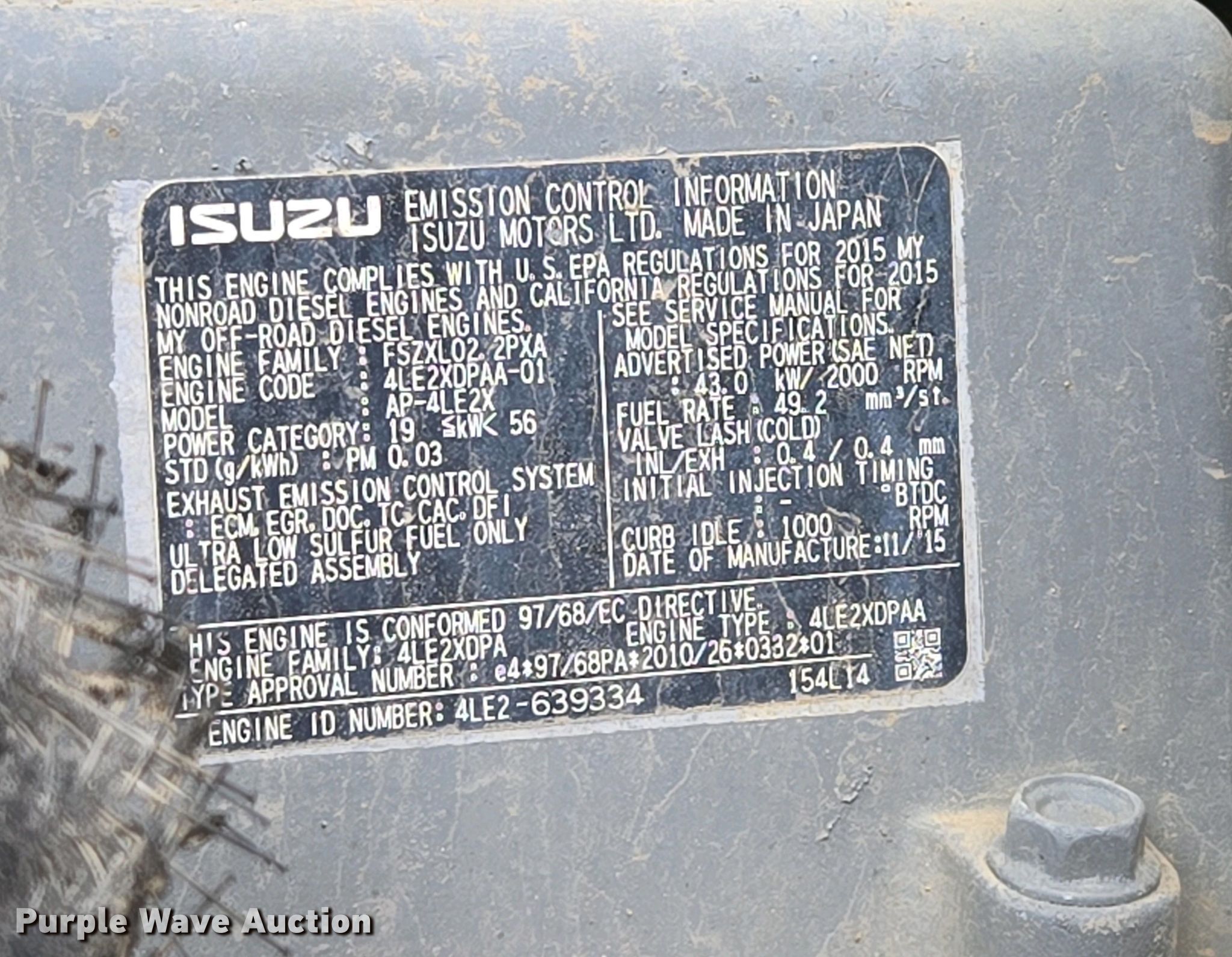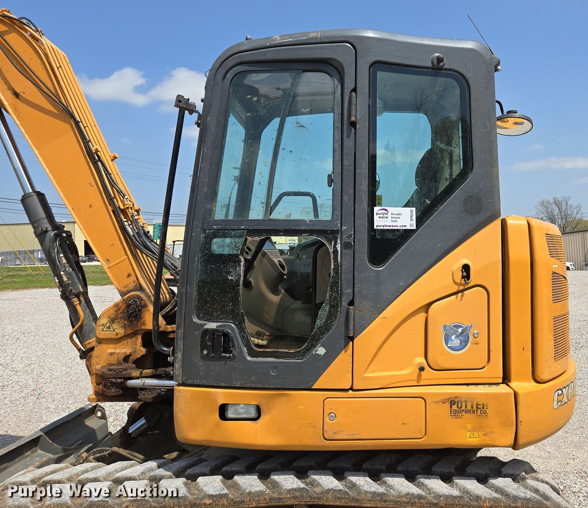2016 Case CX80C mini excavator. Hours: 3,744 on meter, Serial: DCH080R6NGE6B1555. Engine Isuzu AP-4LE2X, Serial: 4LE2-639334, Cylinders: 4, Fuel type: Diesel, kW: 43. Transmission Hydrostatic, Two speed travel. Operators station Enclosed cab, AC, Heat, Backup camera. Features Auxiliary hydraulics, Counter weights, Backfill blade Width: 92", Boom Swing, Stick Stick length: 86", Bucket Width: 24", Teeth: 5. Tracks Width: 17.5", Rubber. Notes Door issues Lower glass missing, Non-operational latch, Glass cracked, Non-operational backup camera, Left side cover issues, locked. Potter Equipment Copany. Harrison, AR 72601