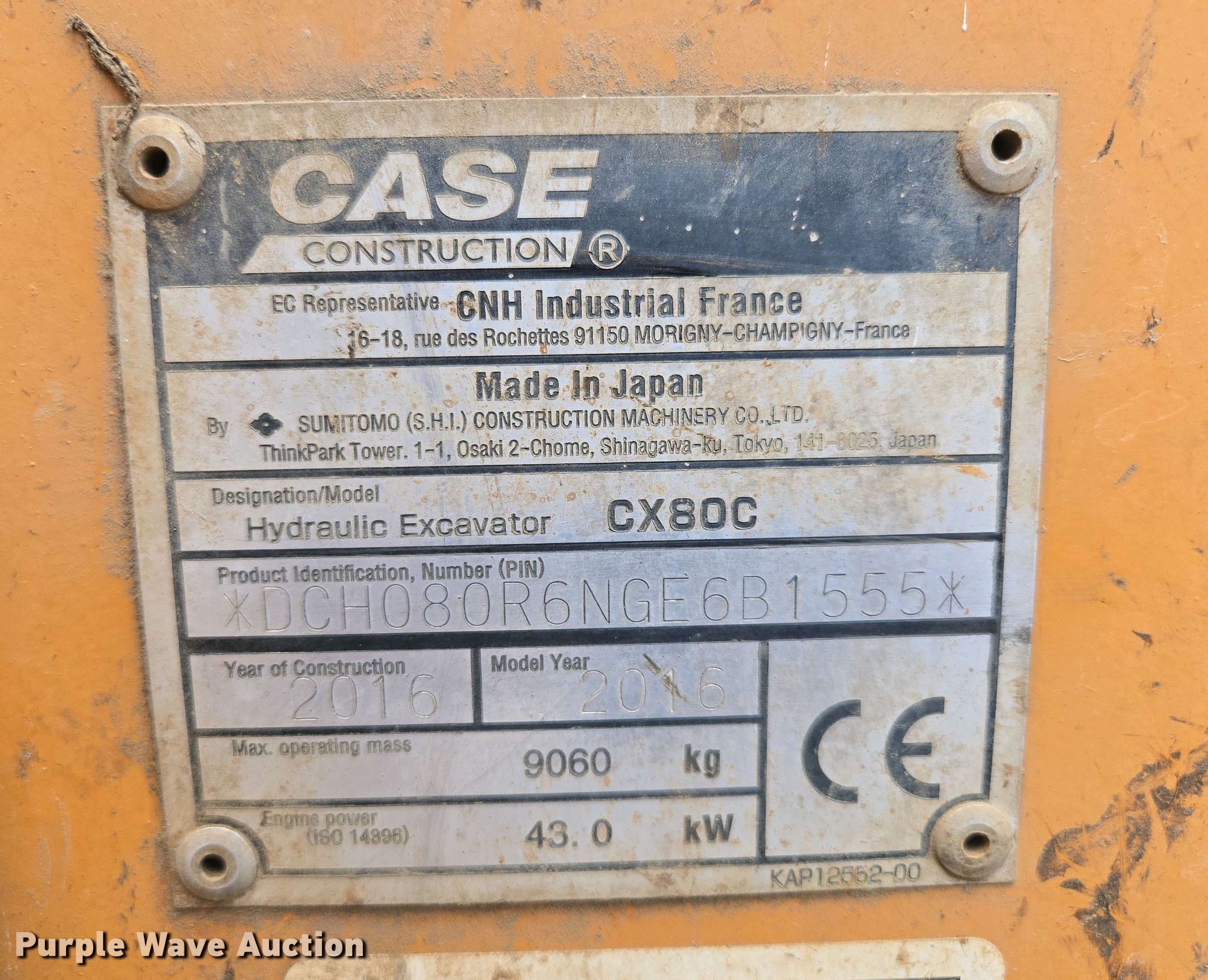 Purple Wave is selling a used Mini Excavator in Arkansas. This item is a 2016 Case CX80C mini excavator with the following: Hours: 3,744 on meter, Serial: DCH080R6NGE6B1555