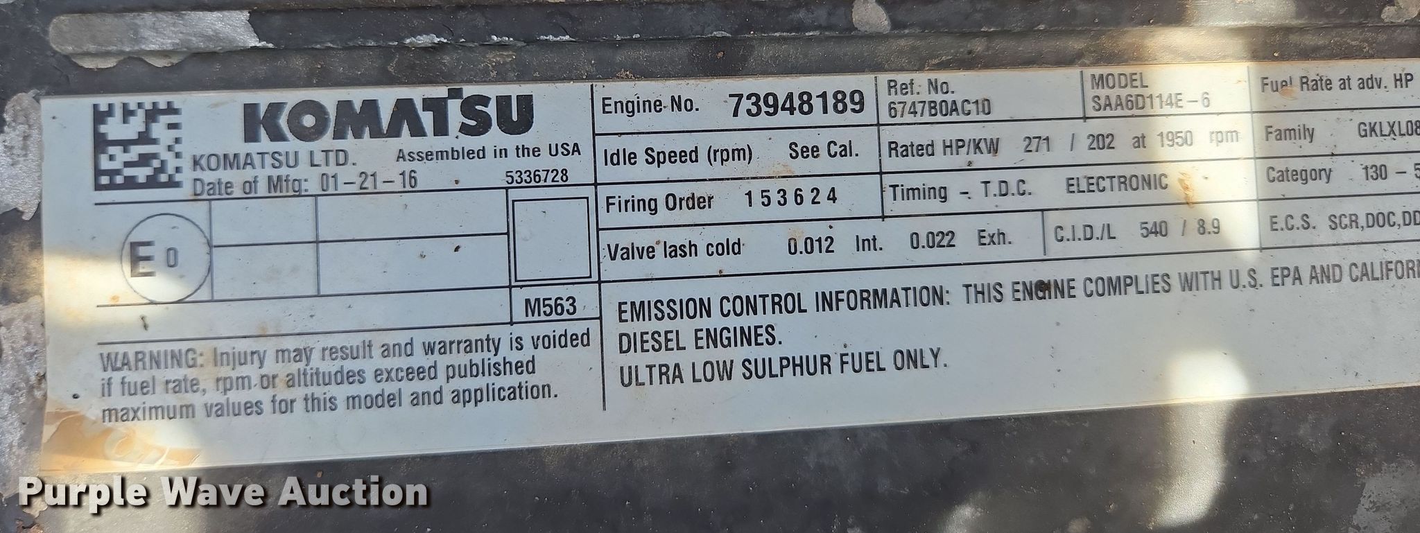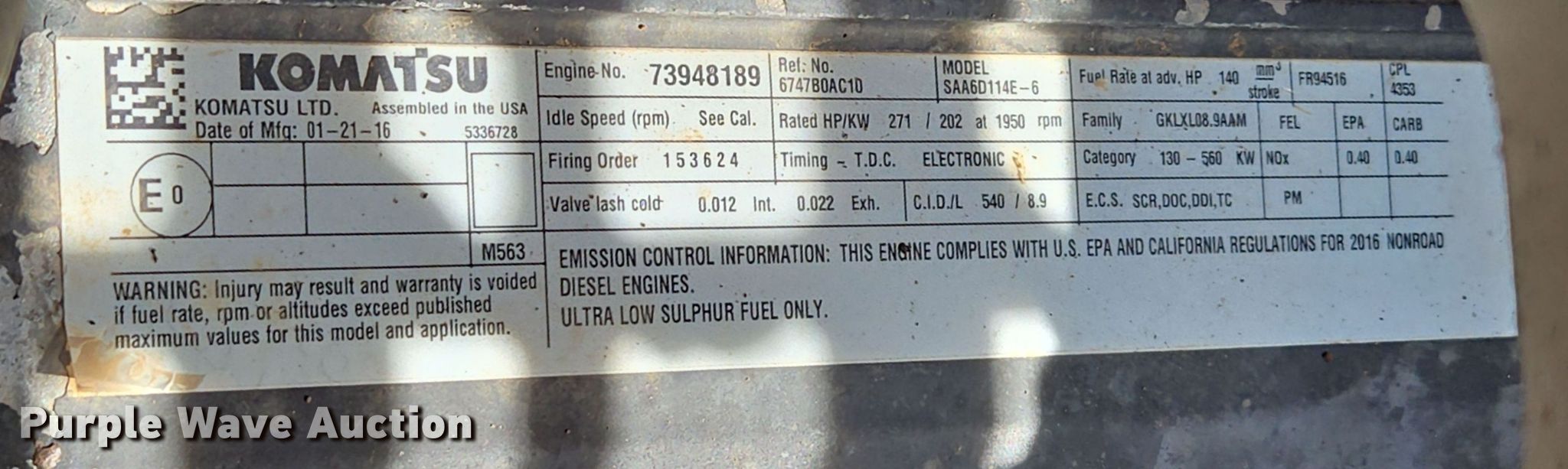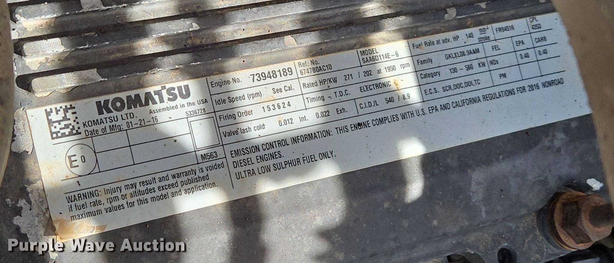 2017 Komatsu PC360LC-11 excavator. Hours: 8,414 on meter, Serial: A35632, Unit #: 23-091. Engine Komatsu SAA6D114E-6, Serial: 73948189, Displacement: 8.9L, Cylinders: 6, Fuel type: Diesel. Transmission Hydrostatic. Operators station Enclosed cab, AC, Heat, Backup camera. Features Auxiliary hydraulics, Boom Standard, Stick Stick length: 10' 6", Quick coupler: Hydraulic, Bucket Esco, Width: 49", Teeth: 5. Tracks Width: 33.5", Steel, Grouser pads: Triple. Notes Warning indicator: Regen. Emery Sapp & Sons, Inc.. Springfield, MO 65803
