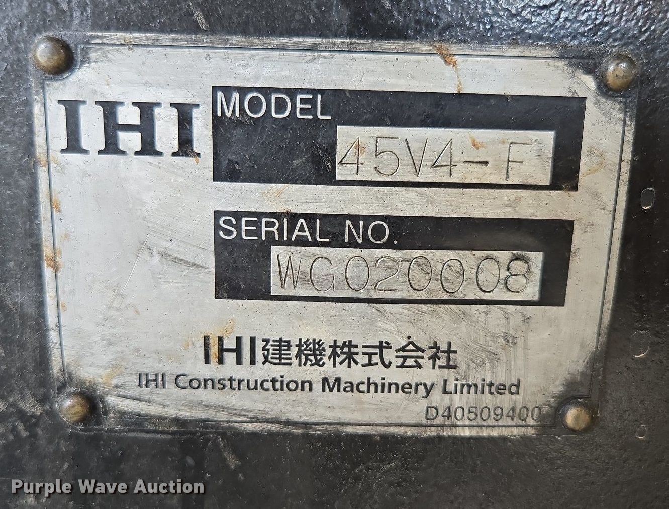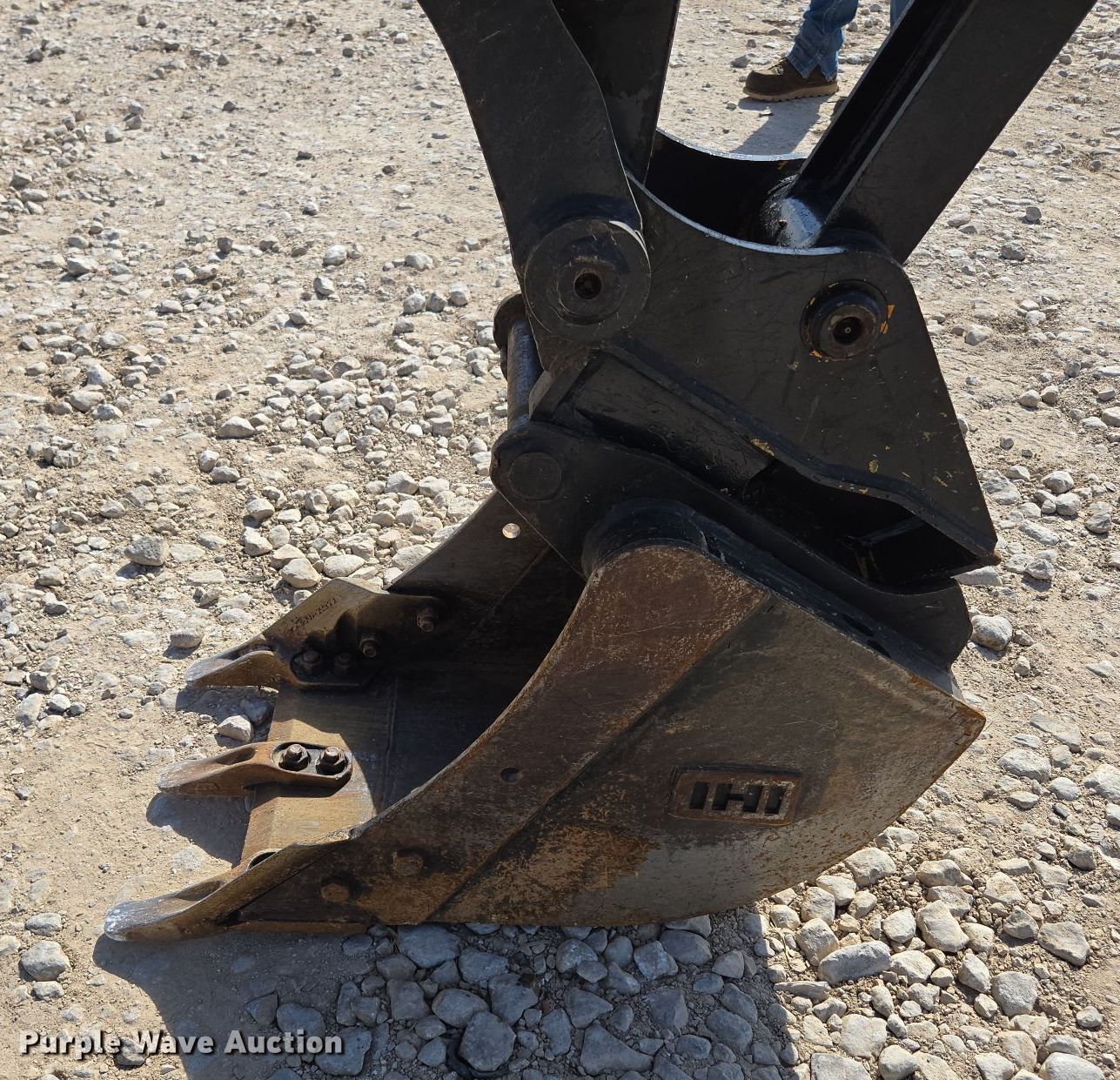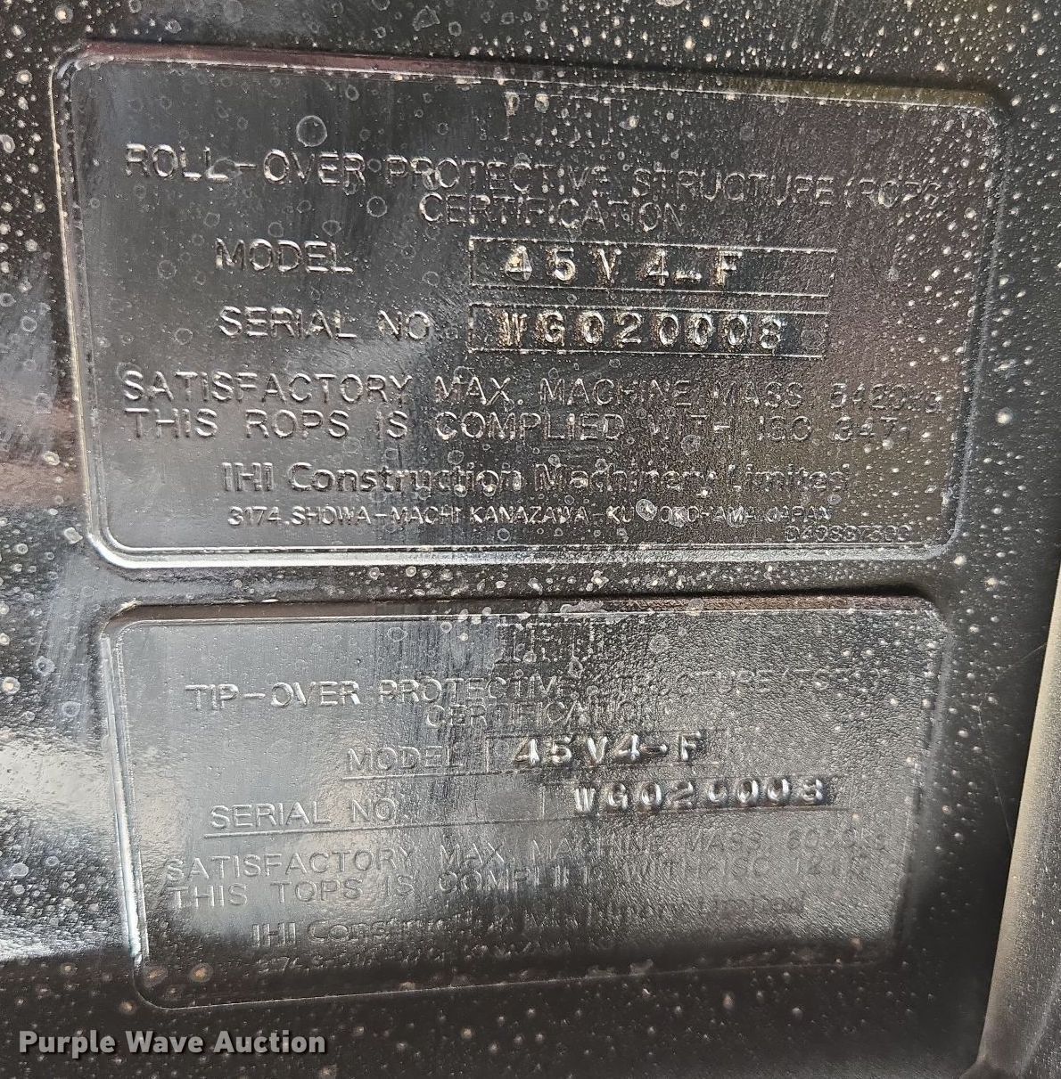 IHI 45V4-F mini excavator. Hours: 1,142 on meter, Serial: WG020008. Engine Kubota V2403-CR-EF04, Displacement: 2.4L, Cylinders: 4, Fuel type: Diesel, kW: 33.6. Transmission Hydrostatic. Operators station OROPS. Features Auxiliary hydraulics, Backfill blade Width: 78.25", Boom Swing, Stick Stick length: 5' 3", Quick coupler: Mechanical, Thumb: Hydraulic WB, Bucket IHI, Width: 18", Teeth: 3, Harford Manufacturing SL35/MR2 Width: 30", Teeth: 5, Bucket Width: 24", Teeth: 4. Tracks Width: 16", Rubber. Notes Tracks damaged in rubber tracks. Superior Rents. Joplin, MO 64801