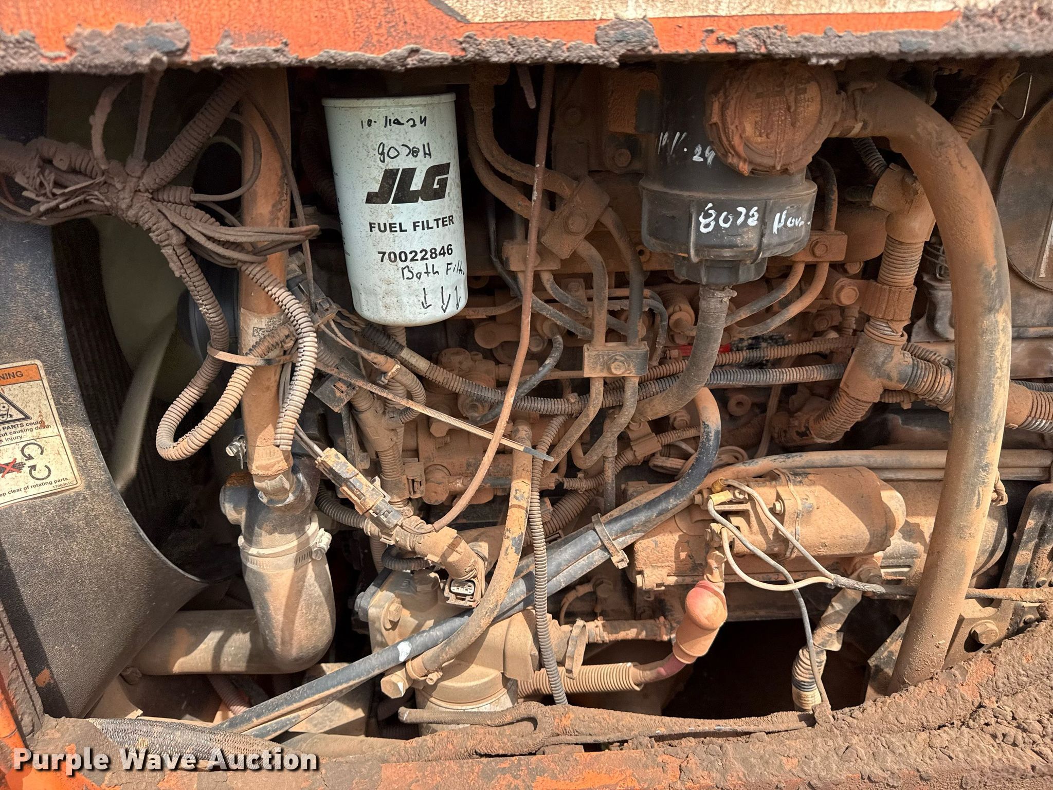 2013 JLG 10042 telehandler. Hours: 8,090 on meter, Serial: 0160054513, Unit #: 80-187. Engine Cummins QSB3.3, Serial: 68607077, Displacement: 3.261L, Cylinders: 4, Fuel type: Diesel, HP: 100, kW: 75. Transmission Powershift, 4F - 4R, Four wheel drive. Operators station Canopy, Steering: Crab, Four wheel. Features Maximum lift capacity: 10,000 lbs, Maximum lift height: 42', Boom stages: 3, Fork length: 48", Hydraulic outriggers, Hydraulic leveling. Tires Size: 17.5-25L, Foam filled. Manhattan Road & Bridge. Muskogee, OK 74403