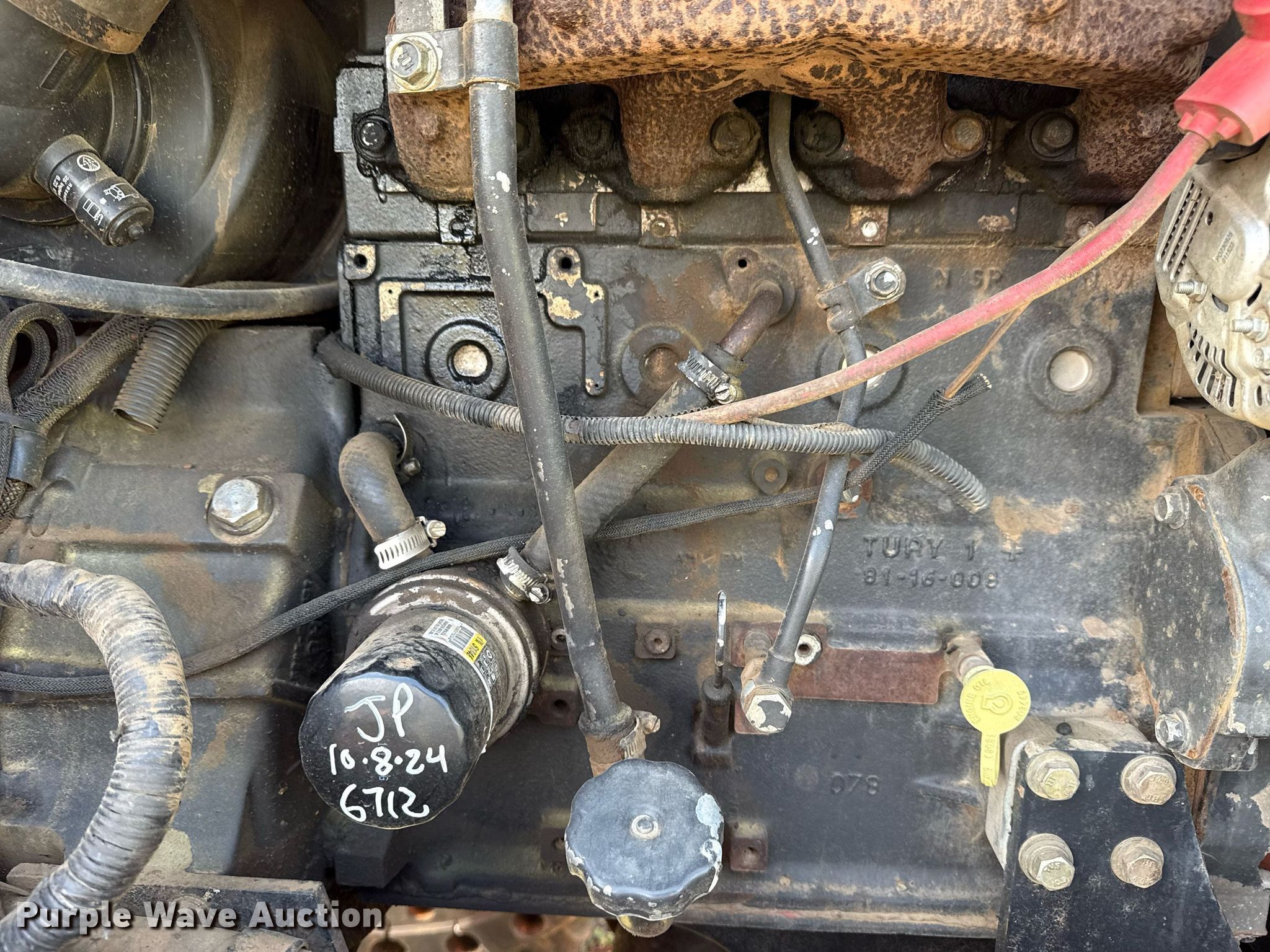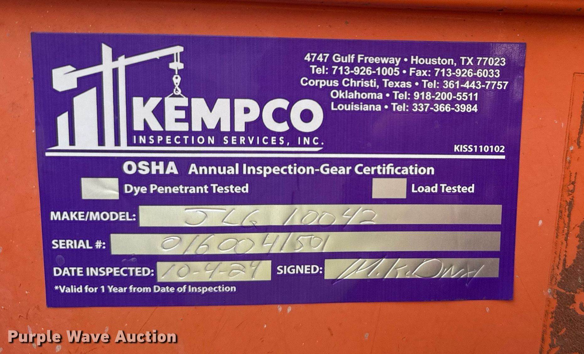 2011 JLG 10042 telehandler. Hours: 6,737 on meter, Serial: 0160041501, Unit #: 80-168. Engine Cummins, Cylinders: 4, Fuel type: Diesel. Transmission Powershift, 4F - 3R, Four wheel drive. Operators station Canopy, Steering: Crab, Four wheel. Features Maximum lift capacity: 10,000 lbs, Maximum lift height: 42', Boom stages: 3, Fork length: 48", Hydraulic outriggers, Hydraulic leveling, Quick attach: Manual. Tires Size: 14.00-24, Solid. Notes Boom issues, will not fully retract, Dead battery, Tires damaged. Manhattan Road & Bridge. Muskogee, OK 74403