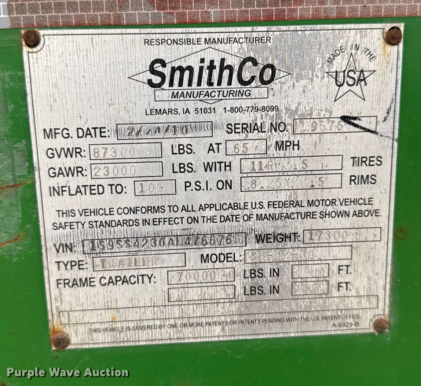 Purple Wave is selling a used Side Tilt Dump Trailer in Iowa. This item is a 2010 SmithCo S3-42-34 side dump trailer with the following: VIN: 1S9SS4230AL476676