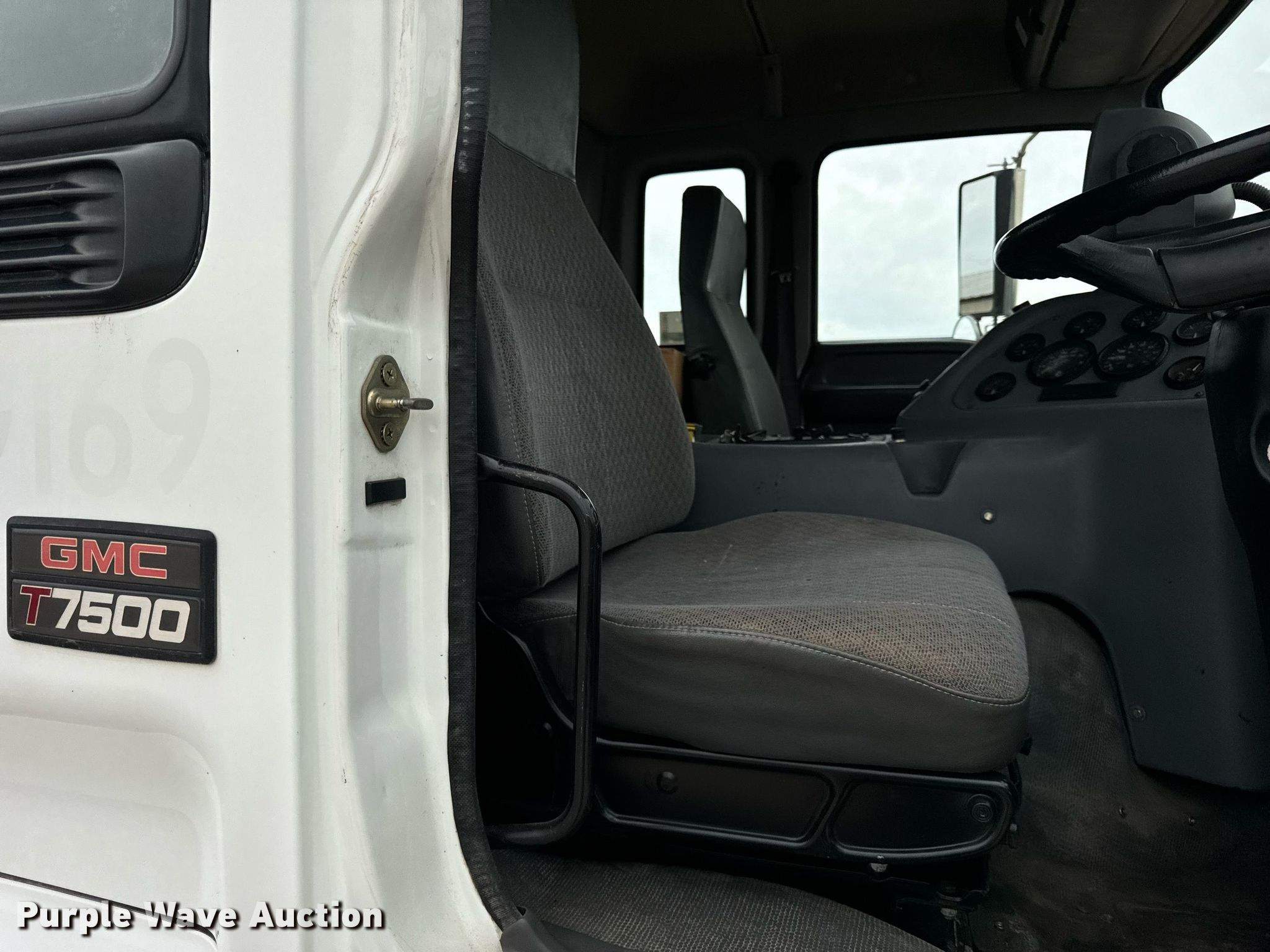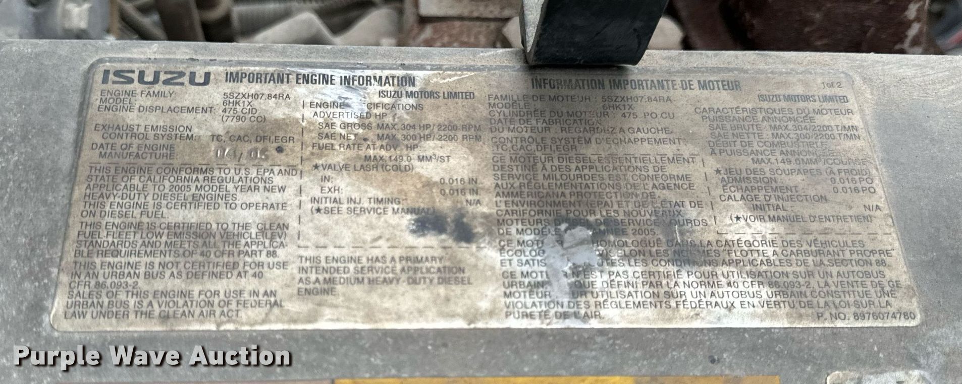 2005 GMC T7500 street sweeper truck. Miles: 93,273 on odometer, Hours: 7,434 on meter, VIN: 1GDM7F1315F533127. Engine Isuzu 6HK1-TC, Displacement: 7.8L, Cylinders: 6, Fuel type: Diesel. Transmission Automatic. Chassis Suspension: Spring, Brakes: Air, GVWR: 33,000 lbs. Operators station AC, Heat, Dual operating station. Features Broom Width: 66", Water spray system, Sweeper bed Sweeper bed type: Conveyor Tennant Centurion, Left gutter broom Diameter: 36", Right gutter broom Diameter: 36".. Tires Size: 11R22.5. Notes Dash warning indicator: Check engine, ABS, Coolant, Dashboard damage, Hydraulic leak, Non operational sweeper bed, Engine issues, will not stay running Coolant sensor issues, Unit must be towed or hauled. Illinois title. Len Cox & Sons Excavating. Romeoville, IL 60446