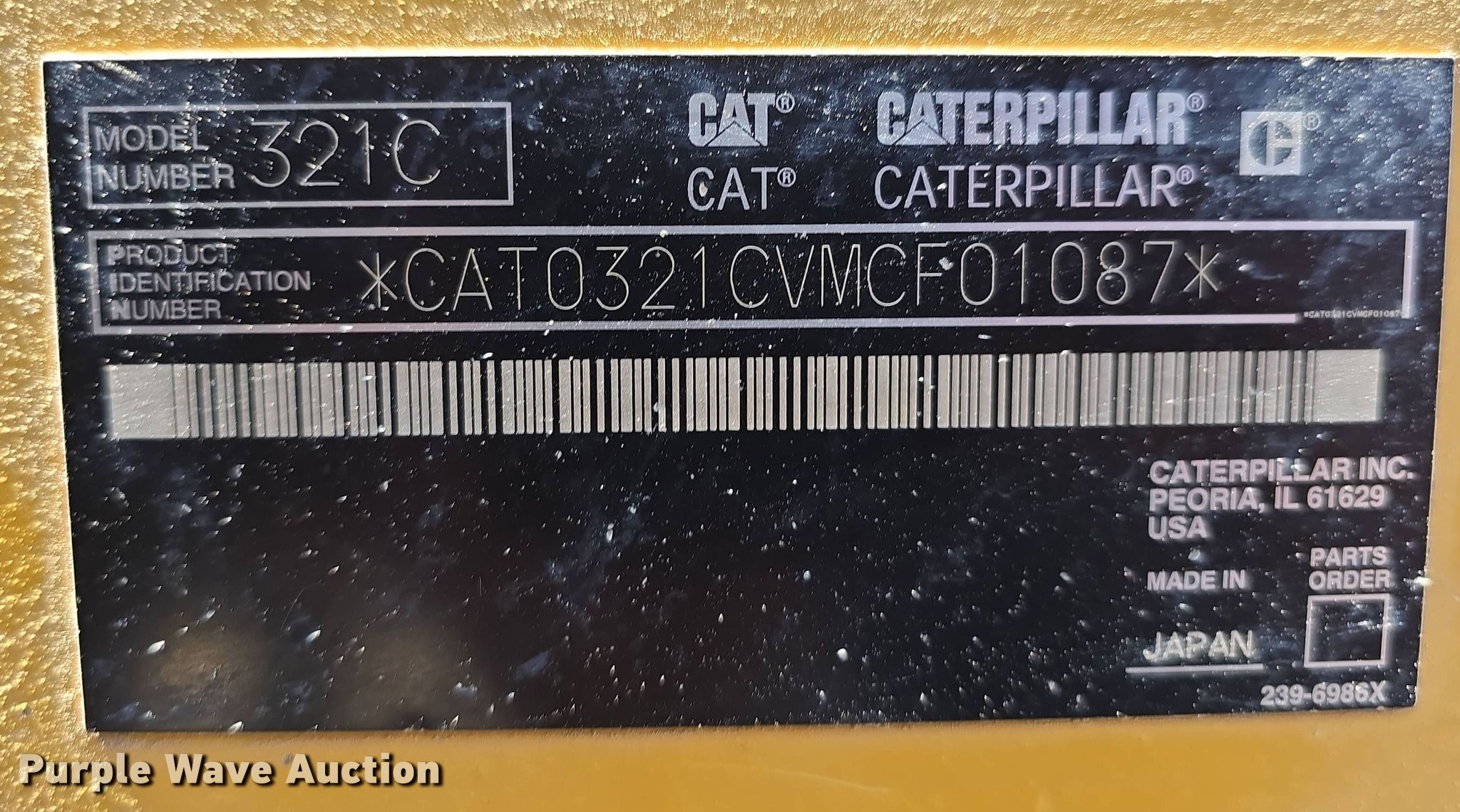 2007 Caterpillar 321C LCR excavator. Hours: 9,343 on meter, Serial: CAT0321CVMCF01087, Unit #: 93443. Engine Caterpillar, Serial: MAE1026, Cylinders: 6, Fuel type: Diesel, HP: 138. Transmission Hydrostatic, Two speed travel. Operators station Enclosed cab, AC, Heat, Pattern changer. Features Auxiliary hydraulics Standard, Boom Standard, Stick Stick length: 9' 8", Quick coupler: Hydraulic Caterpillar, Bucket Caterpillar, Width: 45.25", Teeth: 5, Caterpillar bucket Width: 27.5", Teeth:3. Tracks Width: 31.5", Steel, Grouser pads: Triple. Notes Possible throttle issues. RoadBuilders Machinery and Supply. Omaha, NE 68127