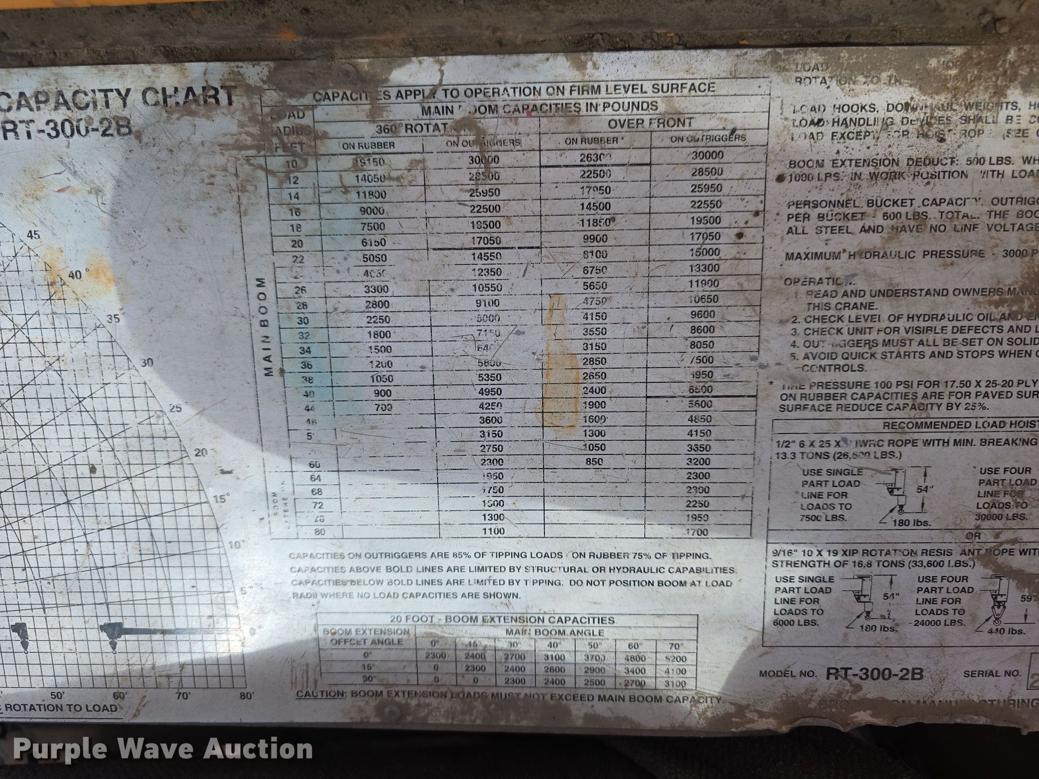 1999 Broderson RT-300-2B crane. Hours: 6,827 on meter, Serial: 20331. Engine John Deere, Cylinders: 6, Fuel type: Diesel. Transmission Powershift, 6F - 3R. Chassis Axles: Single, Brakes: Hydraulic. Operators station Enclosed cab, Heat, Crane controls: Stick. Features Boom Telescopic, Maximum boom length: 80' Sections: 4, Maximum lift capacity: 30,000 lbs, Maximum lift height: 87', Stabilizers: 4, Boom controls In-cab, Removable counter weight, Crane block Sheaves: 2, Capacity: 15 tons, Manuals, Lift chart. Tires Size: 17.5-25. Notes Hydraulic leak. Rion Equipment. Omaha, NE 68127