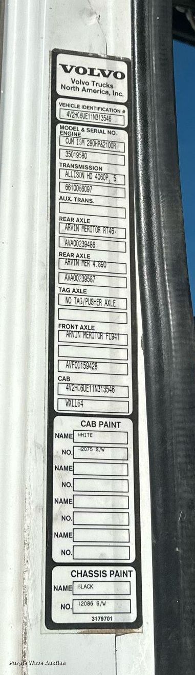 2001 Volvo WXLL truck cab and chassis. Miles: 7 on odometer Actual miles unknown, Hours: 8,841 on meter, VIN: 4V2HC6UE11N313546. Engine Cummins ISM, Serial: 35019580, Cylinders: 6, Fuel type: Diesel. Transmission Allison, Automatic. Chassis Axles: Tandem, Differential lock: Inter-axle, Suspension: Air Dump valves, Brakes: Air, Truck chassis: 22' 5". Interior Heat, Cruise control. Features Fuel tank: Single. Tires Front: 385/65R22.5, Rear: 11R22.5. Notes Windshield chipped or cracked, Odometer issues, Coolant leak, Starting issues when coolant is low. South Dakota title. Mileage has not been verified. Exempt will be written in the odometer disclosure on the title. Title distribution may be delayed up to 14 days from verification of funds. Dakota Barricade LLC. Rapid City, SD 57703