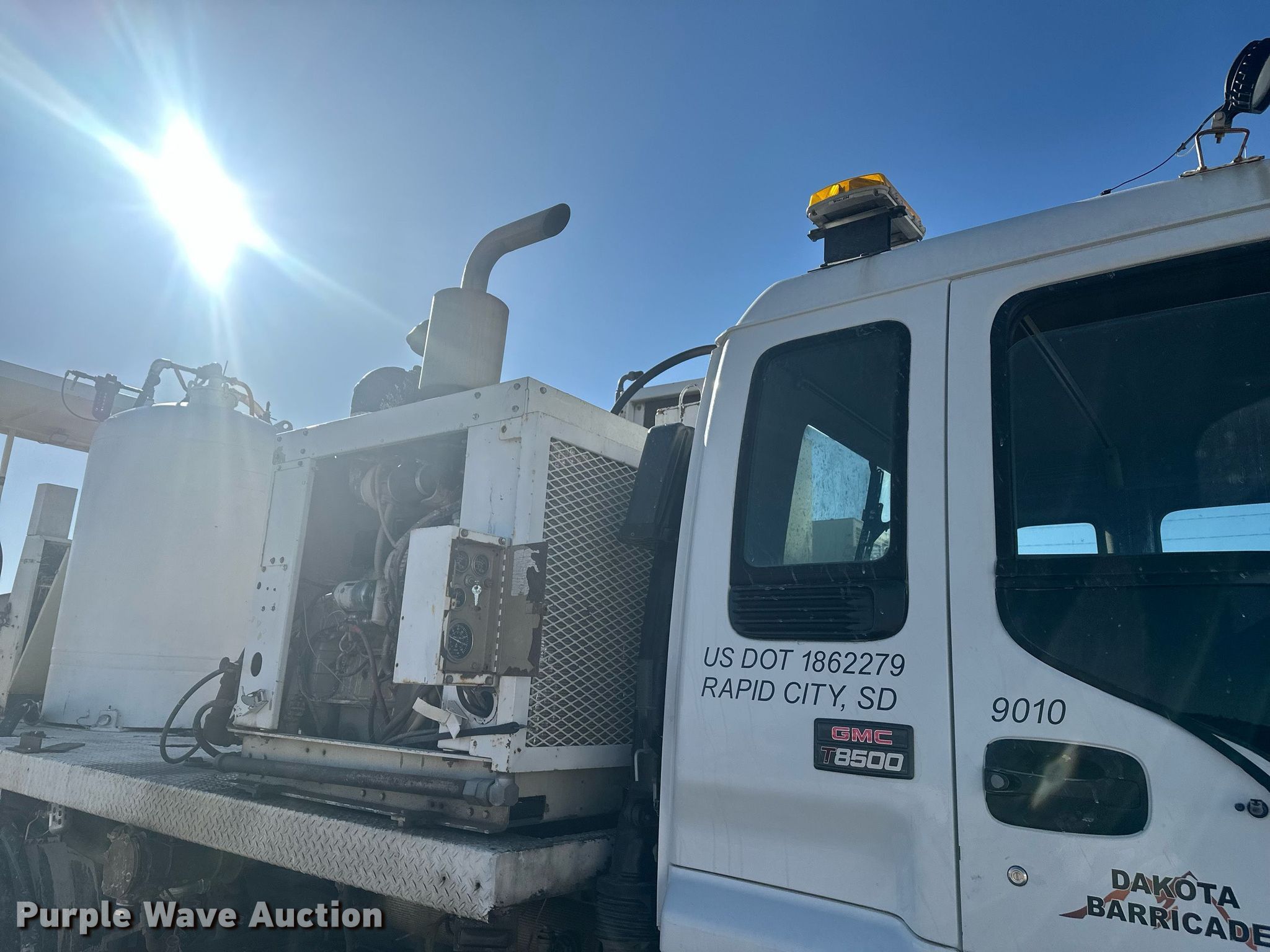 2001 GMC T8500 paint striper truck. Miles: 348,660 on odometer, VIN: 1GDT7C4C41J511331. Engine Caterpillar 3126, Displacement 7.2L, Cylinders: 6, Fuel type: Diesel. Transmission Allison, Automatic. Chassis Axles: Tandem, Differential lock: Inter-axle, Suspension: Spring over walking beam, Brakes: Air, PTO, Truck chassis: 20' 4", GVWR: 54,600 lbs FAWR: 14,600 lbs, IAWR: 20,000 lbs, RAWR: 20,000 lbs. Interior Heat, Power windows, Power locks, Cruise control. Features Fuel tank: Dual, Vanair air compressor Serial: 30-73366, Hours: 1,377. Tires Size: 11R22.5. Notes Dash warning indicator: ABS, Hydraulic issues, carriage hydraulics weak. South Dakota title. Title distribution may be delayed up to 14 days from verification of funds. Dakota Barricade LLC. Rapid City, SD 57703