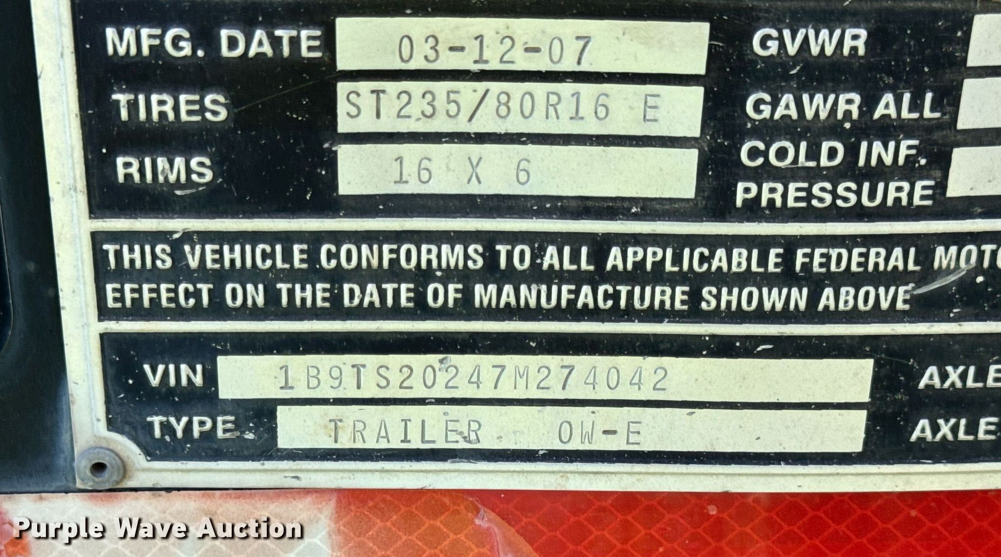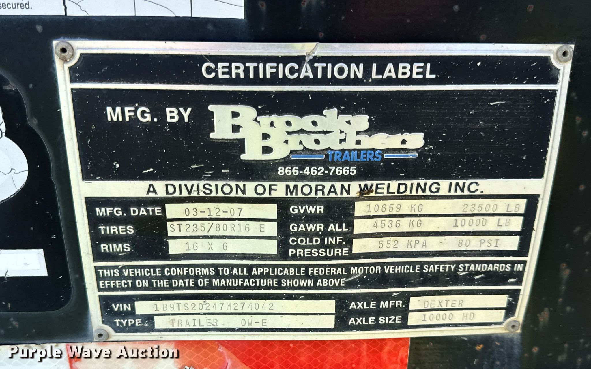 Purple Wave is selling a used Equip. Trailer in Missouri. This item is a 2007 Brooks Brothers OW-E equipment trailer with the following: VIN: 1B9TS20247M274042, Unit #: T6
