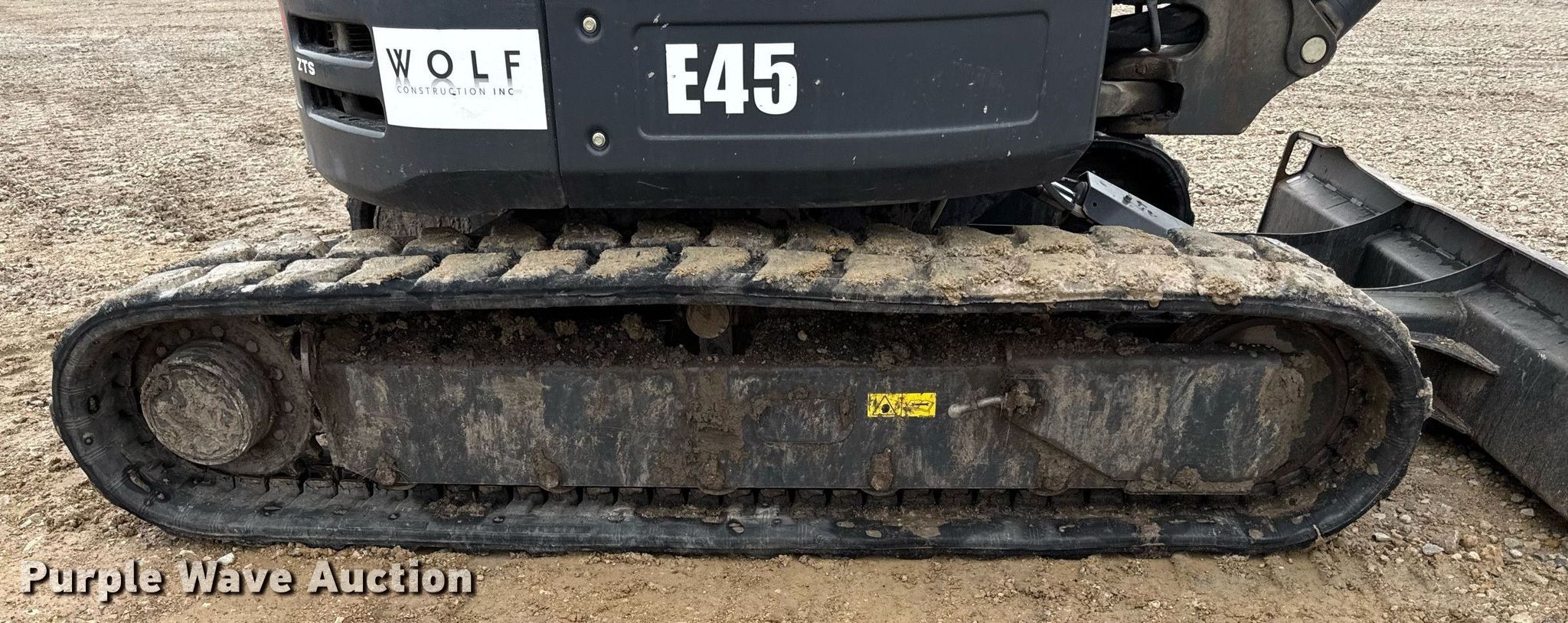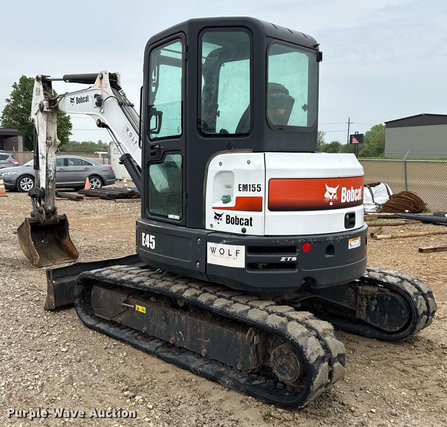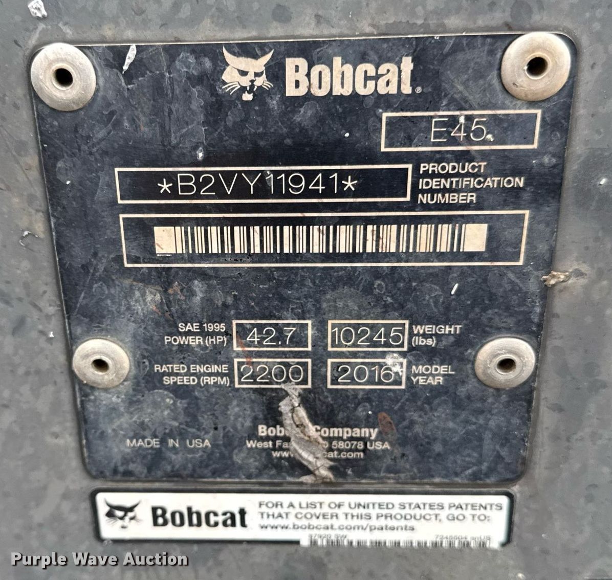 Purple Wave is selling a used Mini Excavator in Kansas. This item is a 2016 Bobcat E45 mini excavator with the following: Hours: 4,529 on meter, Serial: B2VY11941