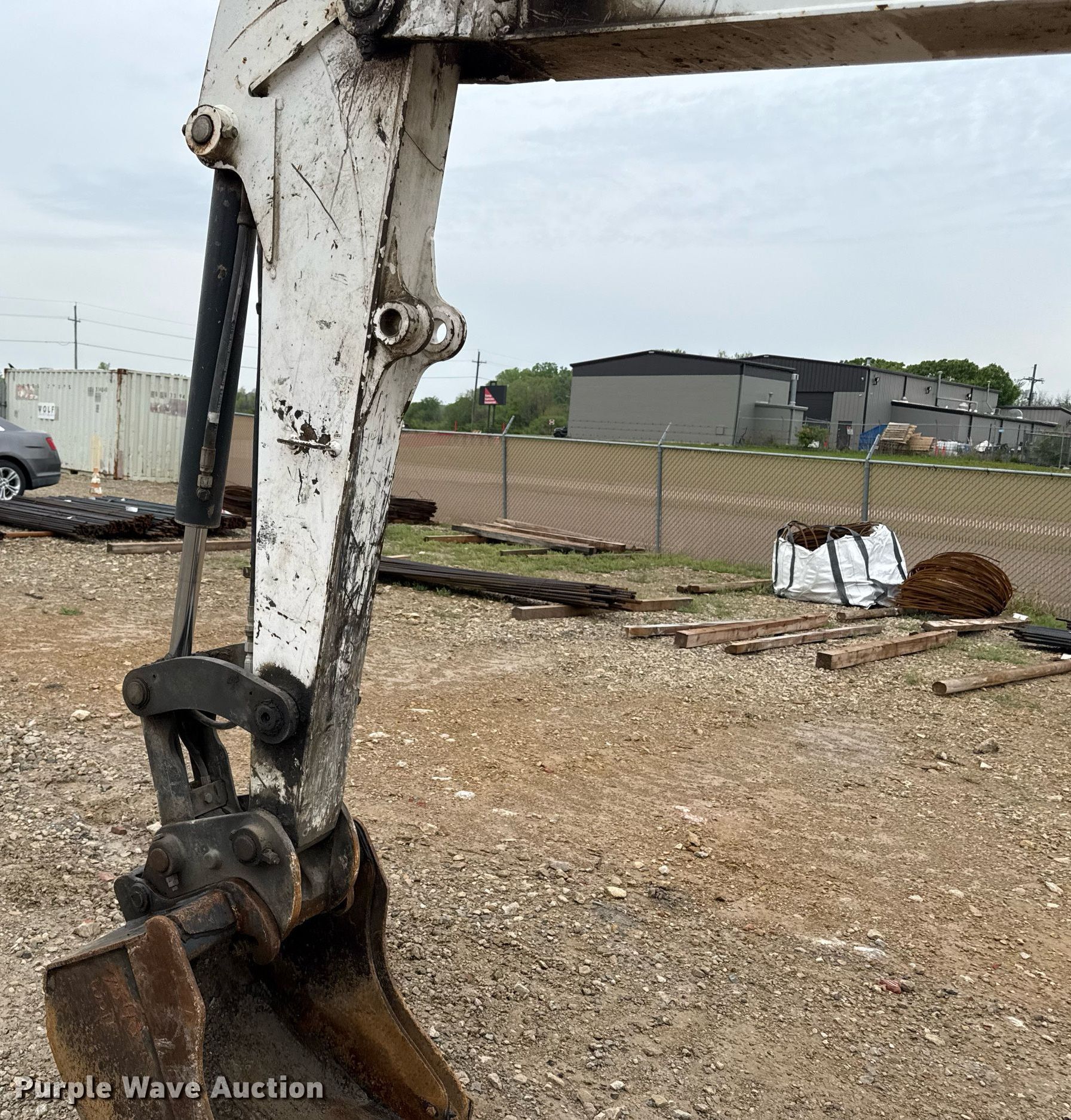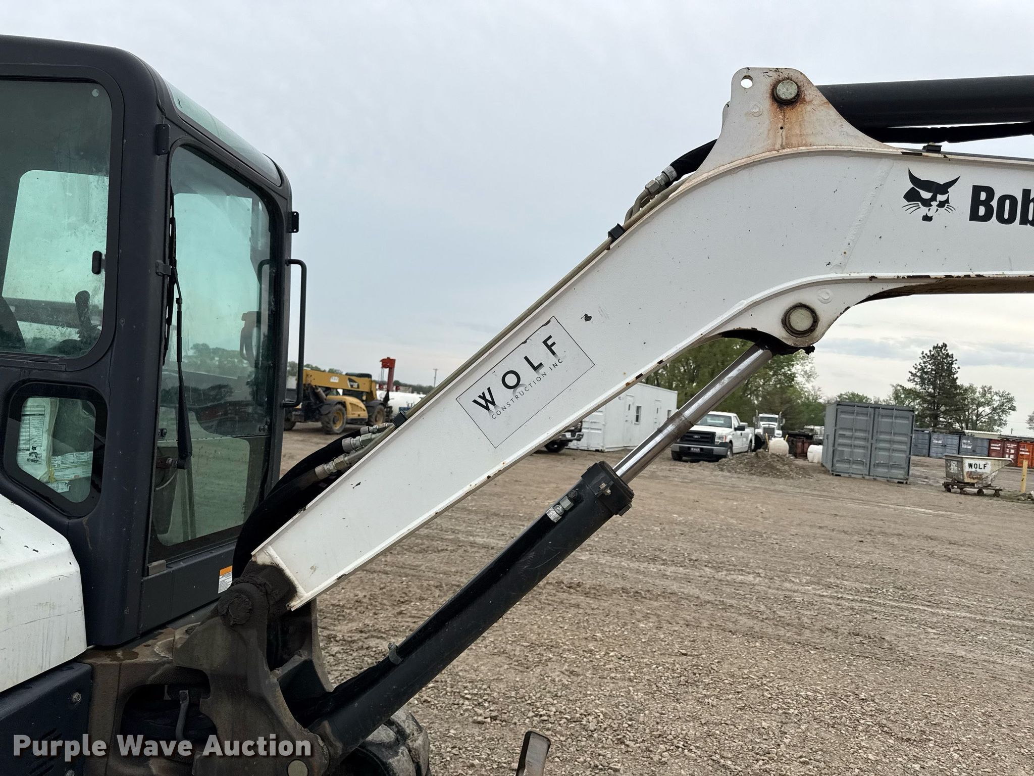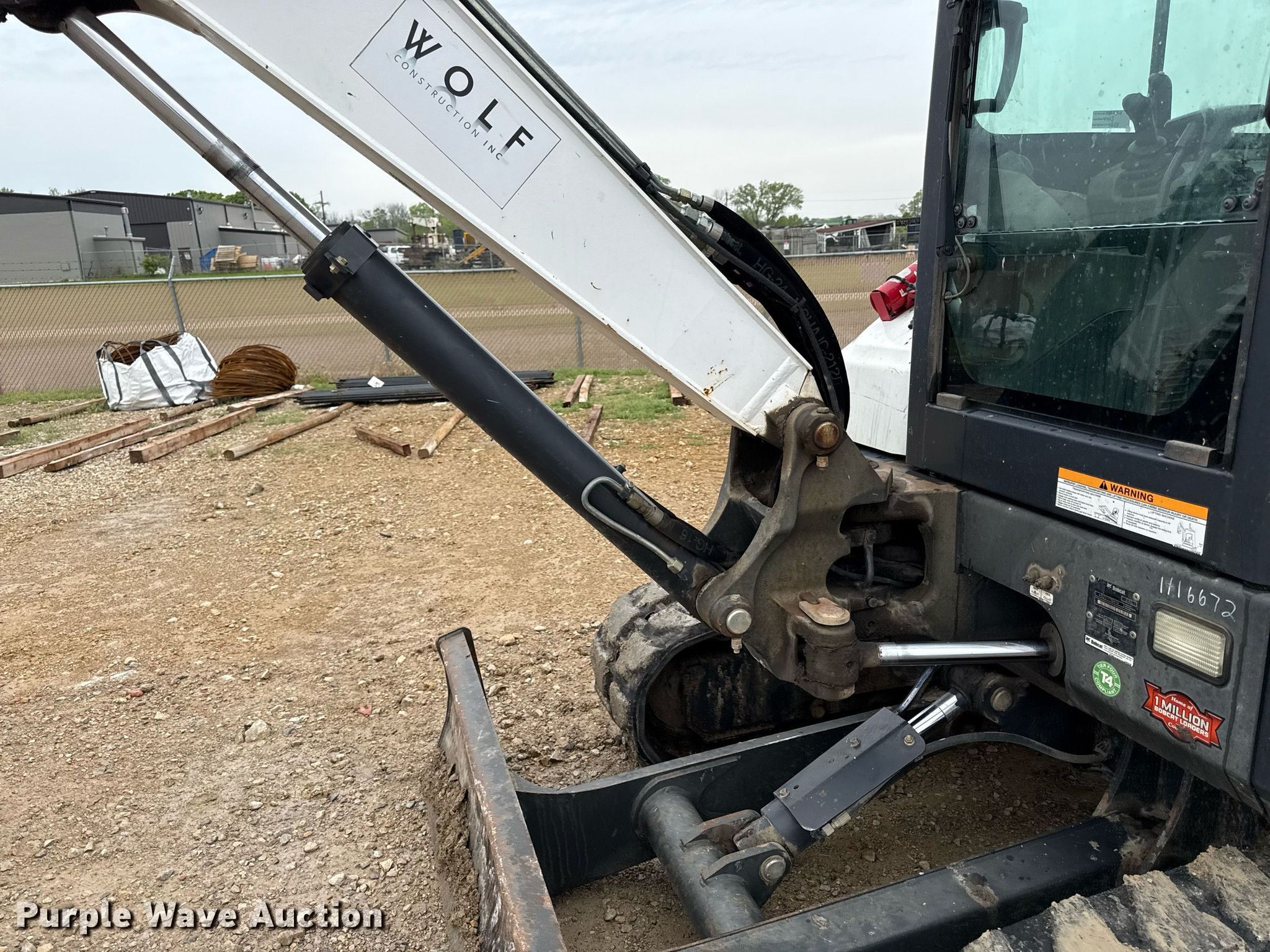 2016 Bobcat E45 mini excavator. Hours: 4,529 on meter, Serial: B2VY11941. Engine Cylinders: 4, Fuel type: Diesel. Transmission Hydrostatic. Operators station Enclosed cab, AC, Heat. Features Auxiliary hydraulics Two-way, Backfill blade Width: 77", Boom Swing, Stick Stick length: 4' 7", Quick coupler: Hydraulic Bobcat, Bucket Bobcat, Width: 24", Cutting edge: Weld-on. Tracks Width: 16", Rubber. Wolf Construction. Topeka, KS 66609