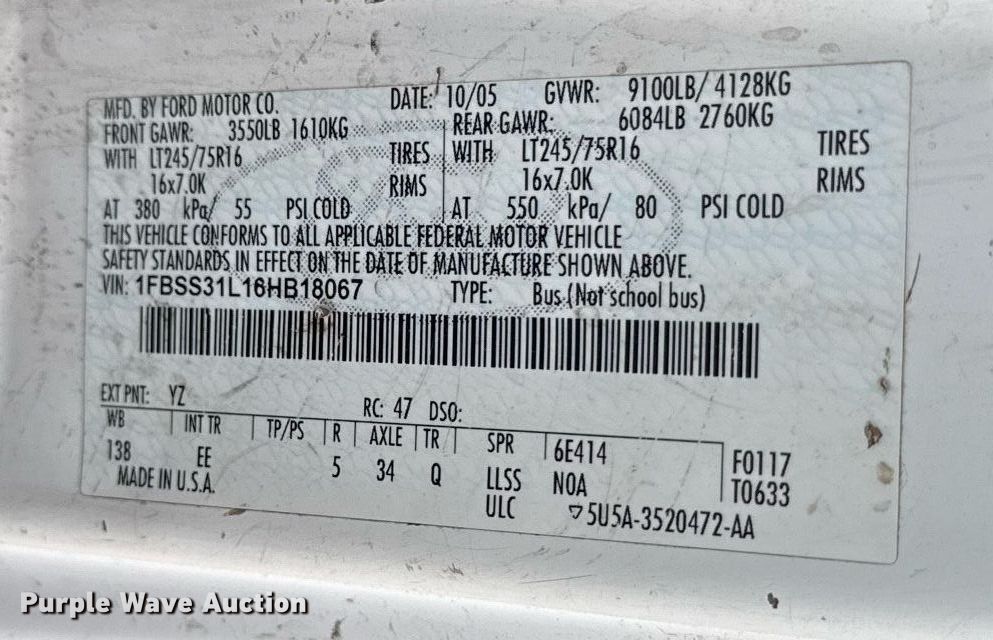 Purple Wave is selling a used Passenger Vehicle in Kansas. This item is a 2006 Ford E350 Super Duty van with the following: Miles: Unknown, VIN: 1FBSS31L16HB18067