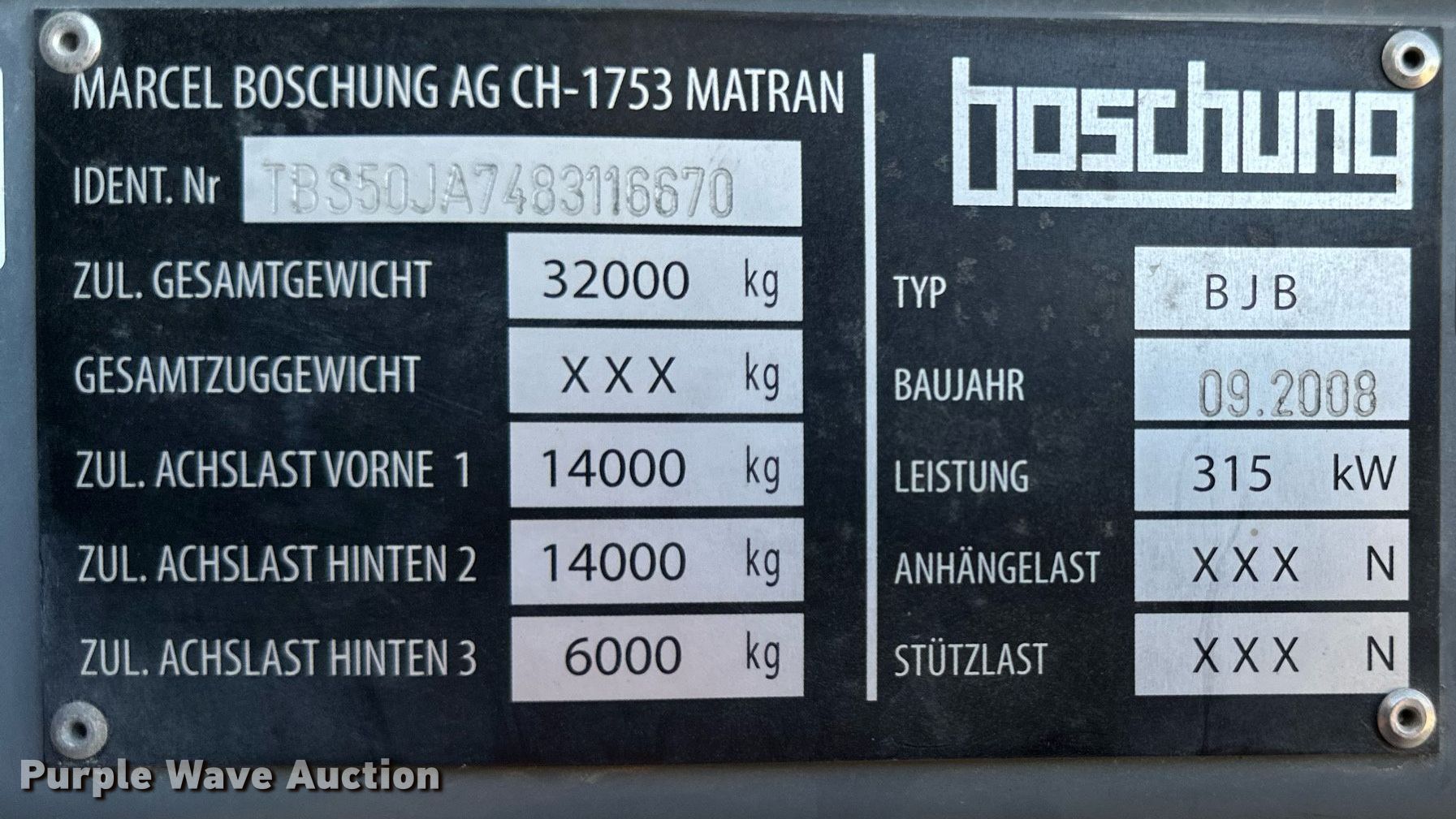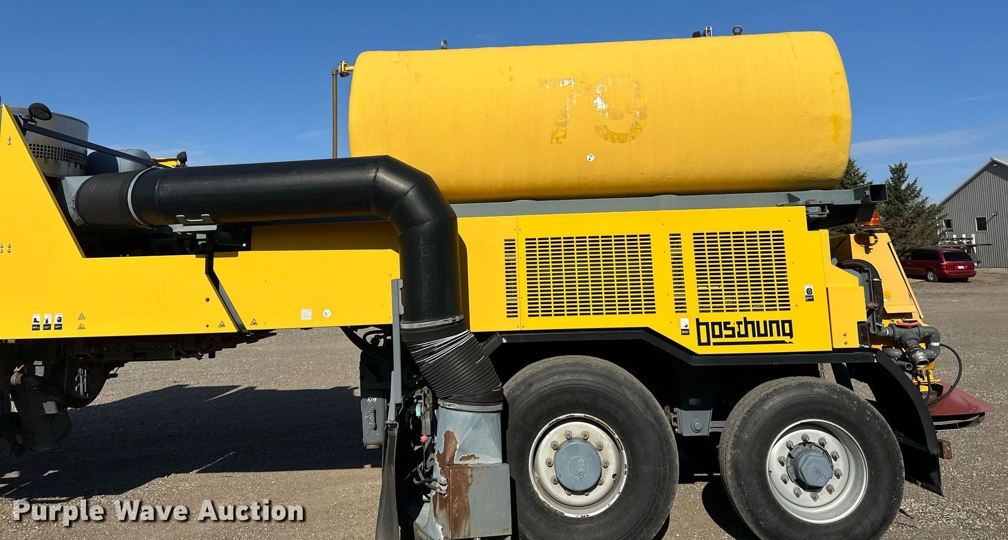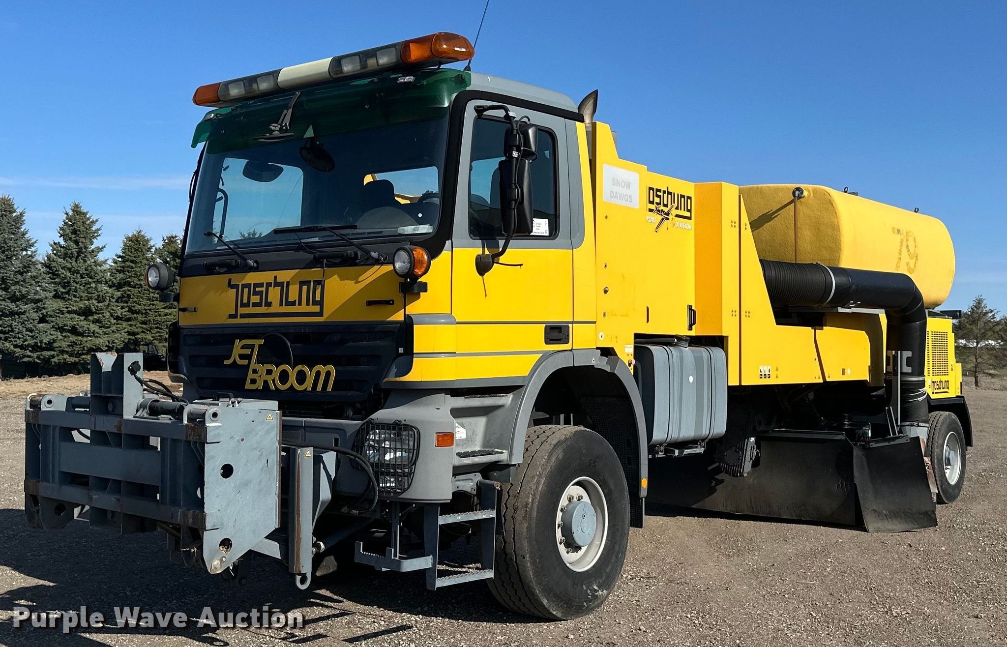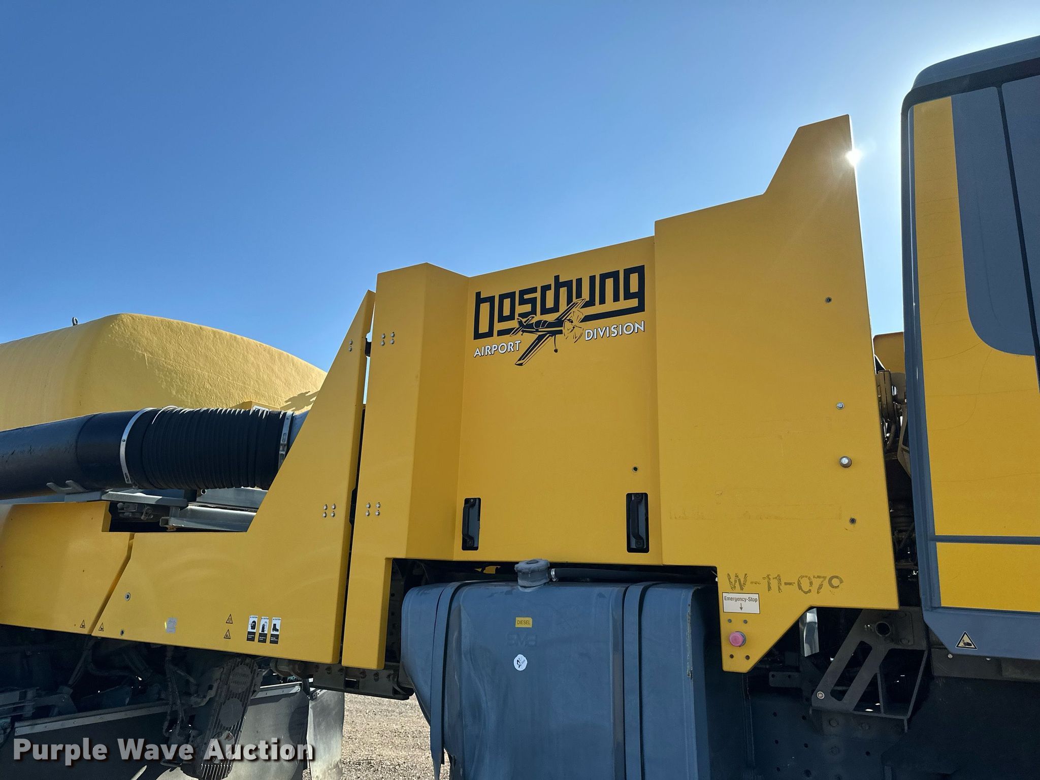 2008 Boschung Jet Broom runway cleaning truck. Kilometers: 17,126 on odometer, VIN: TBS50JA7483116670. Engine Mercedes, Cylinders: 6, Fuel type: Diesel. Second engine Mercedes, Cylinders: 6, Fuel type: Diesel. Transmission Automatic. Chassis Four wheel drive, Crab steering, Axles: Tandem, Differential lock: Full, Suspension: Spring, Brakes: Air. Interior Heat, Heated mirrors, Power windows, Auxiliary controls. Features Vacuum Width: 10' 6", Snow plow Width: 28", Mid-mount broom Width: 19", De-Icer tank Capacity: 2,200 gallons, Four wheel drive. Tires Front: 445/75R22.5, Rear: 445/75R22.5, Rear: 295/80R22.5. Notes Dash warning indicator: Transmission, Coolant, Engine. Minnesota title. Title distribution may be delayed up to 14 days from verification of funds. Loretto, MN 55357