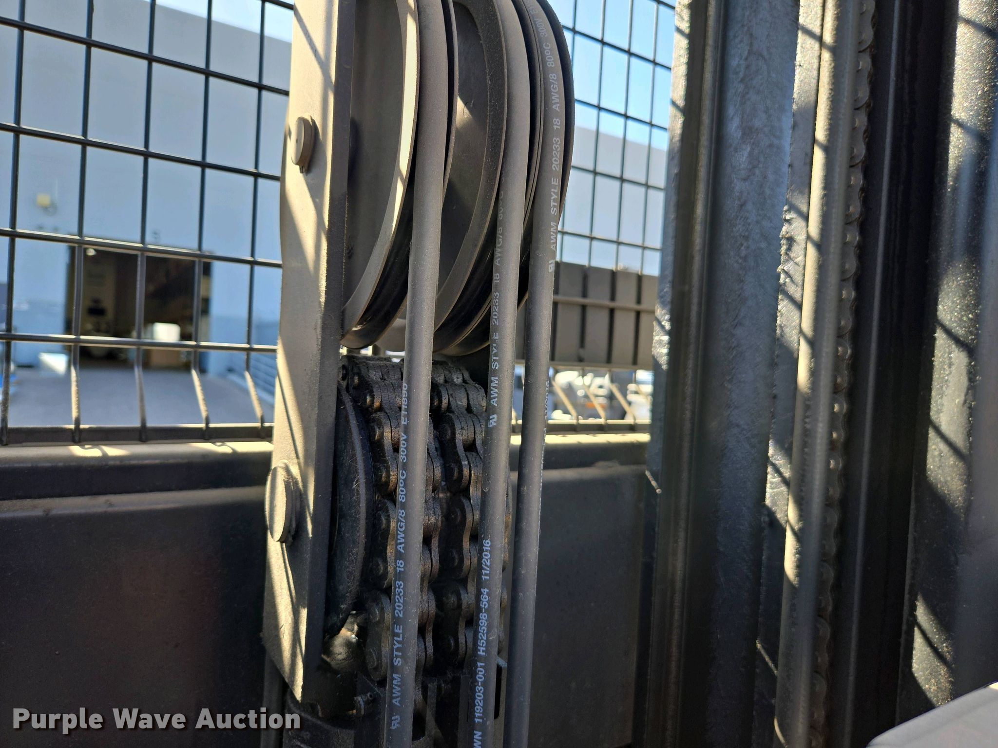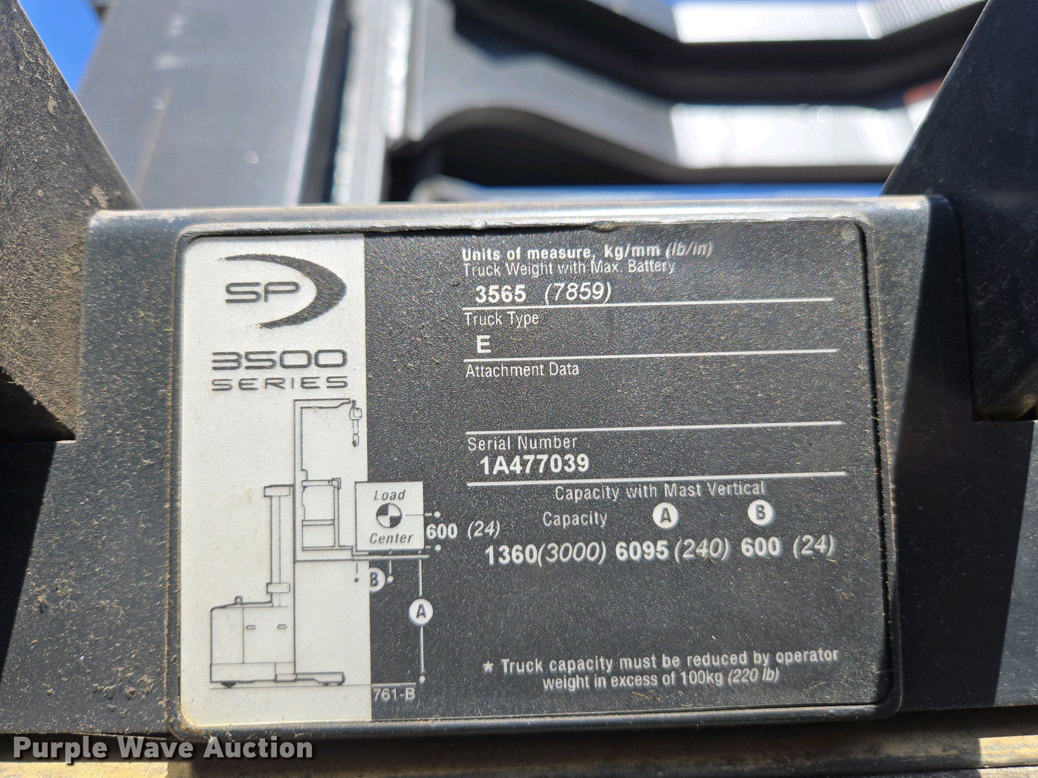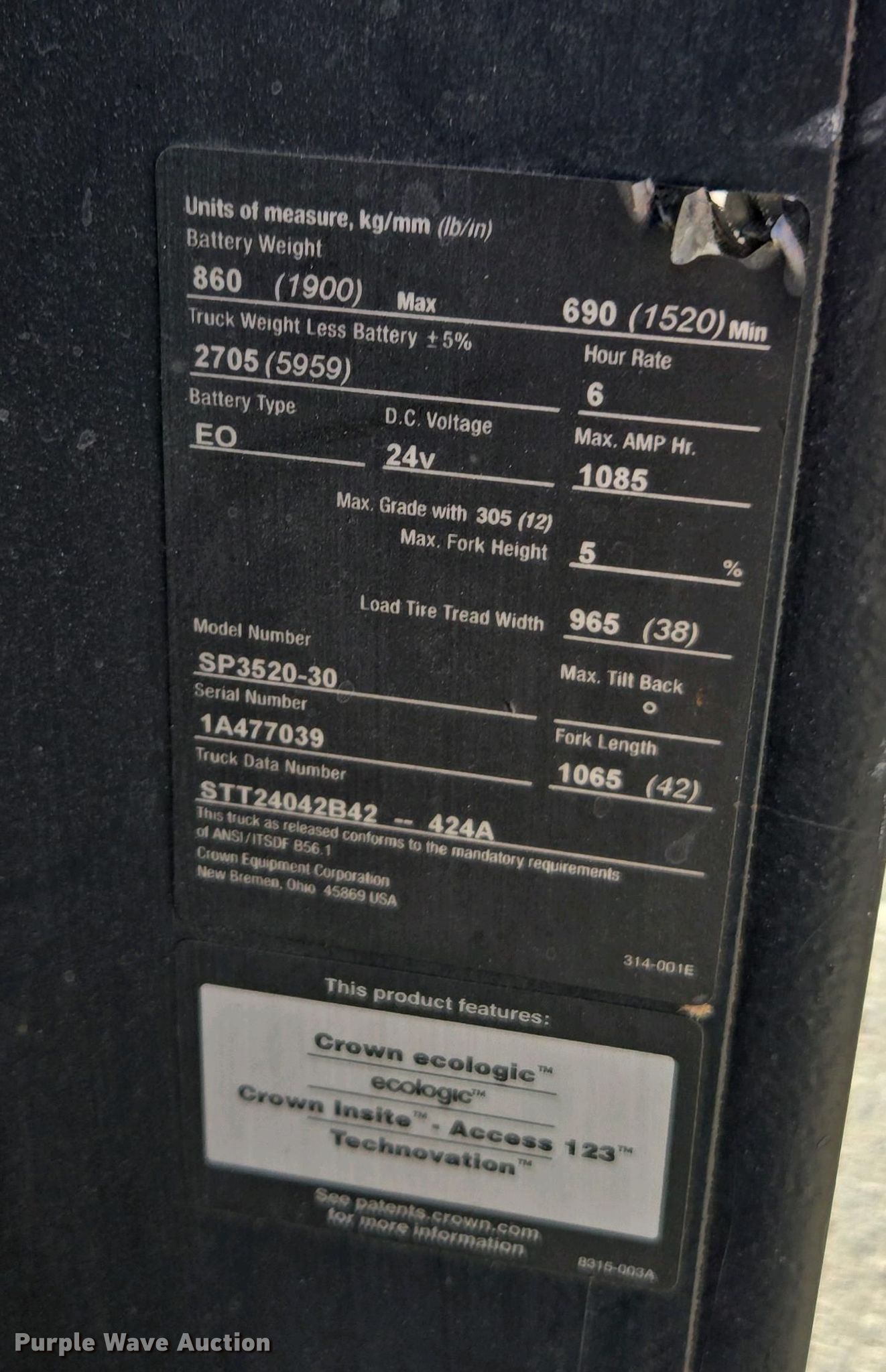 2016 Crown SP3520-30 order picker. Hours: 2,434 on meter, Serial: 1A477039. Electric Motor Volts: 24. Transmission Electric drive. Operators station Canopy. Features Maximum lift capacity: 3,000 lbs, Maximum lift height: 240", Mast stages: 3, Fork length: 42". Tires Solid. Ferguson. Gilbert, AZ 85233