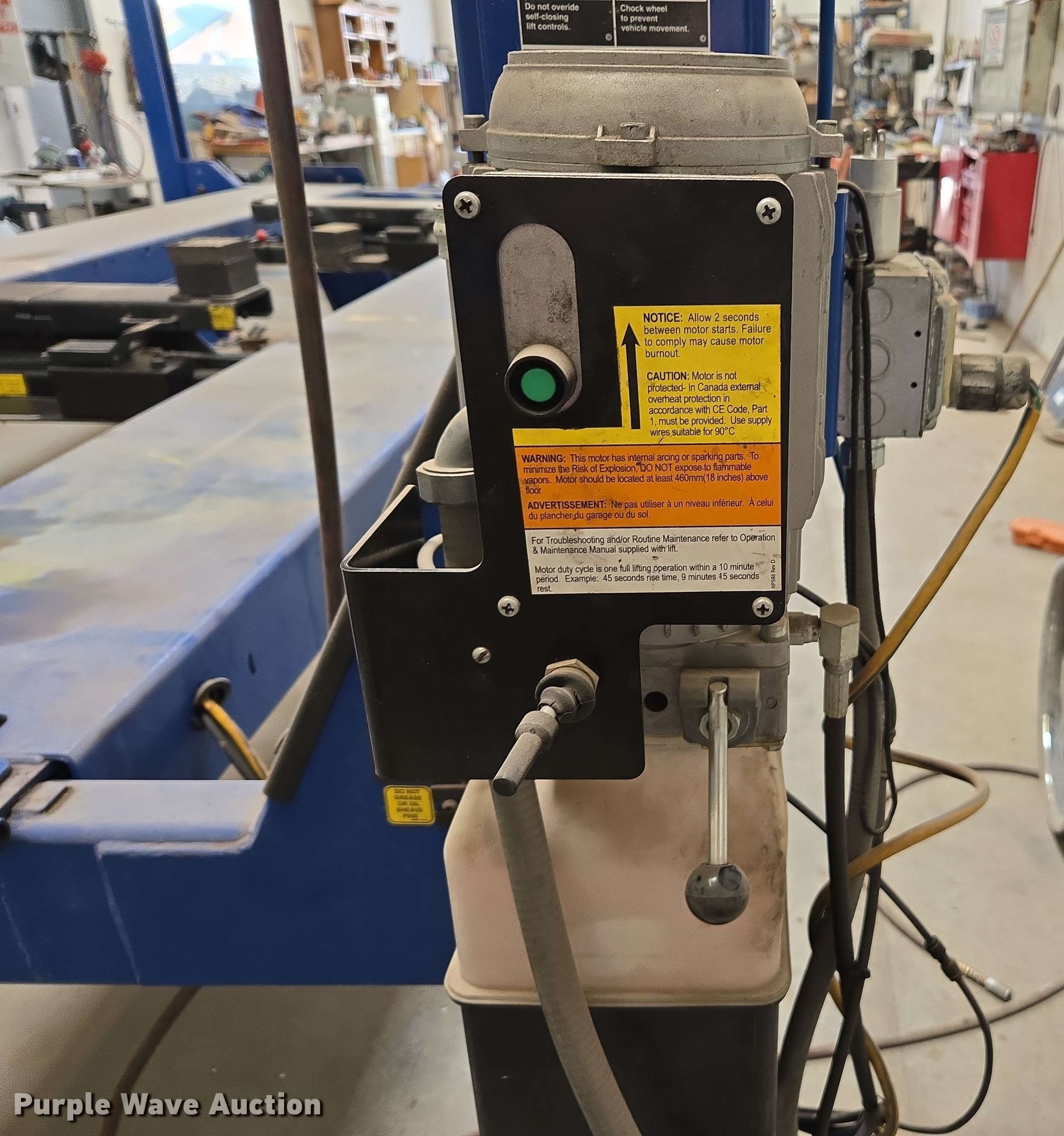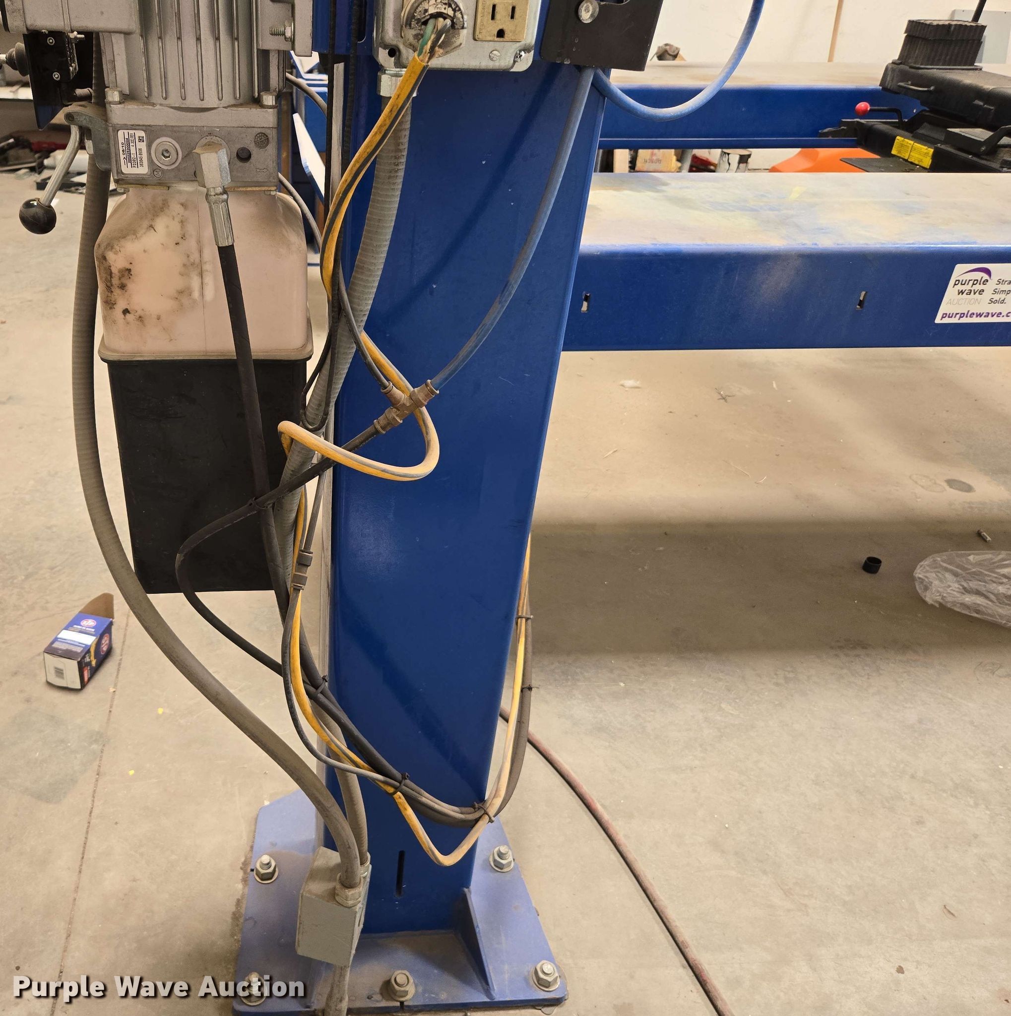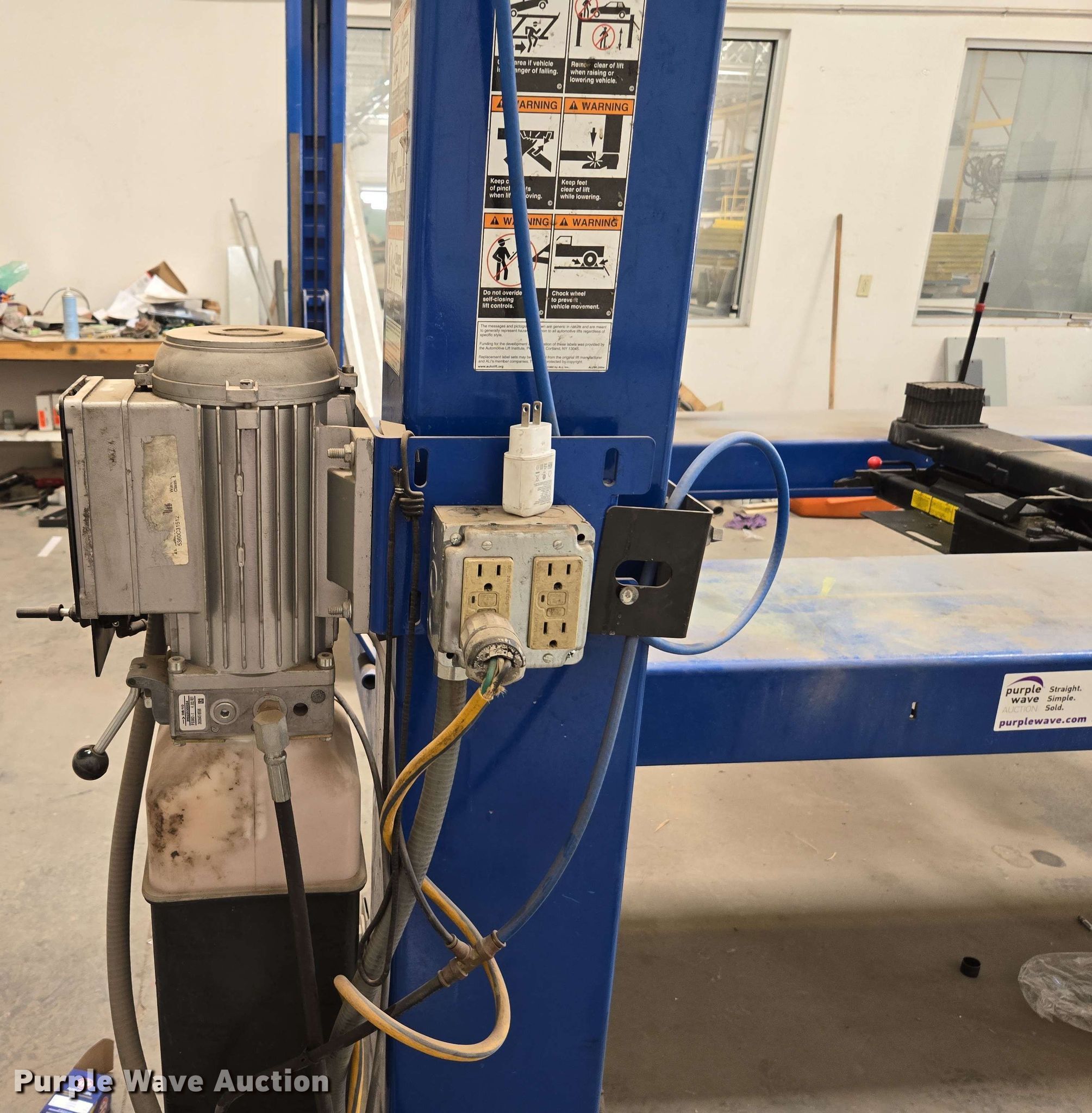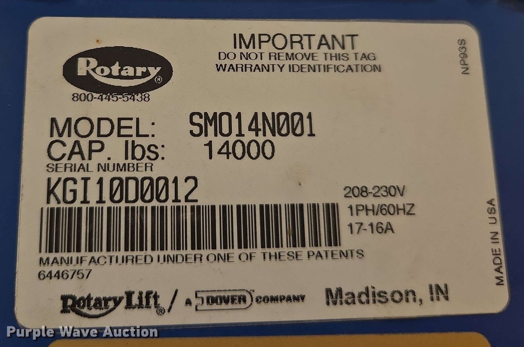 Purple Wave is selling a used Tools in Texas. This item is a Rotary Lift SM014N001 four post automotive lift with the following: Serial: KGI1OD0012, Capacity: 14,000 lbs, Volts: 208-230, Phase: Single, Overall dimensions: 221" L x 128" W x 82" H, Ramps: 4' L x 20" W, (2) Interior axle lifts, Dimensions: 8.5" L x 3' W, Electric motor, HP: 2, kW: 1.5, Hz: 60