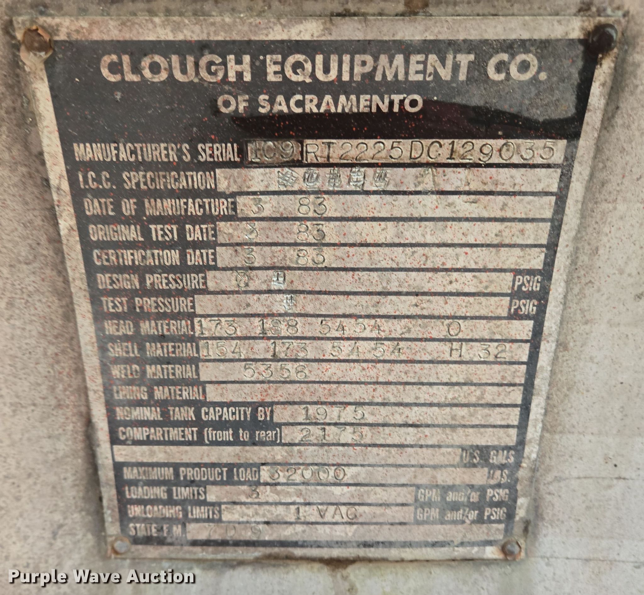1983 Clough Equipment Co. tank trailer. VIN: 1C9RT2225DC129035. Dimensions Overall: 33' L x 96" W. Features Tank type: Aluminum, Compartments: 2, Trailer dolly. Chassis Hitch: Pintle, Landing gear: Single, Suspension: Spring, Brakes: Air. Tires Aluminum wheels, Steel wheels, Size: 295/75R22.5. Kentucky title. Title distribution may be delayed up to 14 days from verification of funds. Harrodsburg, KY 40330