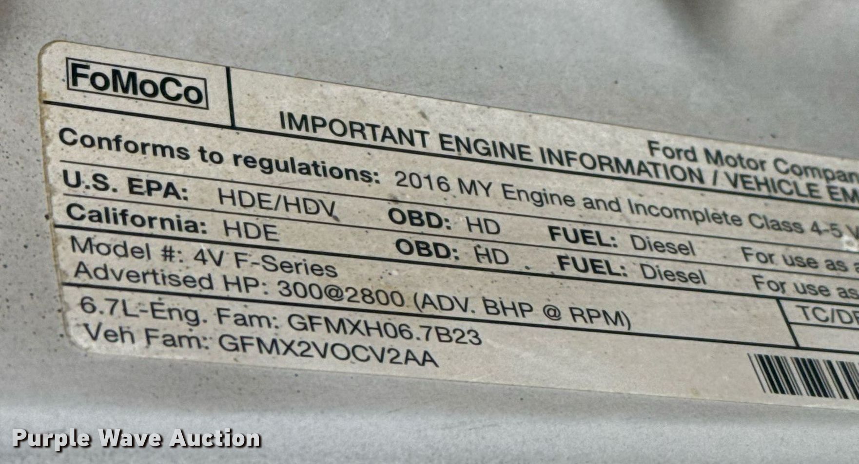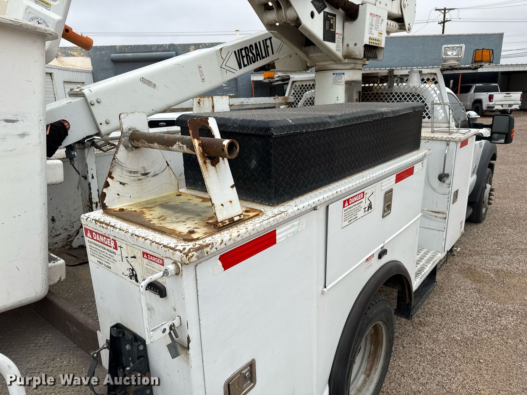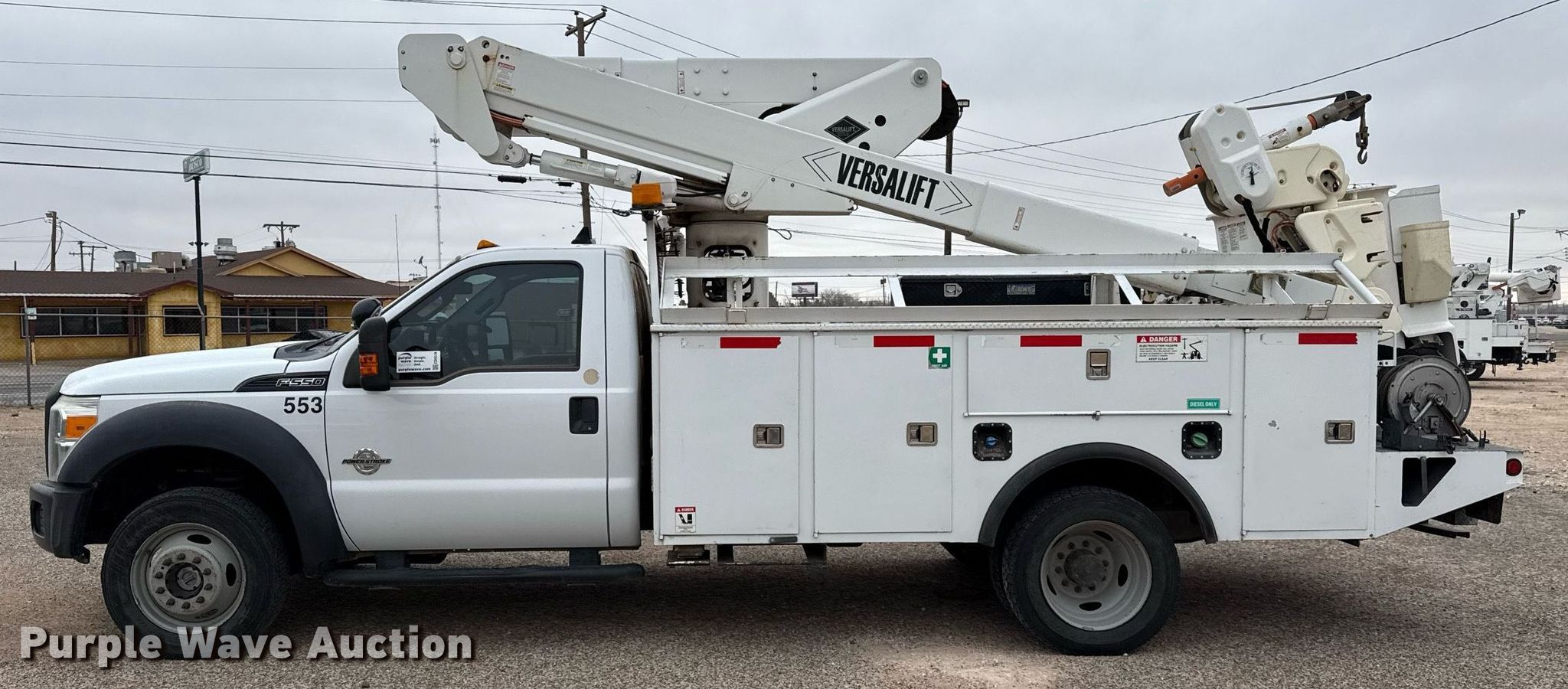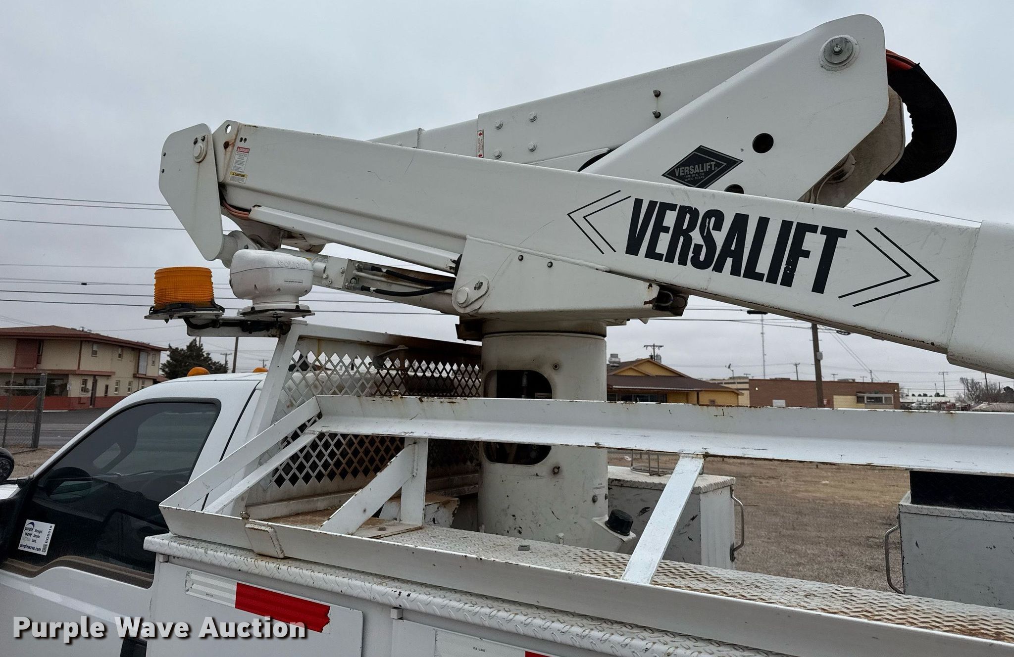 2016 Ford F550 Super Duty XL bucket truck. Miles: 217,598 on odometer, VIN: 1FDUF5HT4GEC75116. Engine Displacement: 6.7L V8 OHV, Cylinders: 8, Fuel type: Diesel. Transmission Automatic. Chassis Four wheel drive, Axles: Single, Suspension: Spring, Brakes: Hydraulic, PTO, Wet kit, GVWR: 19,500 lbs, Wheelbase: 165". Interior AC, Heat, Heated mirrors, Power windows, Power locks, Cruise control, Auxiliary controls, Brake controller. Features Bed Dakota Bodies 132-SB, Serial: DB24773, 13' 6" L x 94" W, Boom Versalift VST-40I, Serial: KW160177, Maximum lift capacity: 600 lbs, Maximum lift height: 40', Boom type: Articulating, Insulated, Telescopic, Man basket, Boom controls Ground, Platform/ basket, Material handler. Tires Size: 225/70R19.5. Notes Dash warning indicator: Check engine, Dead battery. Texas title. Title distribution may be delayed up to 30 days from verification of funds. Lamesa, TX 79331
