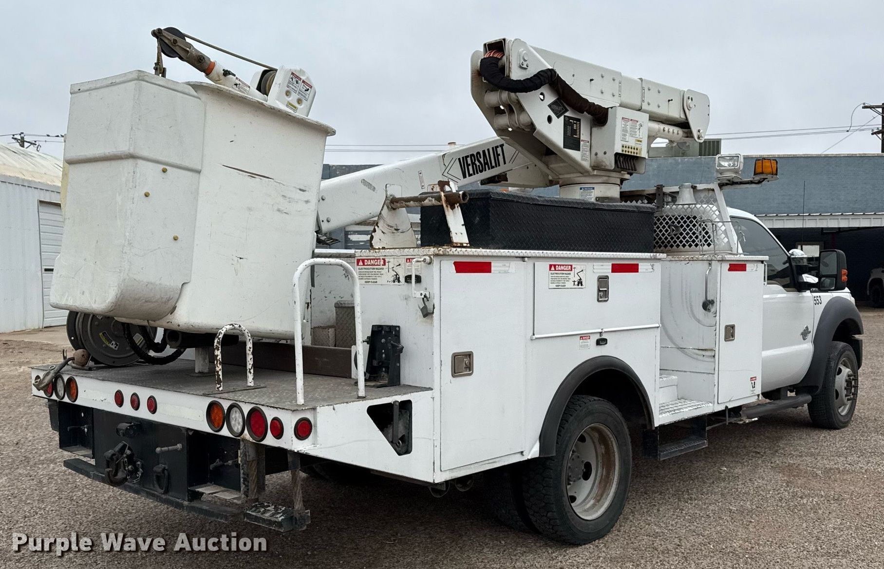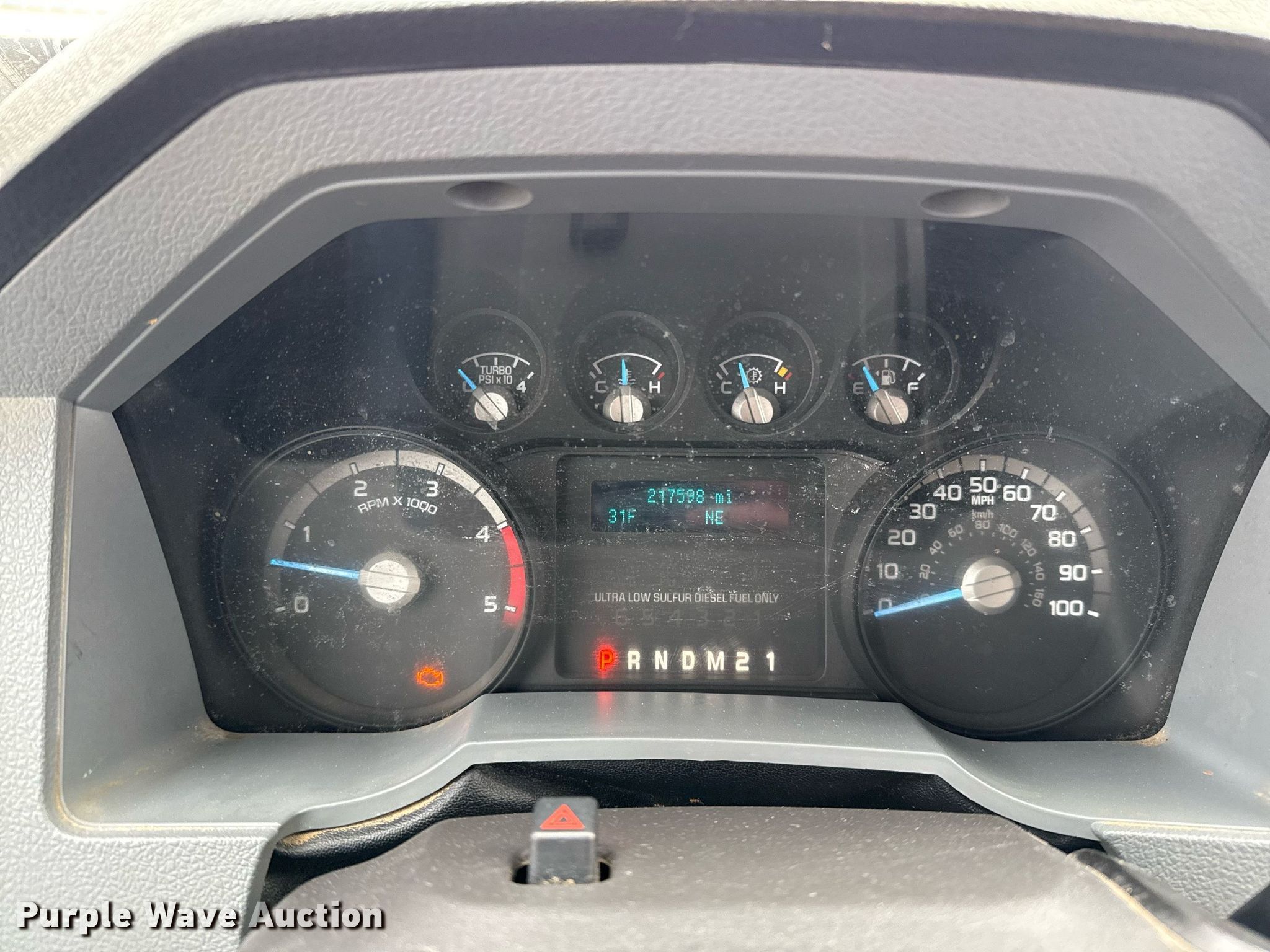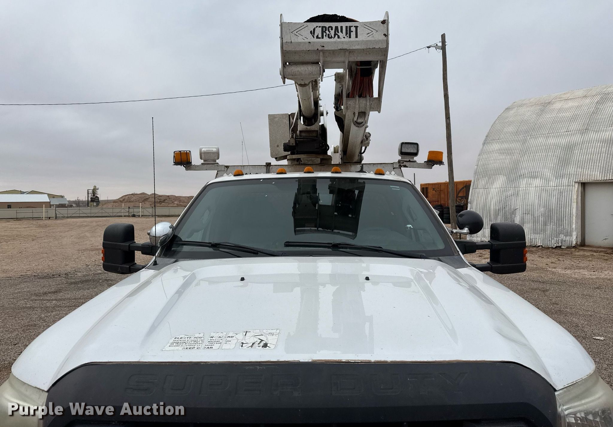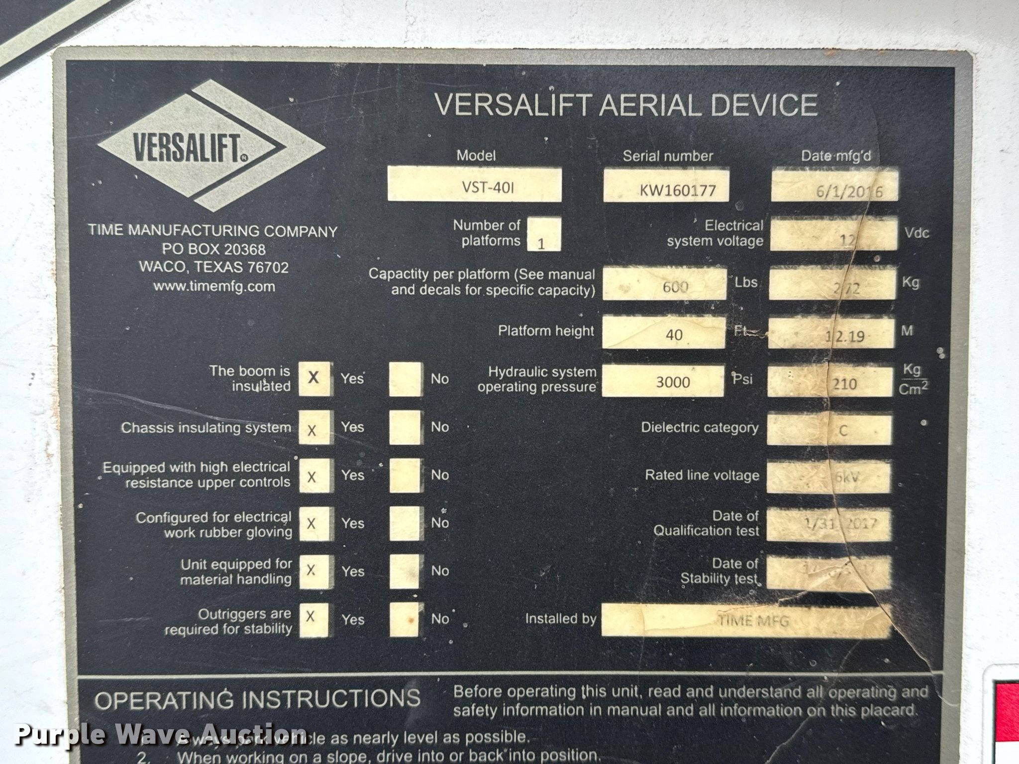 2016 Ford F550 Super Duty XL bucket truck. Miles: 217,598 on odometer, VIN: 1FDUF5HT4GEC75116. Engine Displacement: 6.7L V8 OHV, Cylinders: 8, Fuel type: Diesel. Transmission Automatic. Chassis Four wheel drive, Axles: Single, Suspension: Spring, Brakes: Hydraulic, PTO, Wet kit, GVWR: 19,500 lbs, Wheelbase: 165". Interior AC, Heat, Heated mirrors, Power windows, Power locks, Cruise control, Auxiliary controls, Brake controller. Features Bed Dakota Bodies 132-SB, Serial: DB24773, 13' 6" L x 94" W, Boom Versalift VST-40I, Serial: KW160177, Maximum lift capacity: 600 lbs, Maximum lift height: 40', Boom type: Articulating, Insulated, Telescopic, Man basket, Boom controls Ground, Platform/ basket, Material handler. Tires Size: 225/70R19.5. Notes Dash warning indicator: Check engine, Dead battery. Texas title. Title distribution may be delayed up to 30 days from verification of funds. Lamesa, TX 79331