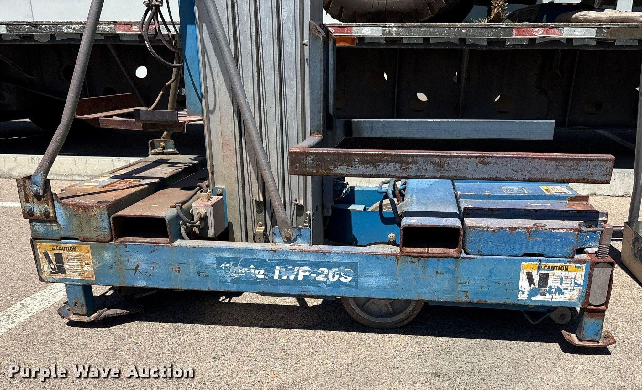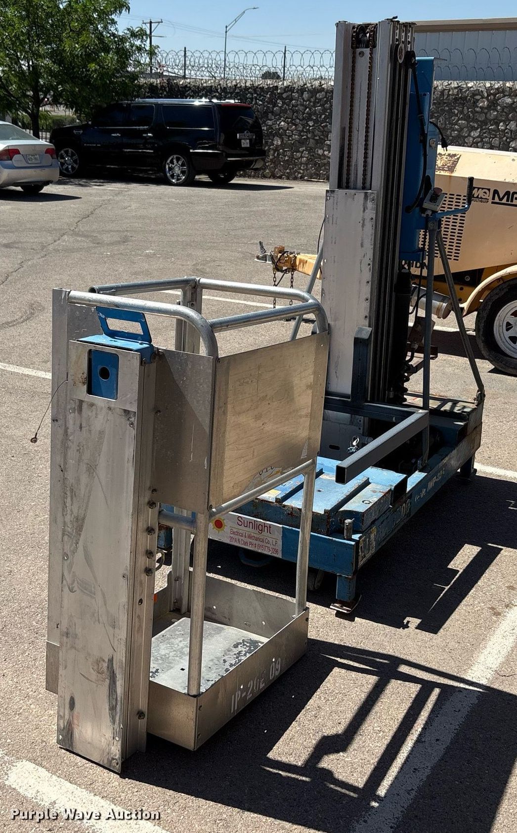 2001 Genie IWP 20S DC vertical lift. Serial: 4001-3932. Electric motor Volts: 110. Features Maximum lift capacity: 300 lbs, Maximum lift height: 20', Platform: 26" L x 20" W, Controls: Remote Control, Ground, Platform extensions: Manual. Notes Battery missing, Basket removed but included, Unknown operating condition. All items must be removed by June 10, 2025. Sunlight Electric & Mechanical Co.. El Paso, TX 79915