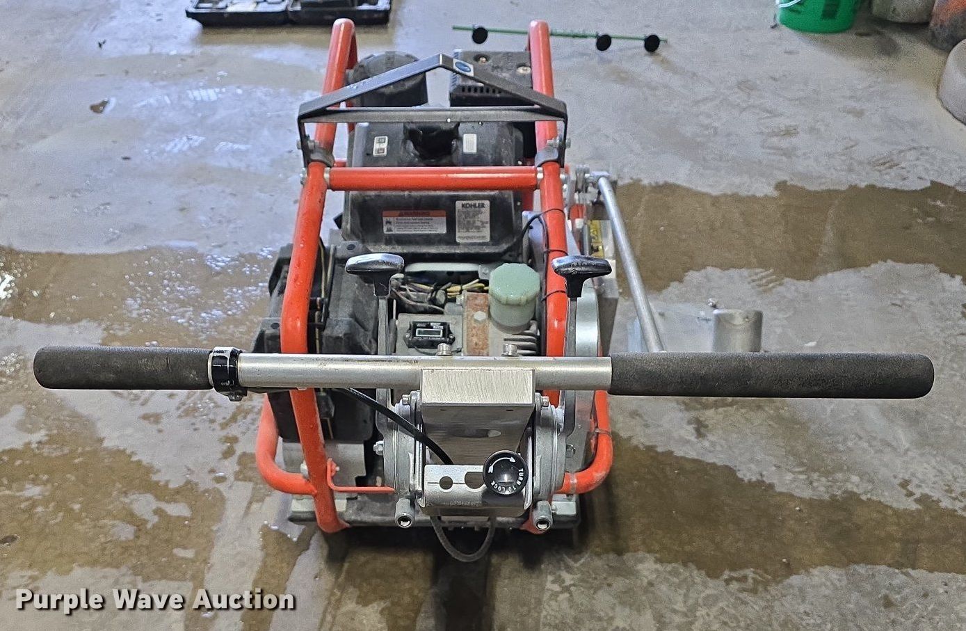 2022 Husqvarna Soff-Cut 2000 concrete saw. Hours: 23 on meter, Serial: 1397290004. Engine Kohler CH396, Serial: 5202804758, Displacement: 277cc, Cylinders: 1, Fuel type: Gas. Features Blade capacity: 10" diameter, Dust collector. Tires Solid. Caliber Concrete. Adair, IA 50002