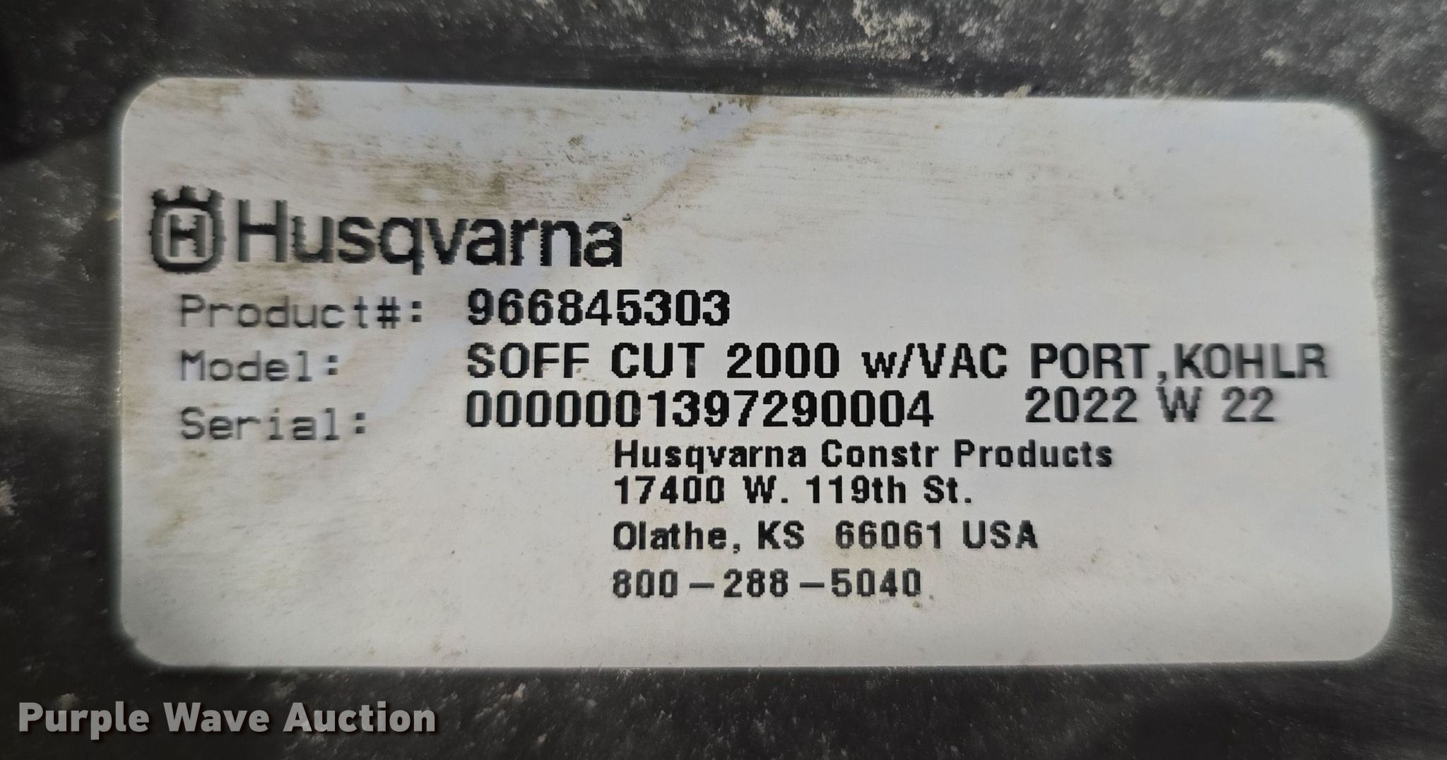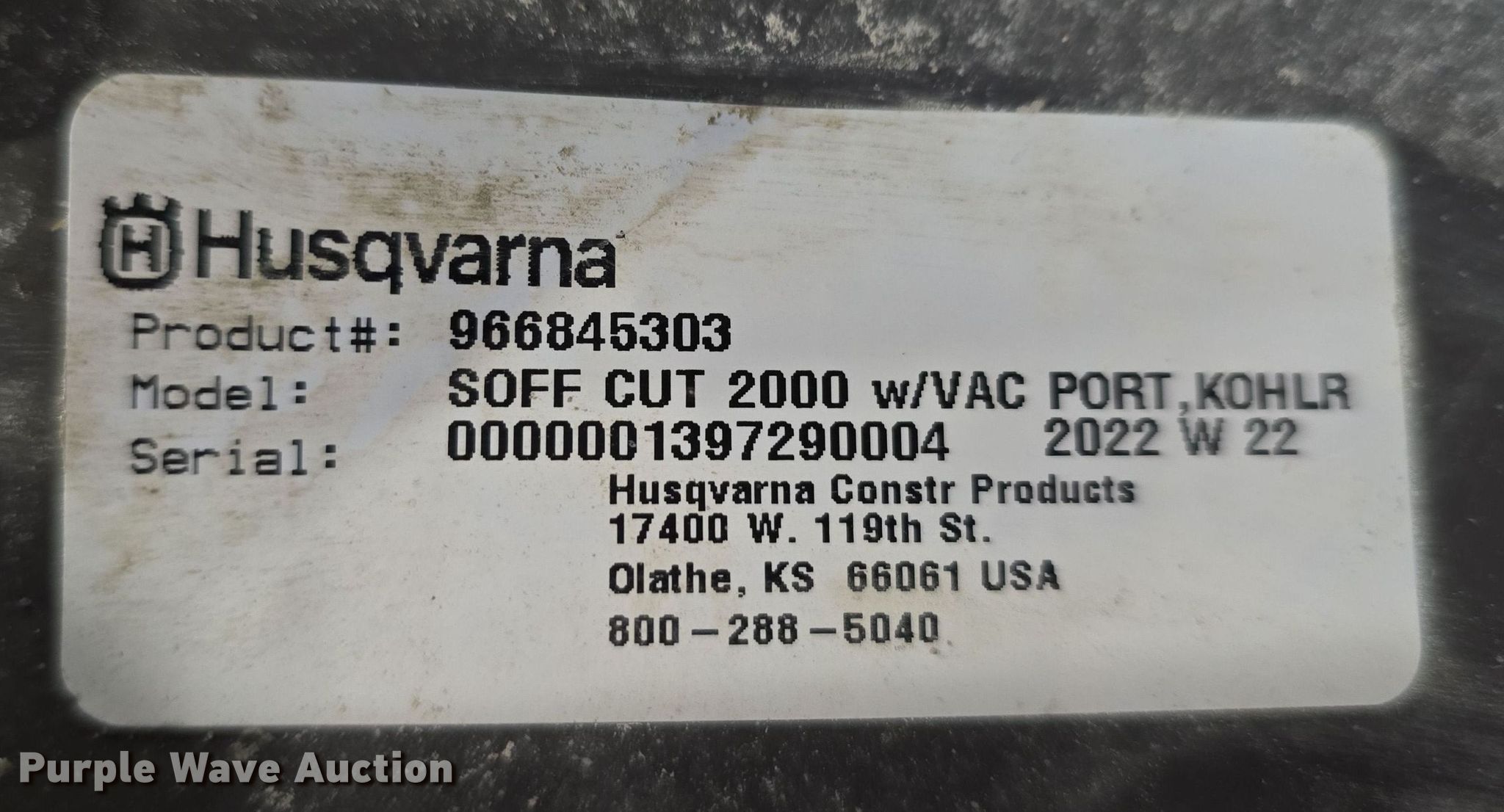 Purple Wave is selling a used Concrete Equip. or Acces. in Iowa. This item is a 2022 Husqvarna Soff-Cut 2000 concrete saw with the following: Hours: 23 on meter, Serial: 1397290004