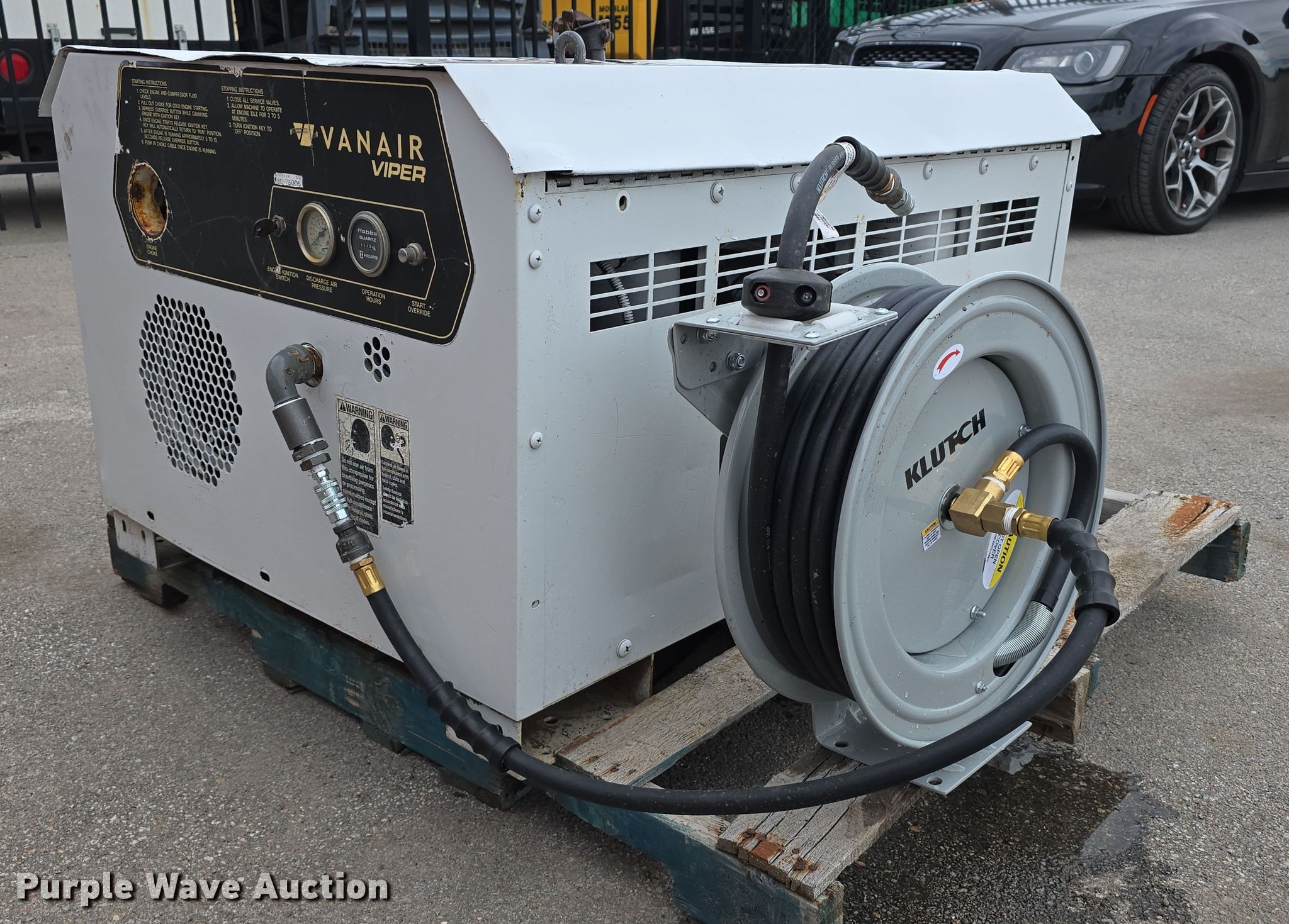 Vanair 80 Viper air compressor. Hours: 1,729 on meter, Serial: 30-78006. Engine Kohler, Cylinders: 2, Fuel type: Gas. Features Generator Skid mounted, Air compressor CFM: 80, PSI: 100, Hose reel, Hose. Jordan Machinery/ S & N Auto Sales. Waterloo, NE 68069
