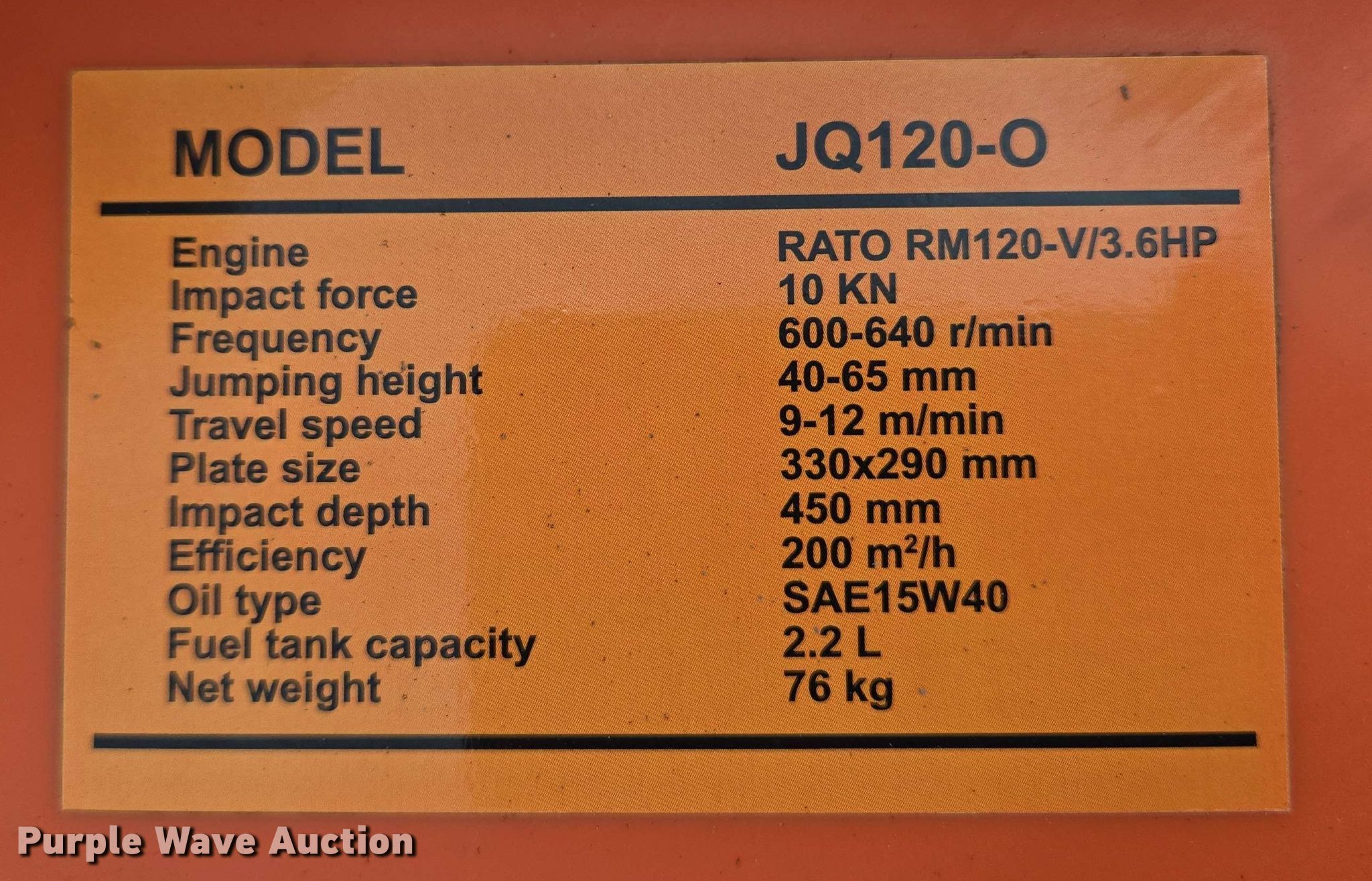 (2) JQ-Power JQ120-0 plate compactor. Engine. RATO RM120-V, Cylinders: 1, Fuel type: Gas, HP: 3.6. Features Plate: 12" L x 11" W, Owners manual, Parts kit. Notes Unused. Jordan Machinery/ S & N Auto Sales. Waterloo, NE 68069