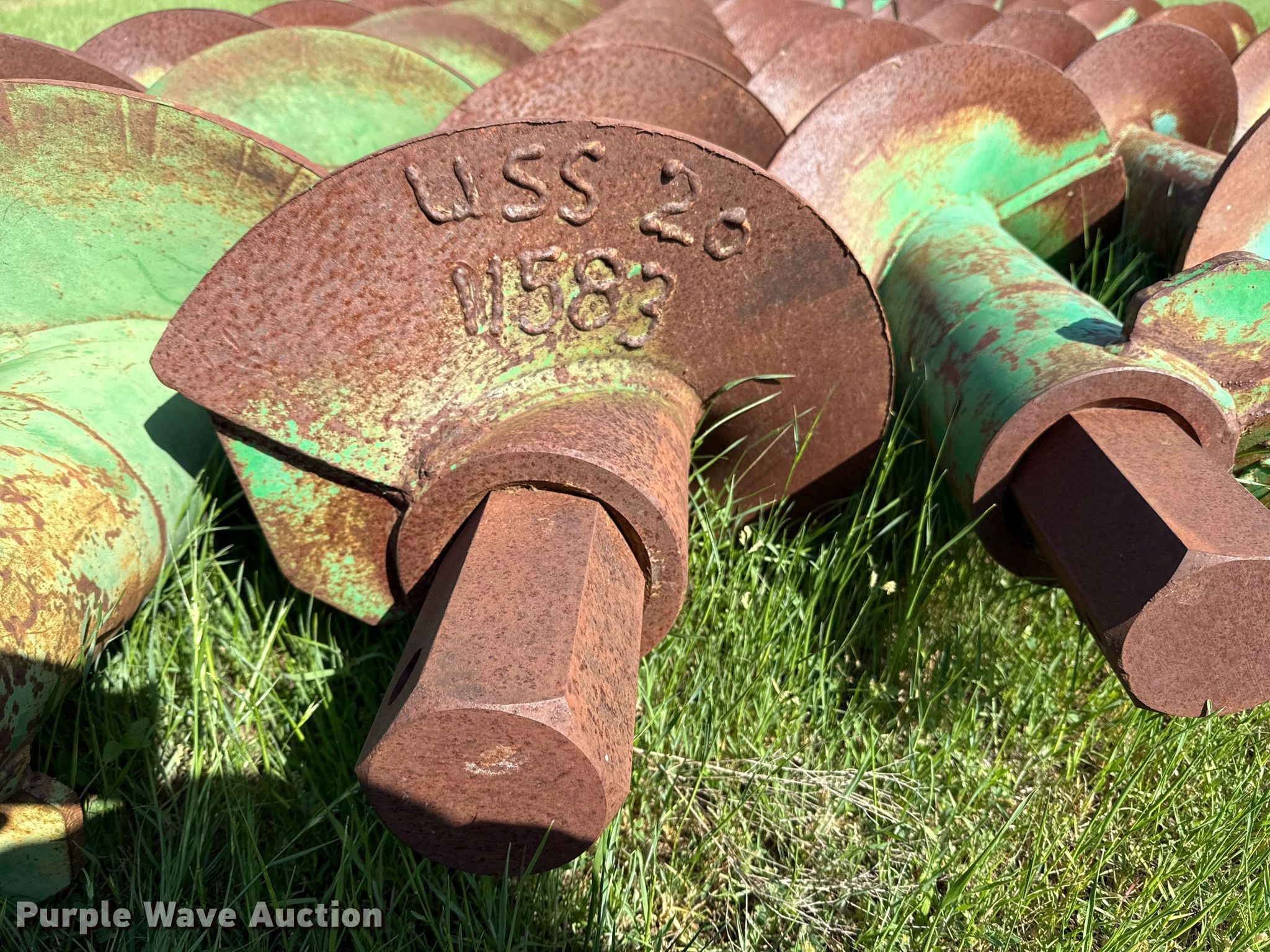 Purple Wave is selling a used Auger or Drill in Texas. This item is a (14) auger bits with the following: Length: 10', Diameter: 20", Cutting head, Width: 20", Teeth: Rock
