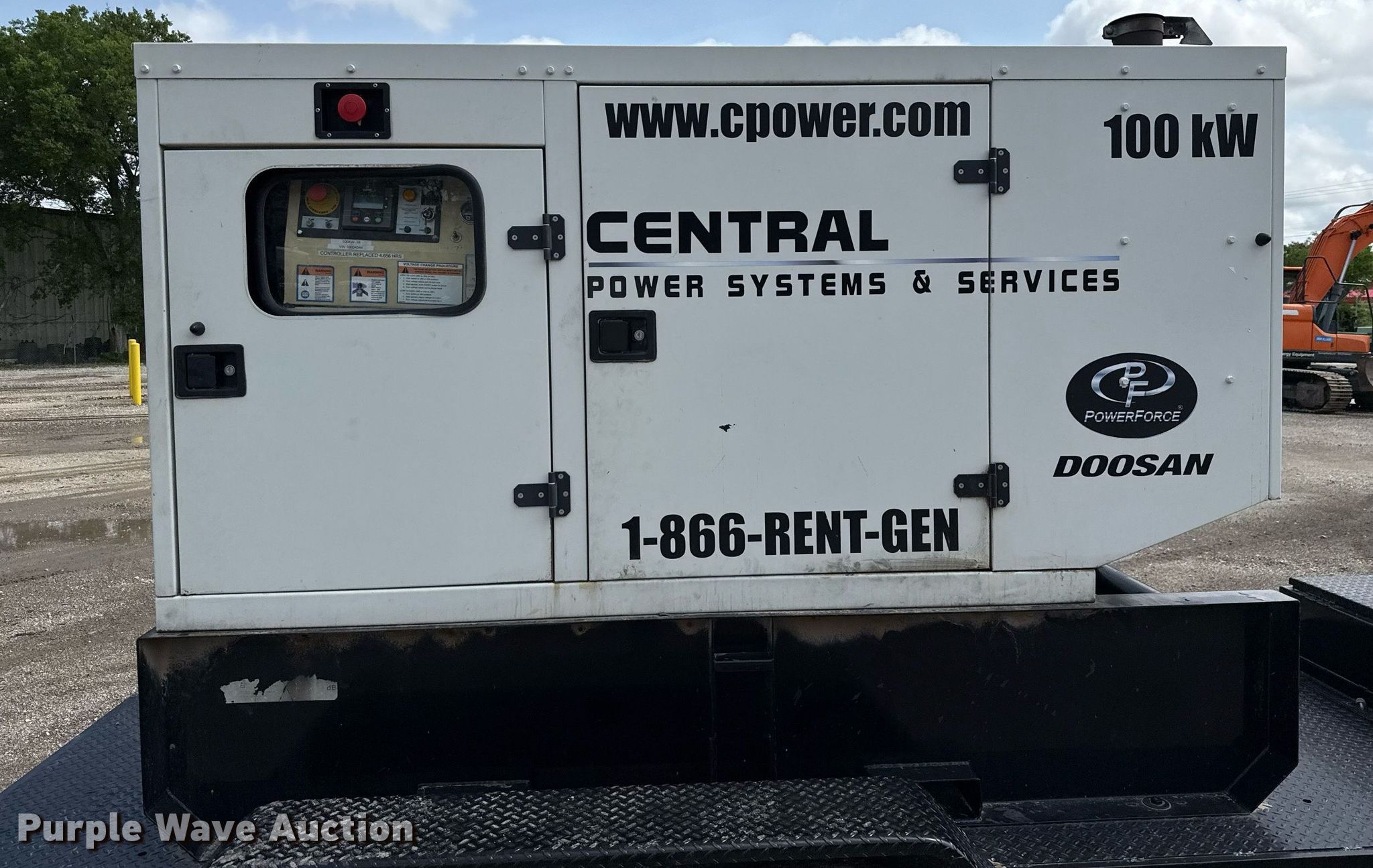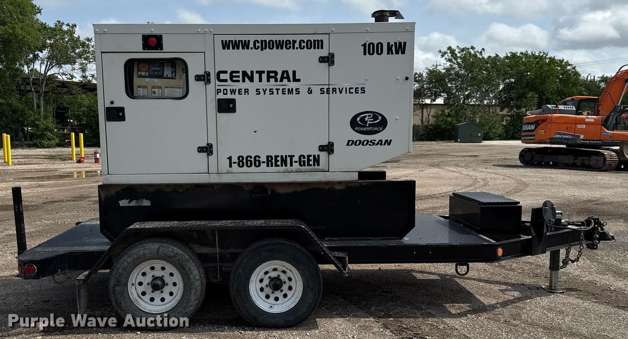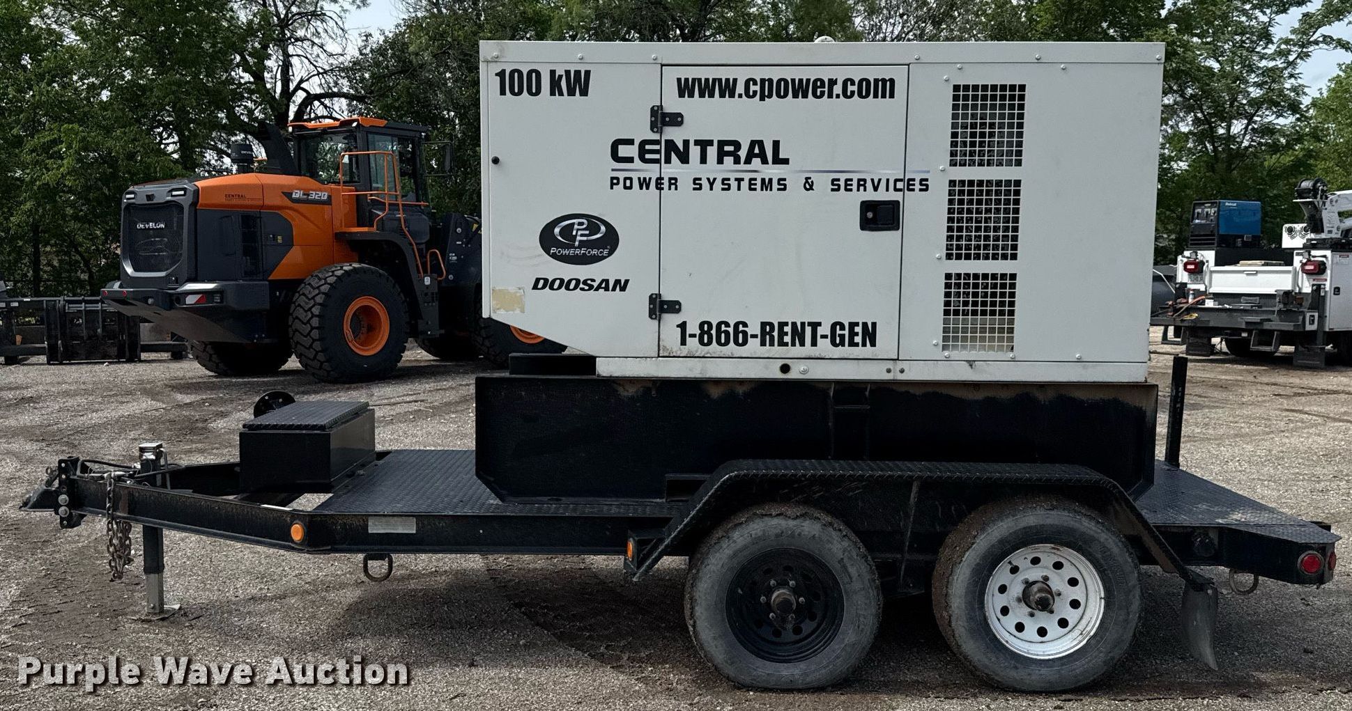 2010 Doosan generator. Hours: 585 on meter Actual hours unknown. Engine John Deere 4045, Displacement: 4.5L, Cylinders: 4, Fuel type: Diesel, kW: 118. Features Generator kW: 100, Electric start, Fuel tank. Trailer 2011 Felling, 17' L x 79" W, Ball hitch size: 2 5/16", Suspension: Spring, Brakes: Electric, Axles: Tandem, Tire size: 225/75R15, GVWR: 11,900 lbs, GAWR: 5,080 lbs. Notes Voltage issues, Hour meter replaced, Non-operational unit. Transfer of ownership documentation will be a bill of sale. Central Power Systems and Services. San Antonio, TX 78219