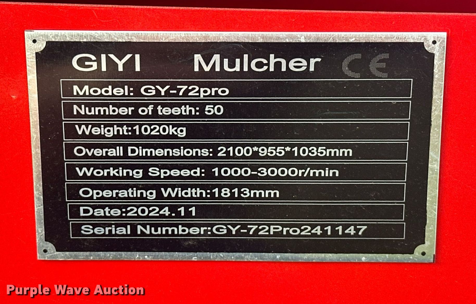 This 2024 GIYI GY-72pro skid steer mulcher will sell to the highest bidder regardless of price.