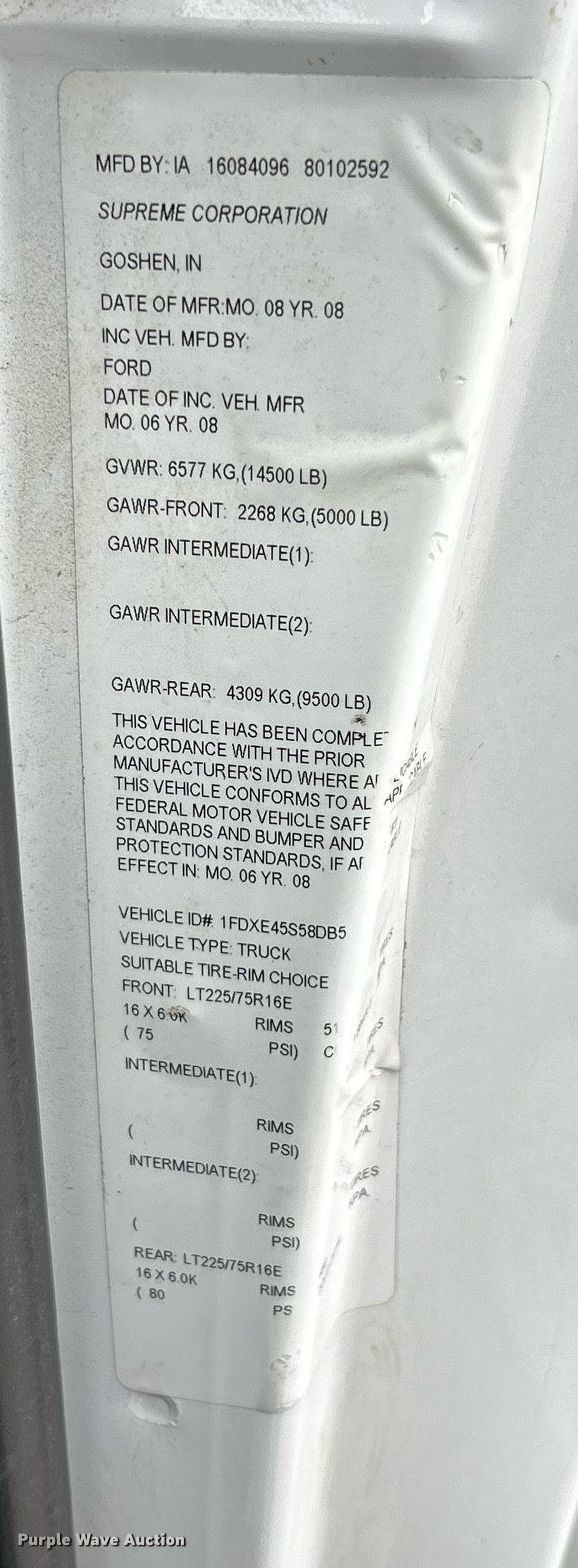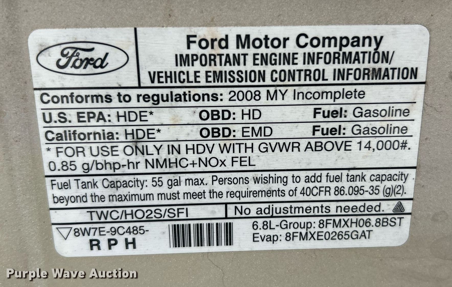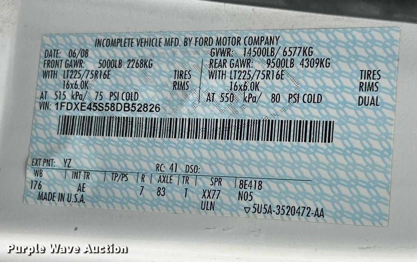 2008 Ford E450 Super Duty sewer inspection truck. Miles: 33,764 on odometer, VIN: 1FDXE45S58DB52826. Engine Displacement: 6.8L, Cylinders: 10, Fuel type: Gas. Transmission Automatic. Chassis Axles: Single, Suspension: Spring, Brakes: Hydraulic, GVWR: 14,500 lbs, Wheelbase: 176". Interior AC, Heat. Features Aries inspection system Reel, Winch, Master controller, Aries Pathfinder camera, Onan generator Hours: 2,991 on meter, Box bed Supreme Corp. 80102592, Serial: TA16084096, 16' L x 96" W x 90" H, Floor: Aluminum. Tires Size: 225/75R16. Missouri title. Seller is a Kansas licensed motor vehicle dealer. The buyer may be required to pay sales tax and/or registration fees to the dealer prior to taking possession. Title will be assigned and distributed by the dealer. Please contact the seller for distribution questions. Title distribution may be delayed up to 14 days from verification of funds. Key Equipment & Supply Co. Bridgeton, MO 63044