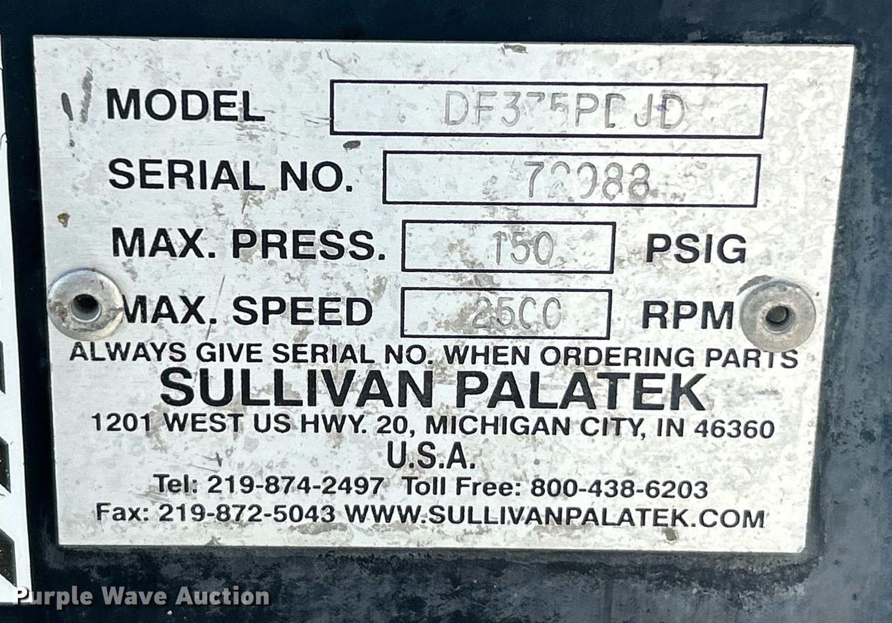 Purple Wave is selling a used Air Compressor in Missouri. This item is a Sullivan DF375PDJD air compressor with the following: Hours: 2,999 on meter, Serial: 72988