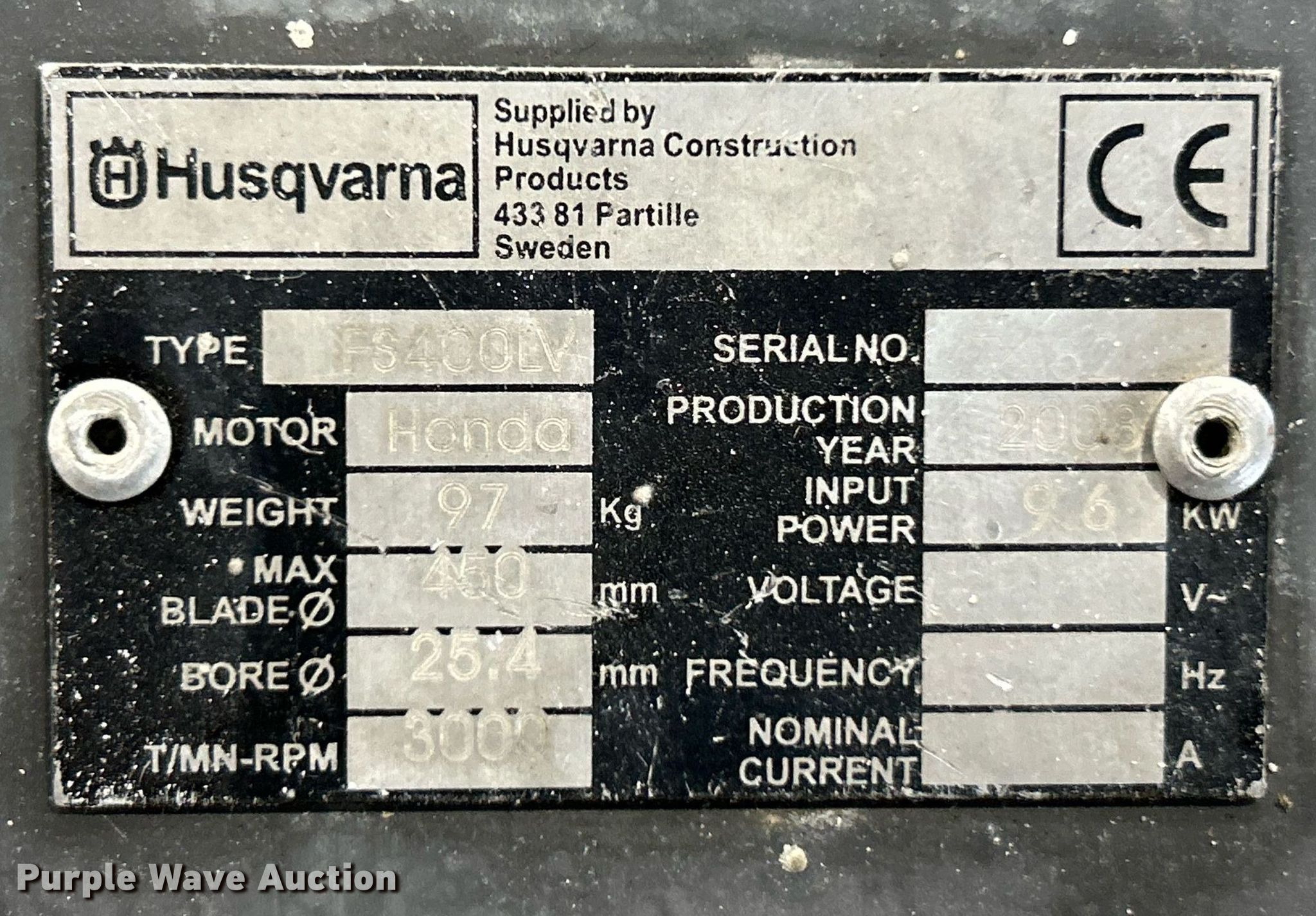 2008 Husqvarna FS400LV concrete saw. Engine. Honda, Displacement: 389 cc, Cylinders: 1, Fuel type: Gas. Features Blade diameter: 18". Concrete Strategies, LLC. Hazelwood, MO 63042