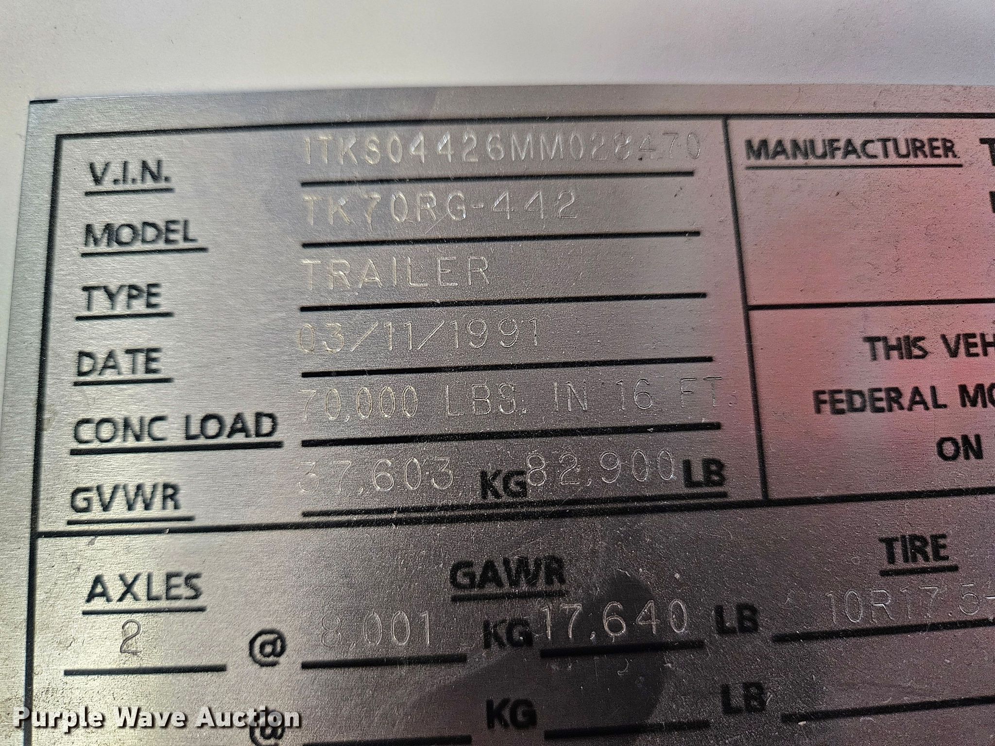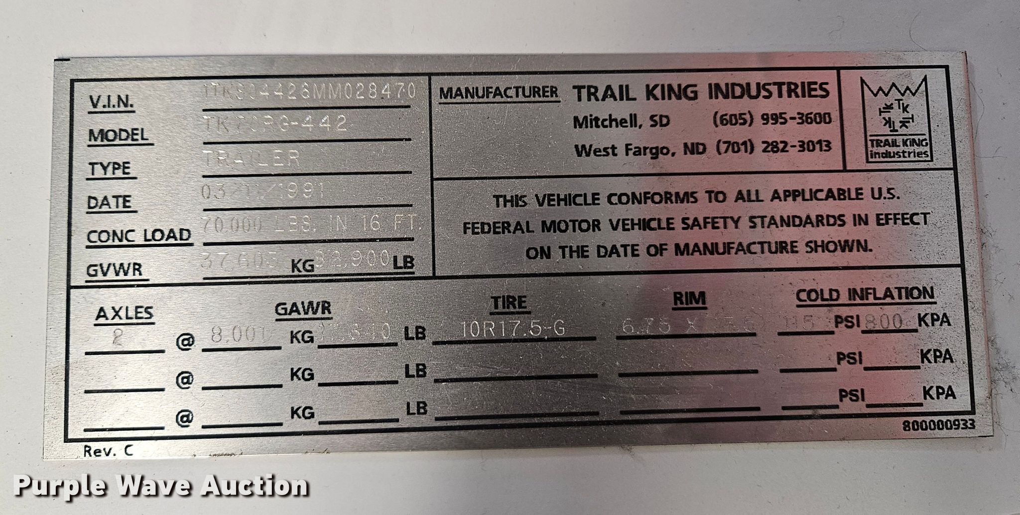 Purple Wave is selling a used Equip. Trailer in Iowa. This item is a 1991 Trail King drop deck equipment trailer with the following: VIN: 1TKS04426MM028470