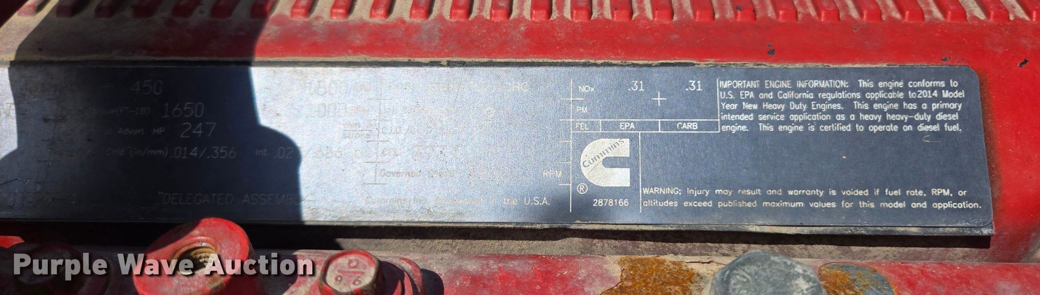 2012 Peterbilt 386 semi truck. Miles: 806,571 on odometer, Hours: 21,707 on meter, VIN: 1XPHD49XXCD153446. Engine Cummins ISX15, Serial: 79720633, Displacement: 15.0L, Cylinders: 6, Fuel type: Diesel, HP: 247, Engine brake. Transmission Automatic. Chassis Axles: Tandem, Differential lock: Inter-axle, Suspension: Air Dump valves, Brakes: Air, PTO, Wet kit, GVWR: 52,000 lbs FAWR: 13,000 lbs, IAWR: 20,000 lbs, RAWR: 20,000 lbs. Interior AC, Heat, Heated mirrors, Power windows, Cruise control, Air ride cab. Features Deck plate: Aluminum, Fifth wheel type: Fixed, Fuel tank: Single. Tires Size: 11R22.5. Notes Trailer not included, Dash warning indicator: Check engine, Traction control. Oklahoma title. Title distribution may be delayed up to 14 days from verification of funds. Nowco Construction, LLC. Marietta, OK 73448