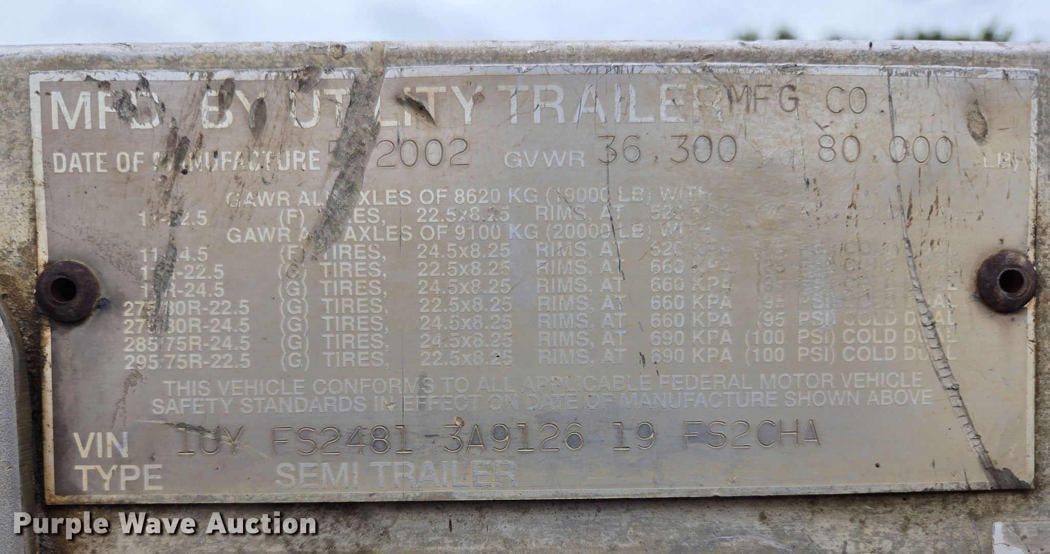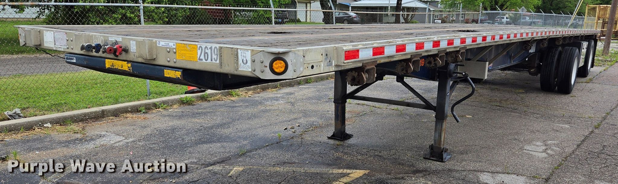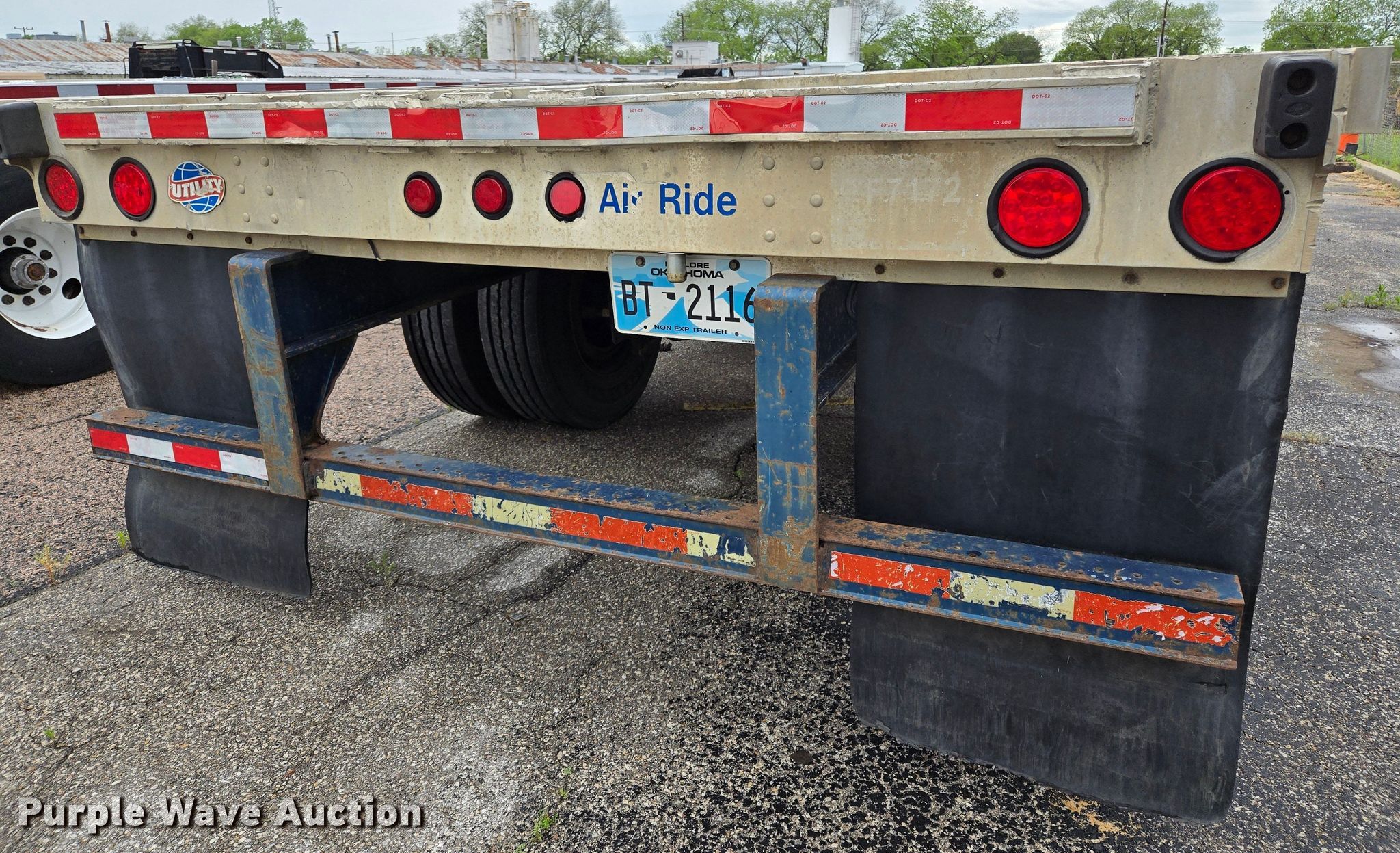 2003 Utility flatbed trailer. VIN: 1UYFS24813A912619. Dimensions Deck: 48' L x 102" W. Features Deck type: Wood. Chassis Landing gear: Dual, Suspension: Air, Brakes: Air, Axles: Spread, GVWR: 80,000 lbs. Tires Steel wheels, Size: 295/75R22.5. Notes Deck boards need replaced. Oklahoma title. Title distribution may be delayed up to 30 days from verification of funds. Nowco Construction, LLC. Marietta, OK 73448