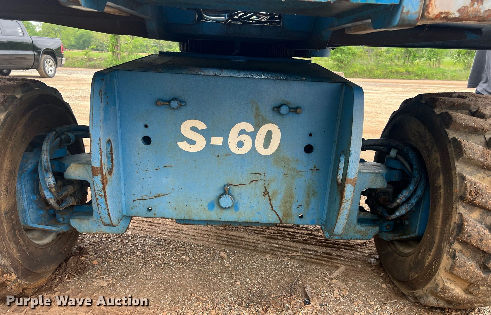 1999 Genie S60 boom lift. Hours: 5,534 on meter, Serial: 4684. Engine Deutz F4L, Cylinders: 4, Fuel type: Diesel. Chassis Four wheel drive. Features Rough terrain, Boom type: Telescopic, Maximum lift capacity: 500 lbs, Maximum lift height: 60', Hydraulic leveling, Platform: 92" L x 33" W, AC power outlet, Controls: Platform, Ground, Platform rotation: Hydraulic. Tires Tire size: 15-19.5, Foam filled. Dylan's Gravel. Atoka, OK 74525