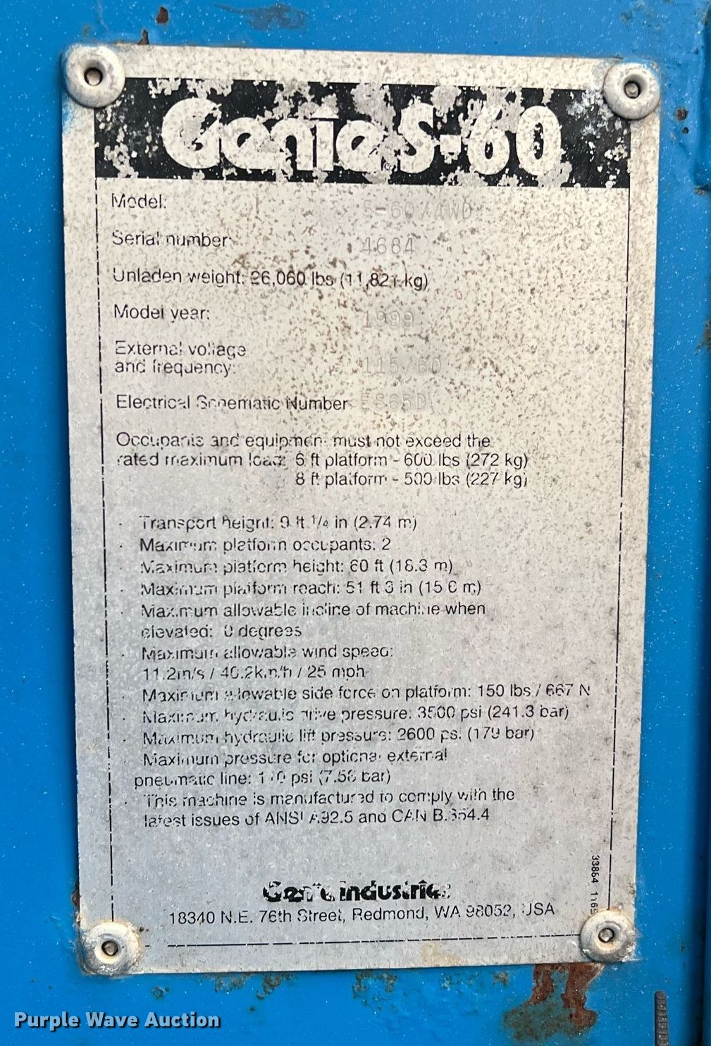 Purple Wave is selling a used Boom Lift in Oklahoma. This item is a 1999 Genie S60 boom lift with the following: Hours: 5,534 on meter, Serial: 4684