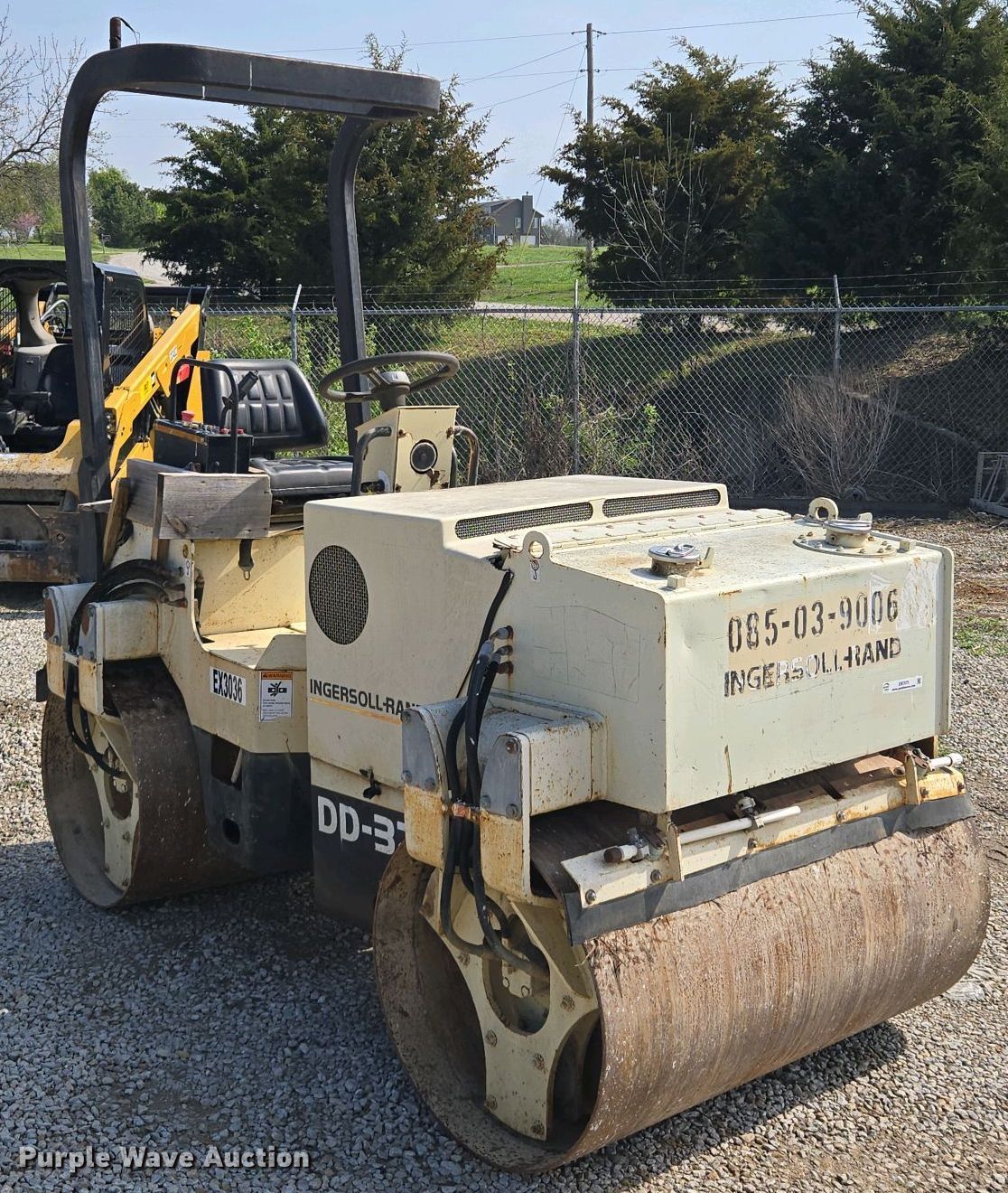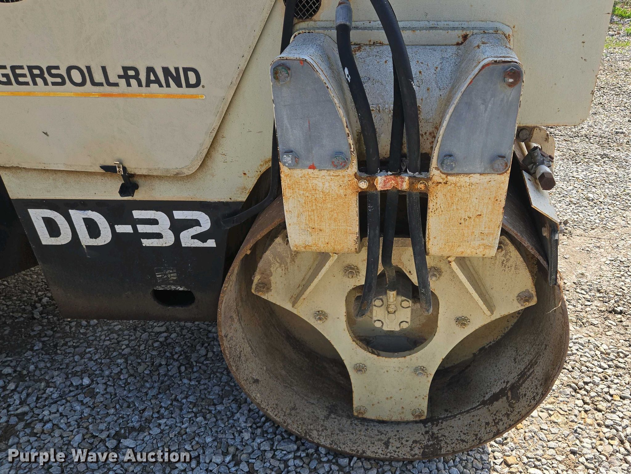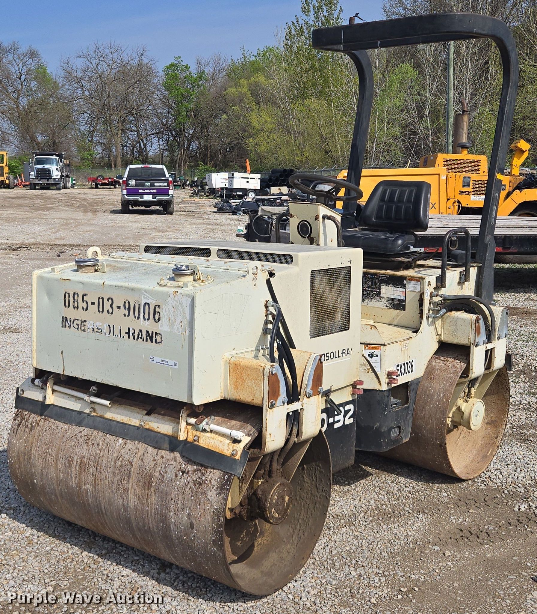 1987 Ingersoll Rand DD-32 double drum vibratory roller. Serial: 157562. Engine Deutz, Cylinders: 3, Fuel type: Diesel. Transmission Hydrostatic. Operators station OROPS. Features Drum: Smooth, Vibratory system: Double, Front drum Width: 52", Diameter: 28", Rear drum Width: 52", Diameter: 28", Drum scrapers: Front, Rear, Water spray applicator: Front, Rear. Notes Electrical issues, FNR switch. Precision Construction & Contracting, LLC. Holden, MO 64040